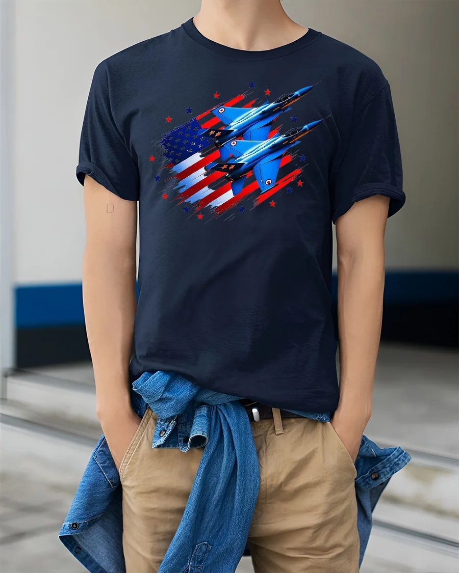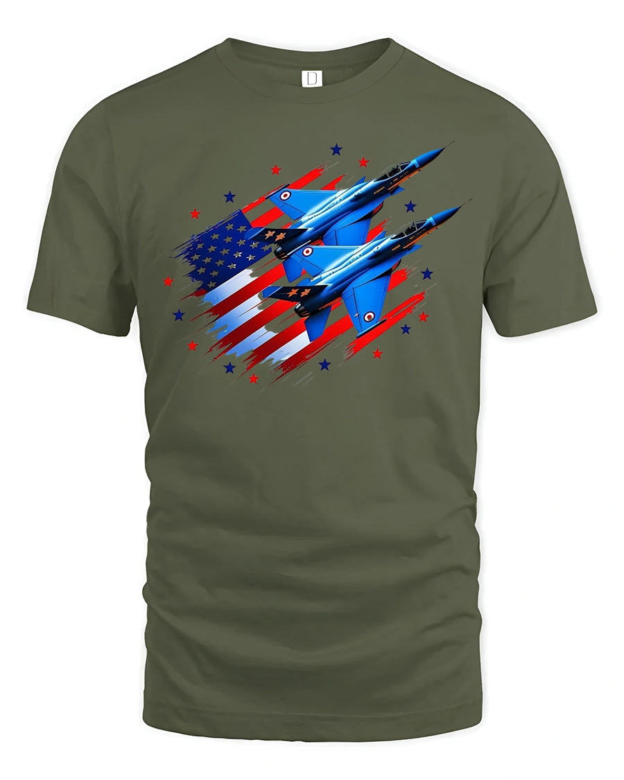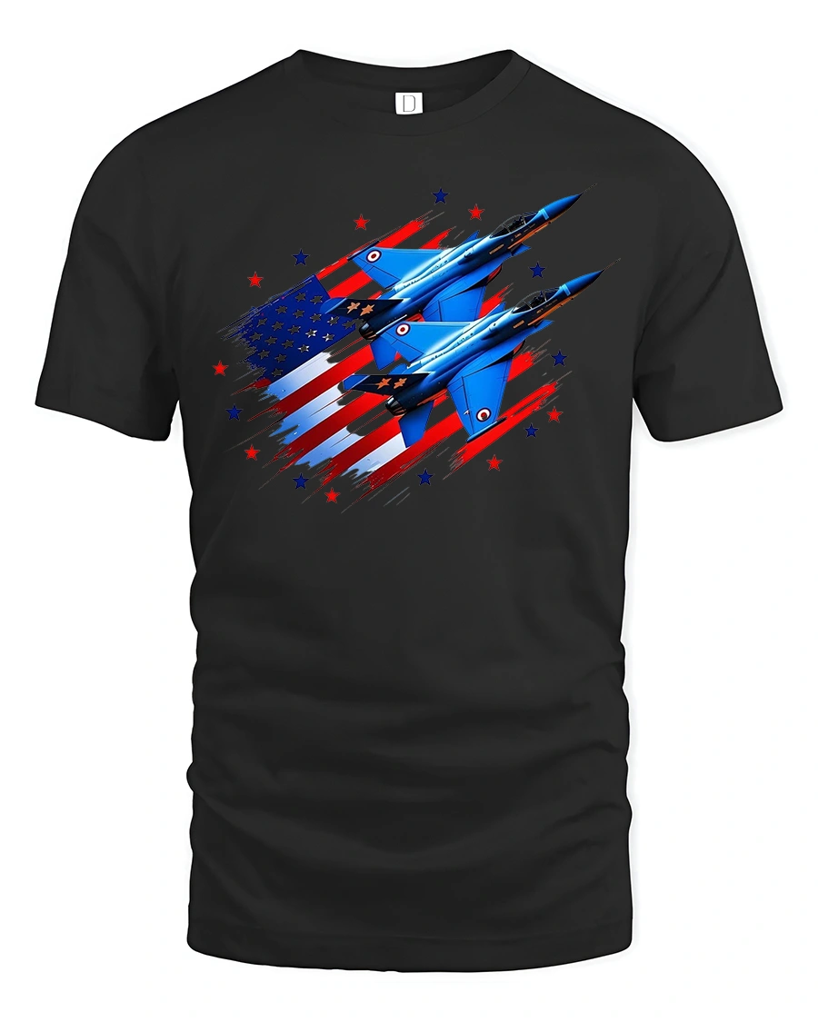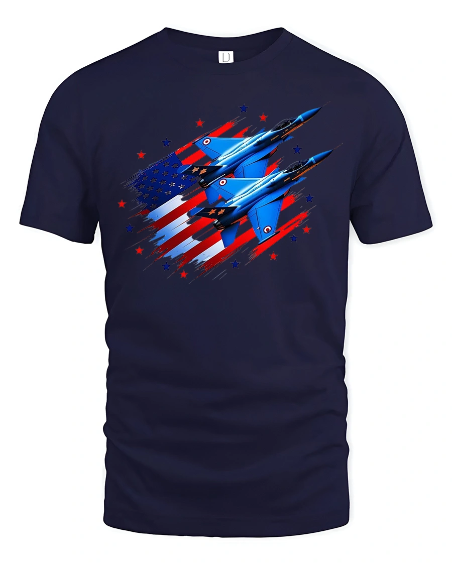 Featuring two sleek fighter jets soaring across a stylized American flag, this tee captures the pride, strength, and freedom of the skies.