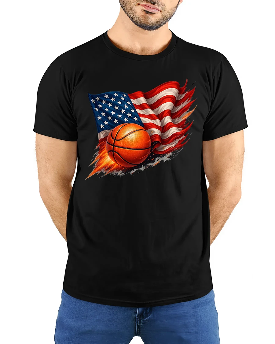 American Flag Basketball Fire USA Sports Pride T-Shirt blends the thrill of the game with bold American spirit.