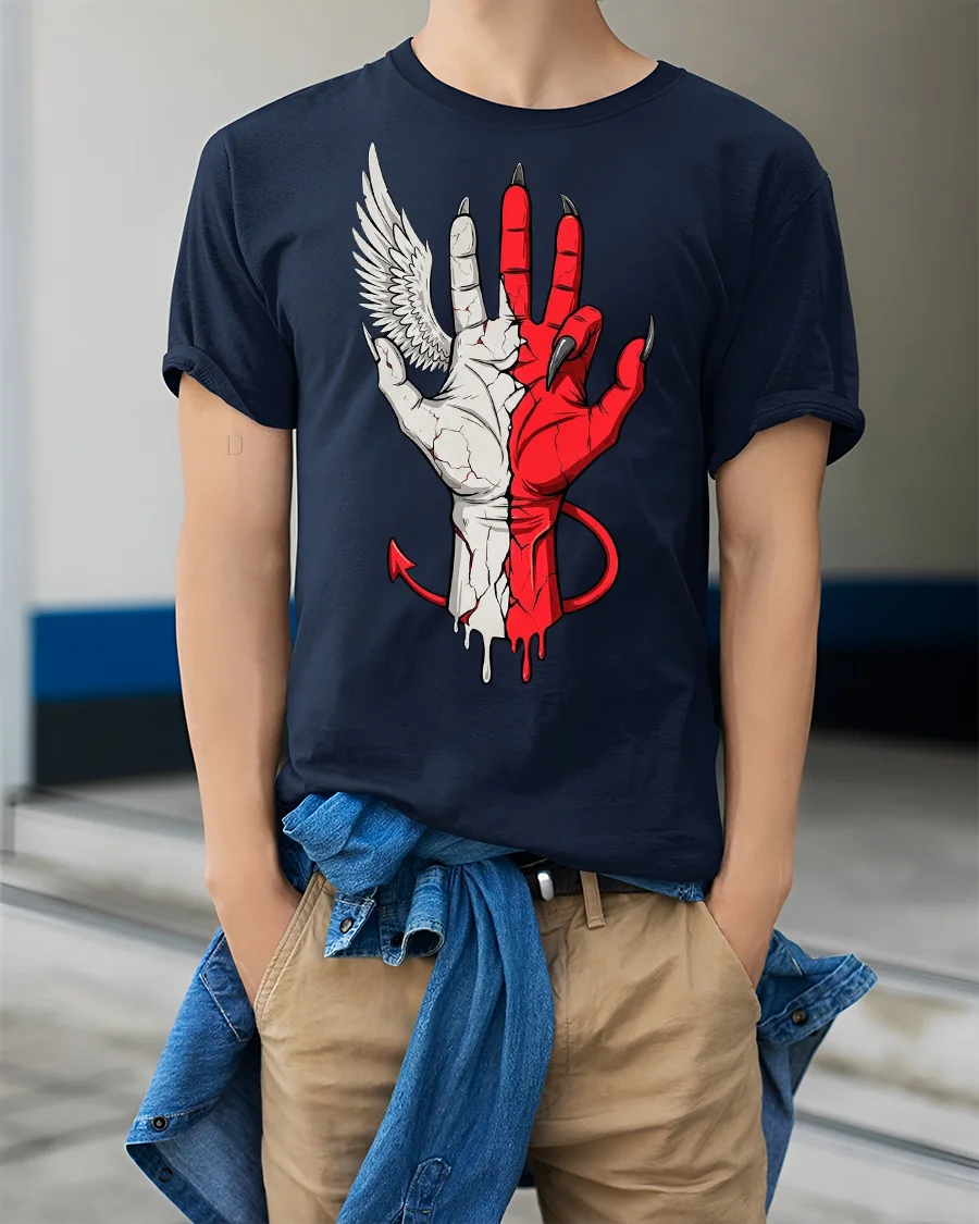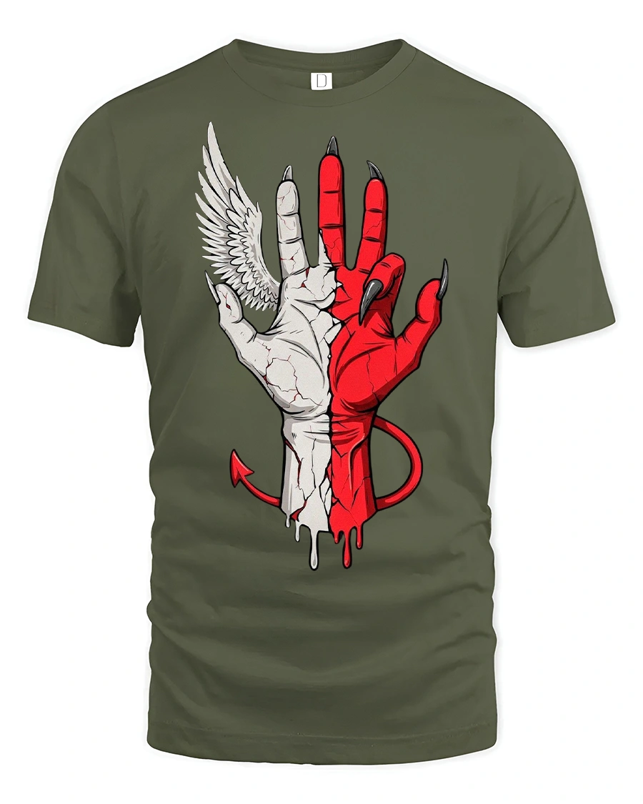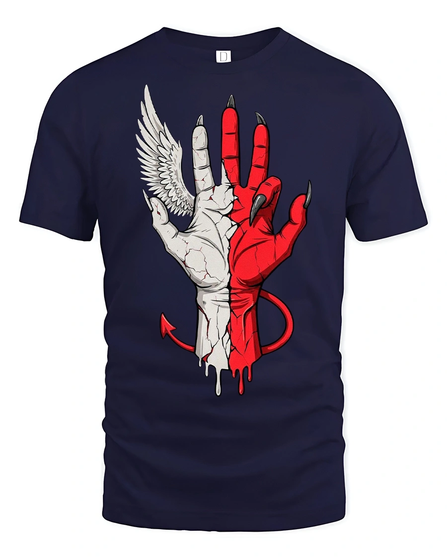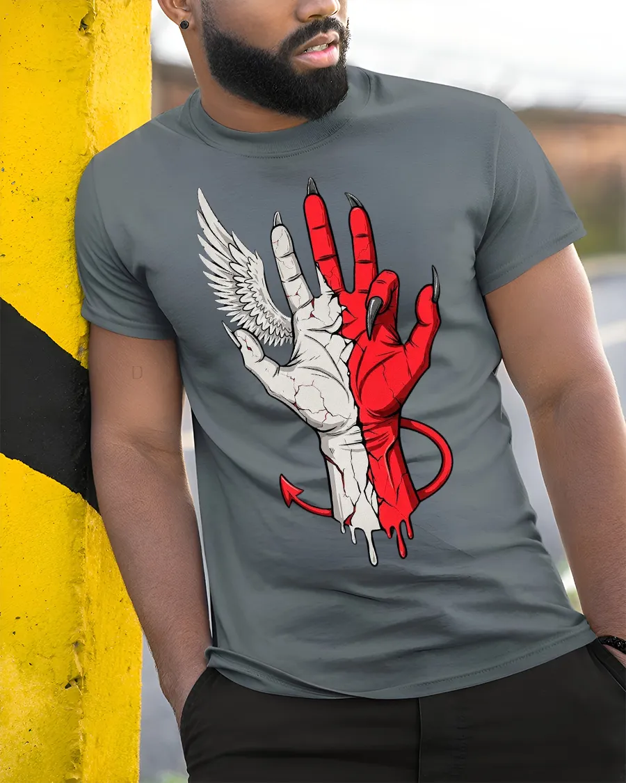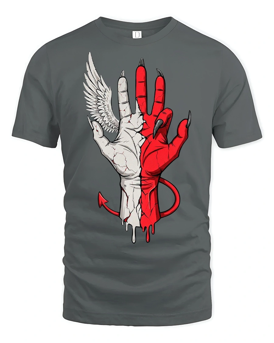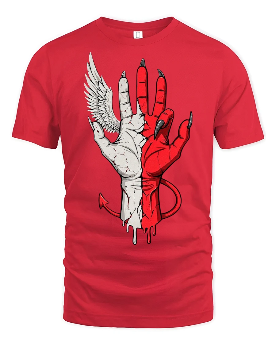 Make a statement with the Angel and Devil Hands Split Graphic T-Shirt, a bold design that perfectly captures the eternal battle between good and evil. Featuring one half as an angel’s white hand with wings and the other half as a devil’s red claw with a tail, this shirt brings duality to life in striking detail.