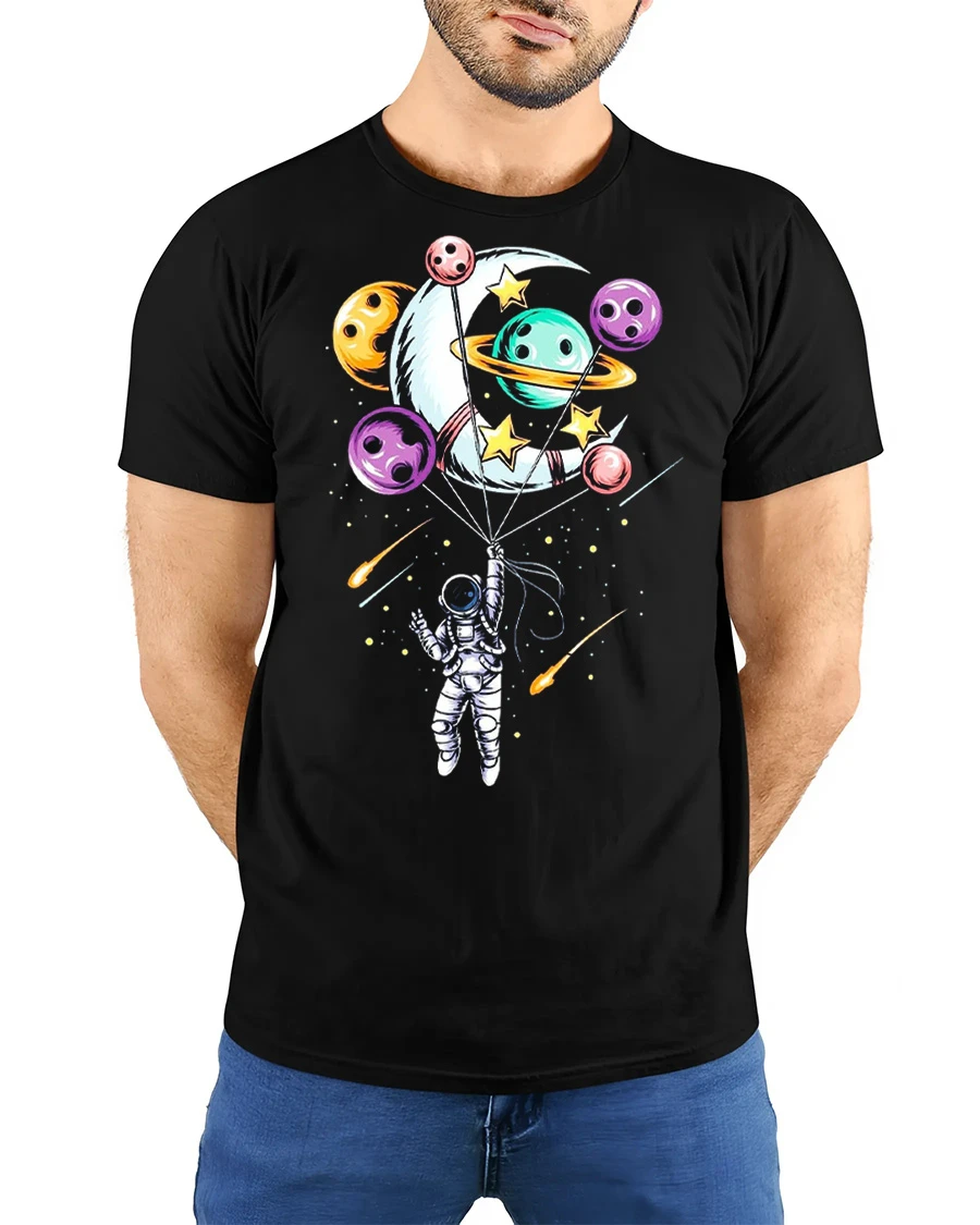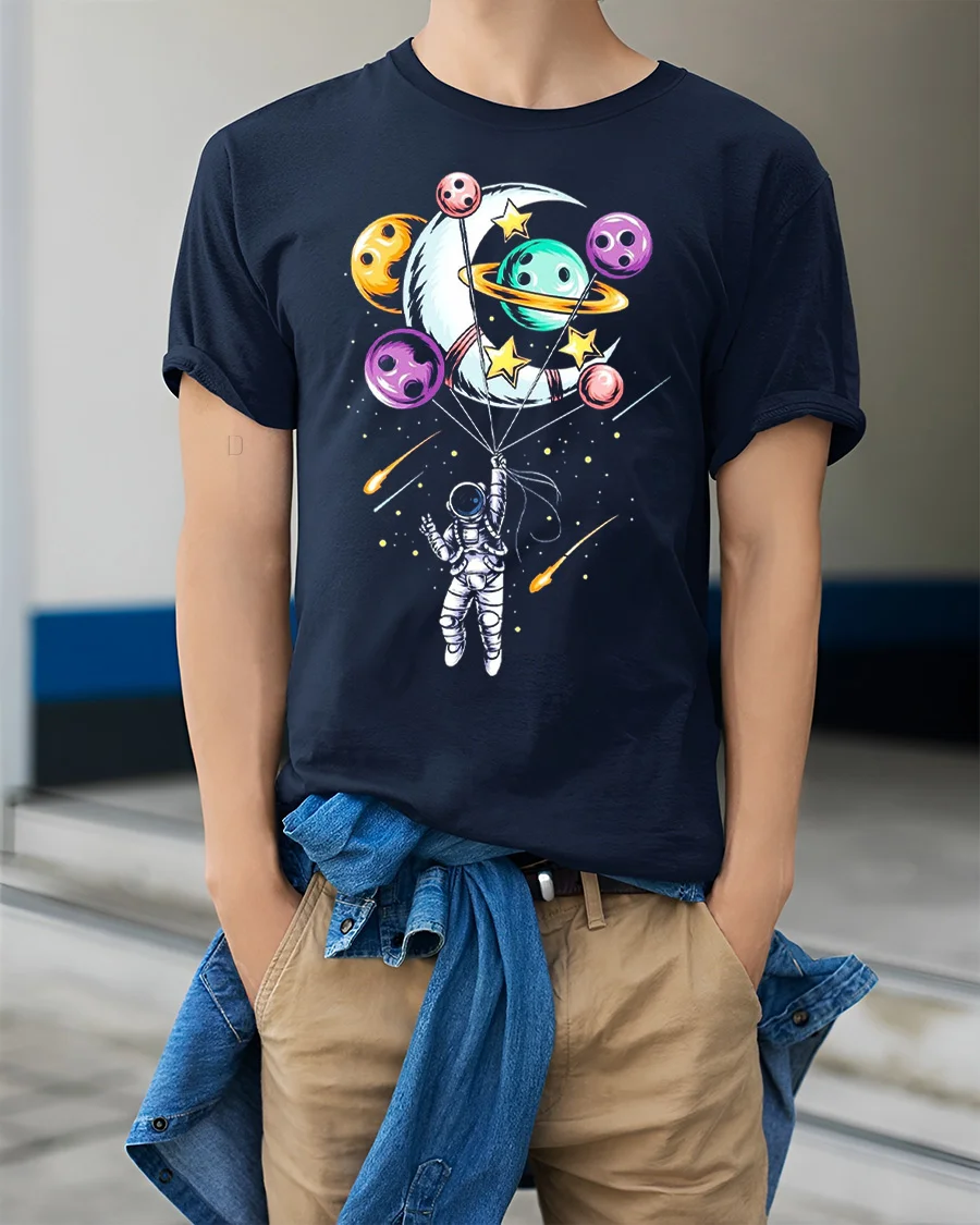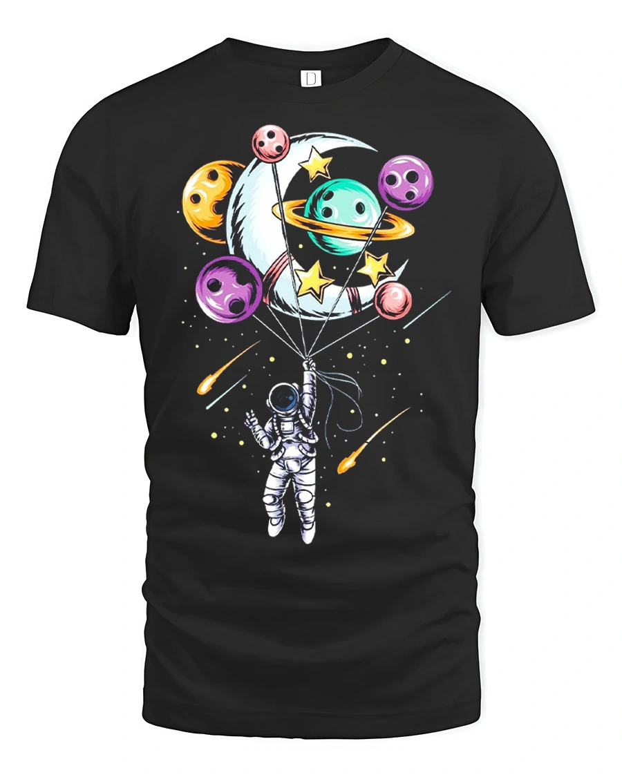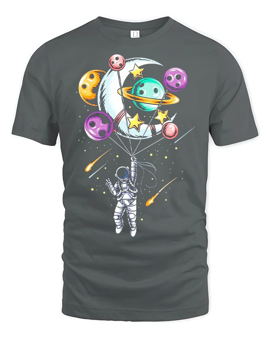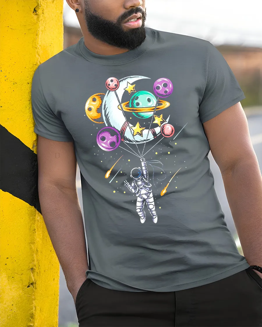 The Astronaut Balloon Planets Graphic Tee Cute Space Tshirt features a creative design of an astronaut floating in space while holding colorful planet balloons.