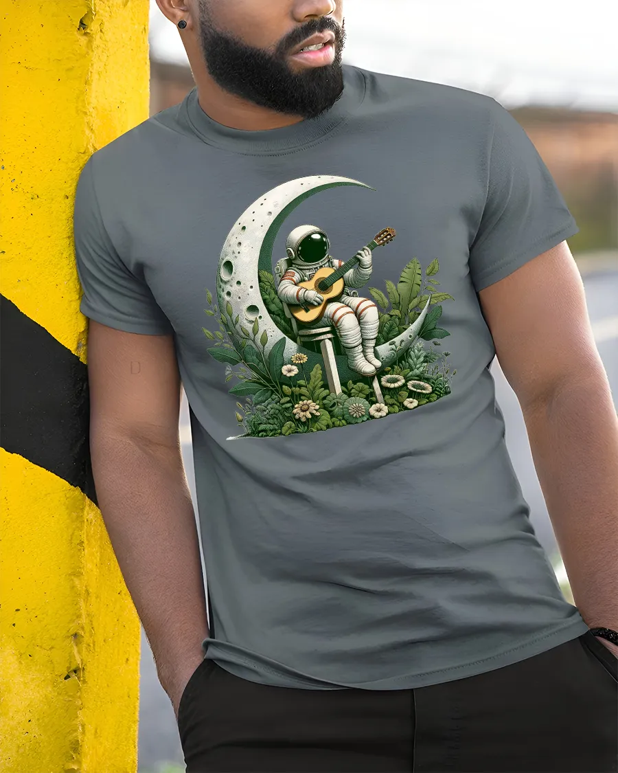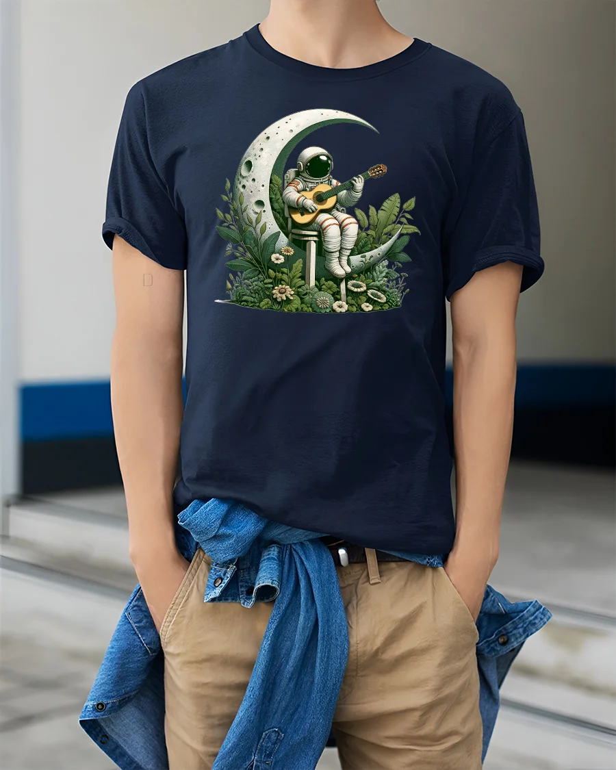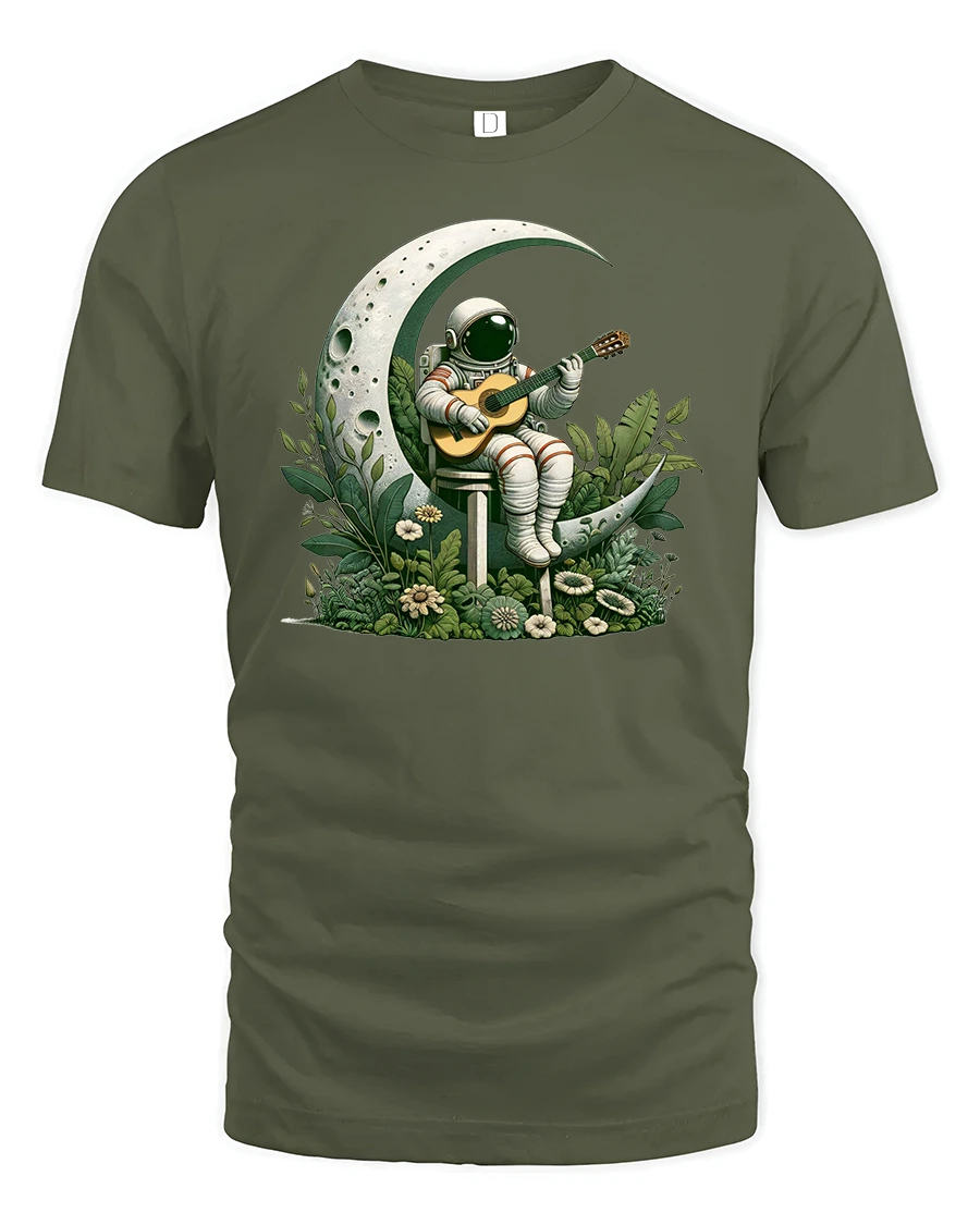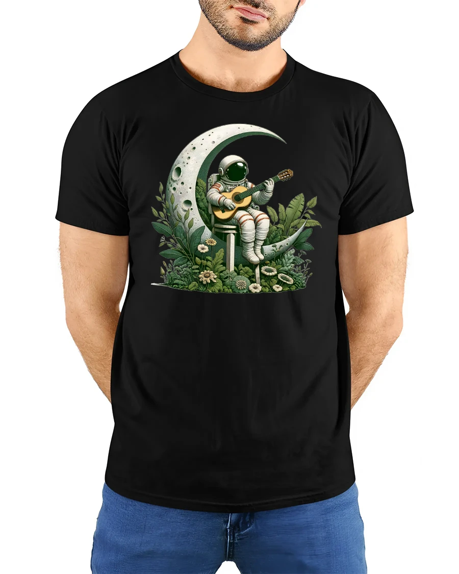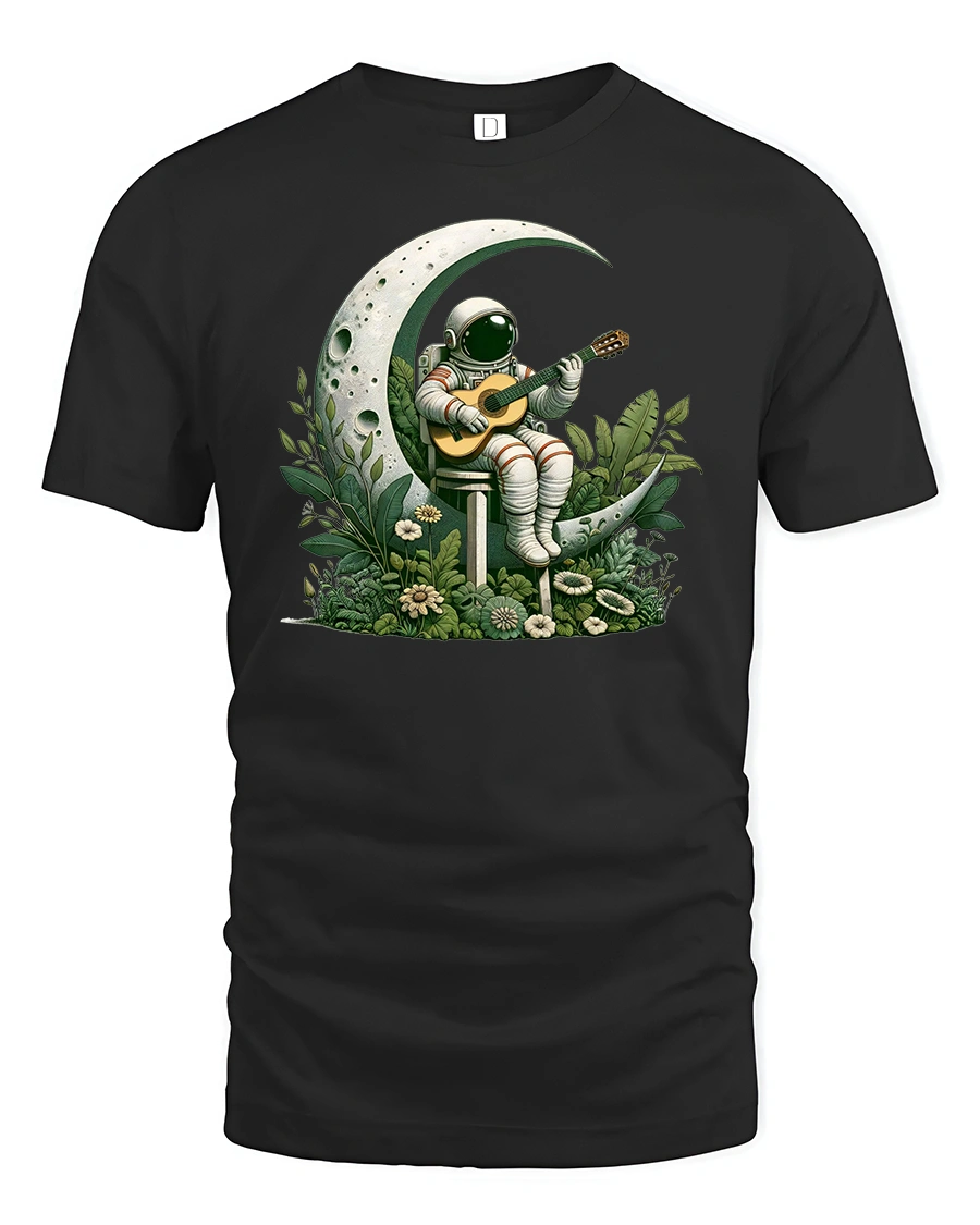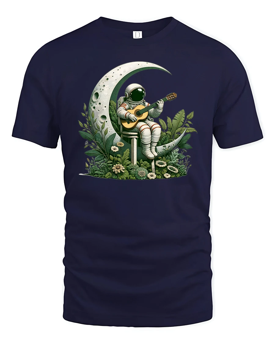 Featuring a peaceful astronaut sitting on a crescent moon while playing guitar, this tee captures the perfect harmony between music and the mysteries of space.