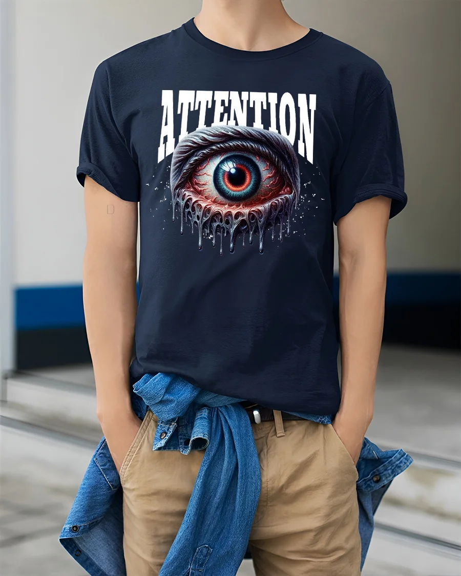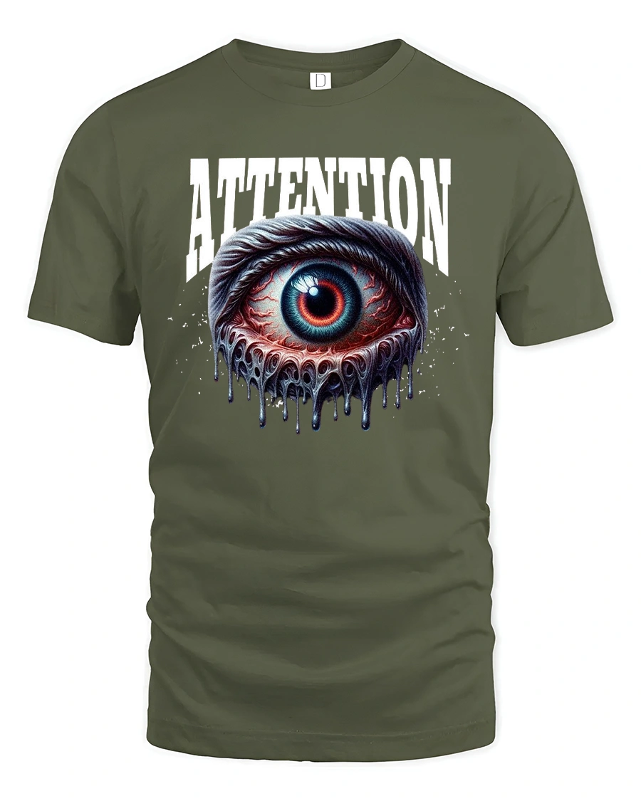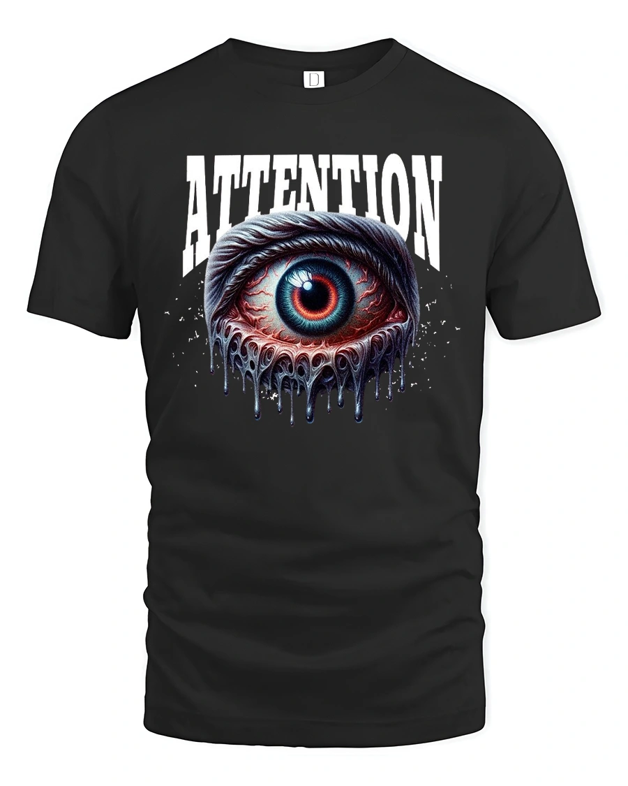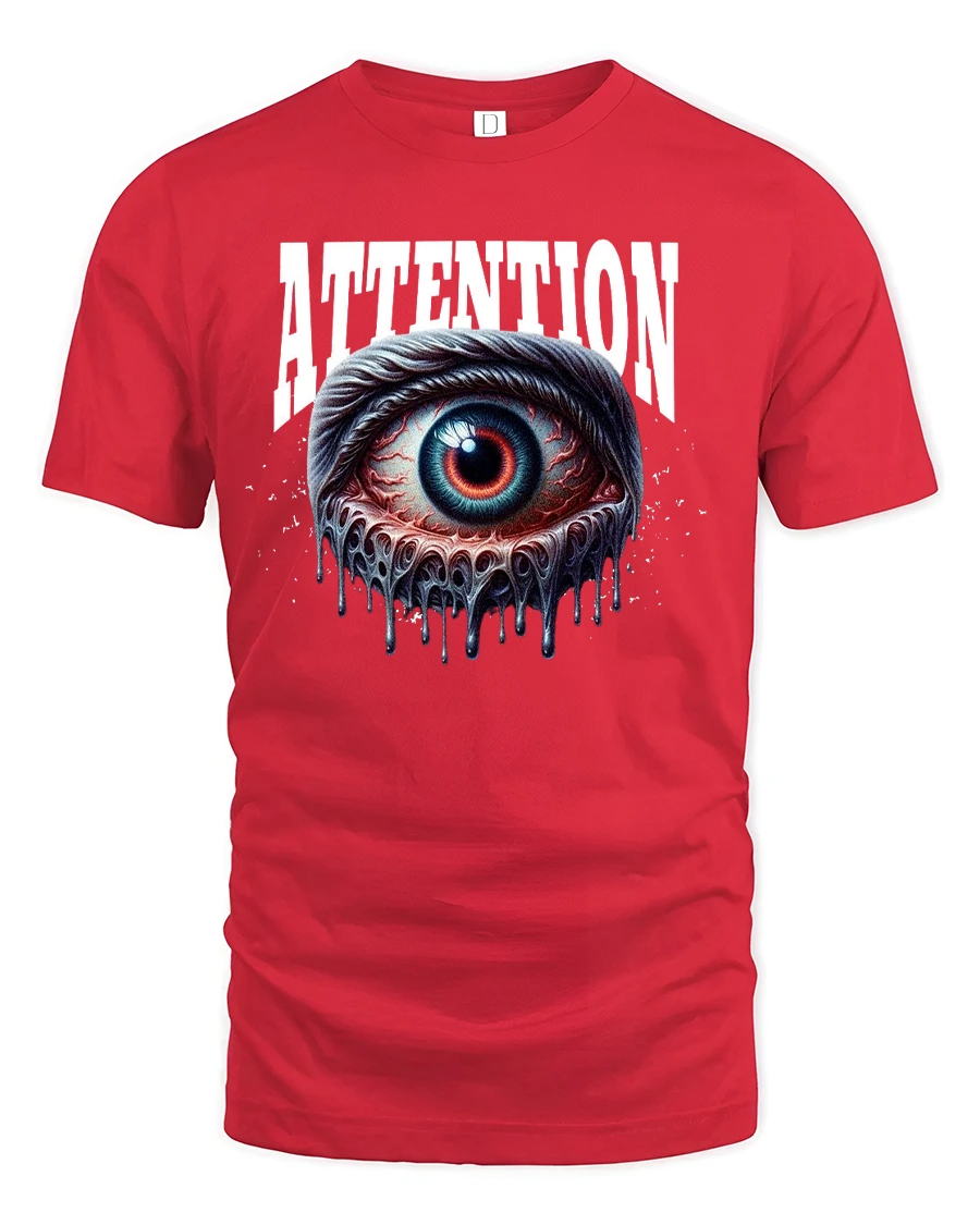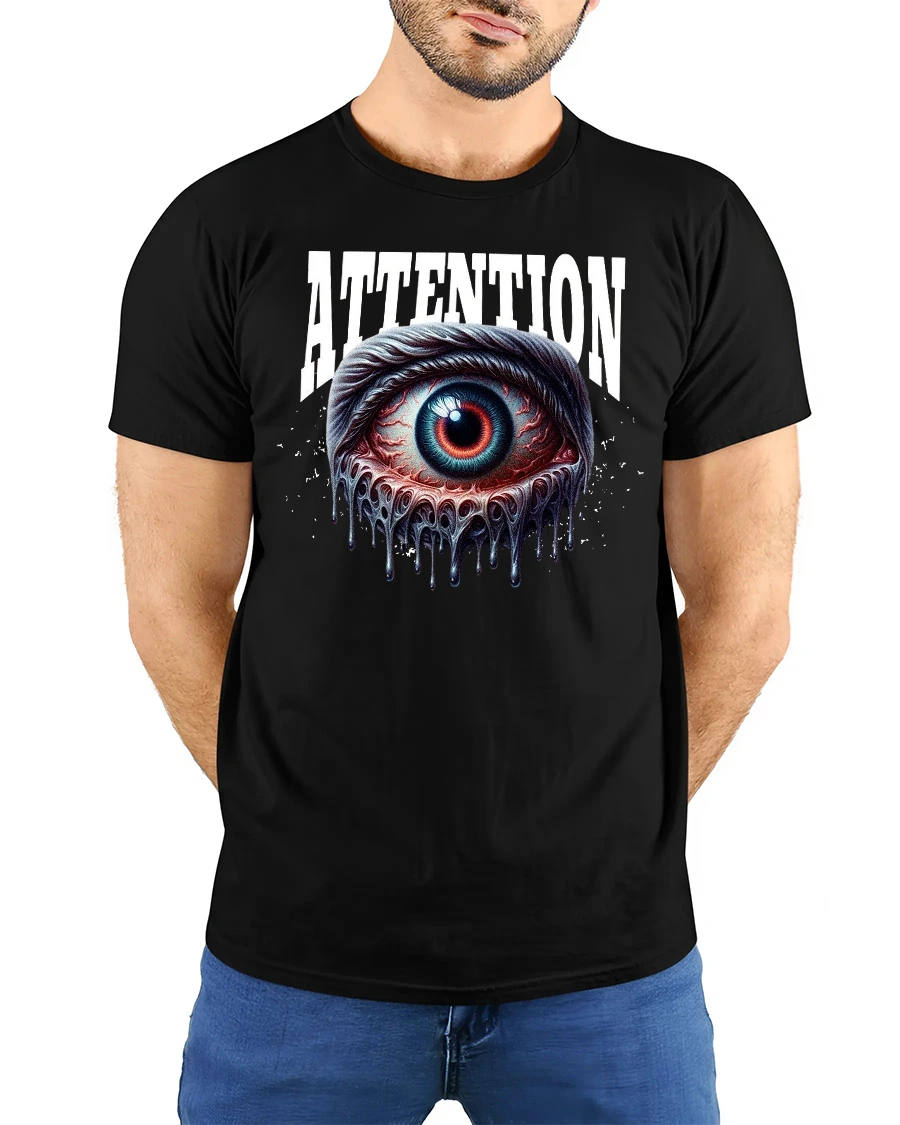 Make a bold statement with the Attention Eye Graphic T-Shirt Creepy Horror Tee. Featuring a chilling all-seeing eye with dripping details under the bold word “ATTENTION,” this shirt is perfect for those who love gothic fashion, horror-inspired art, and edgy graphic tees. Its unique design instantly grabs focus, making it a standout piece in any casual wardrobe.