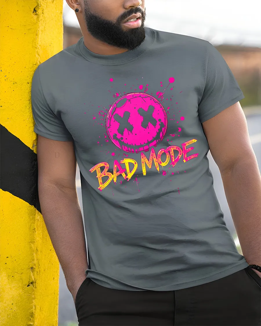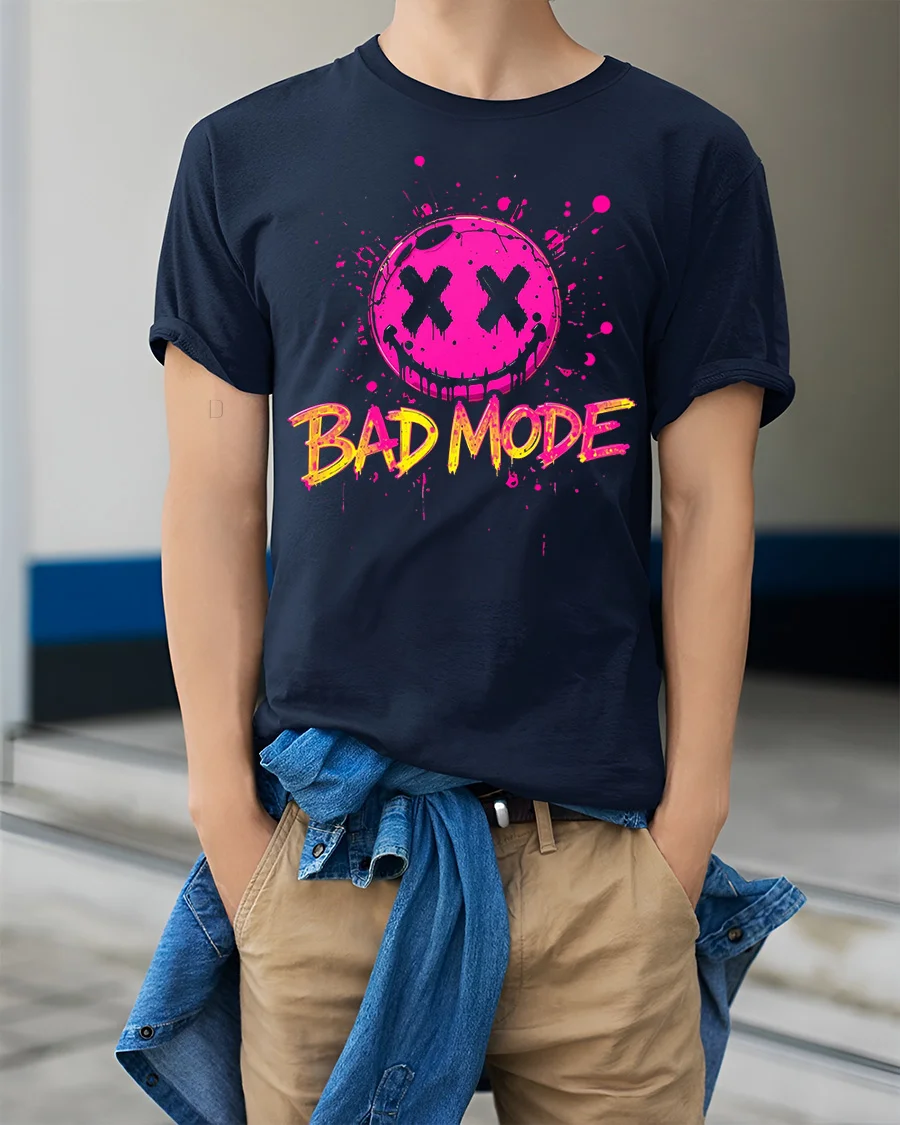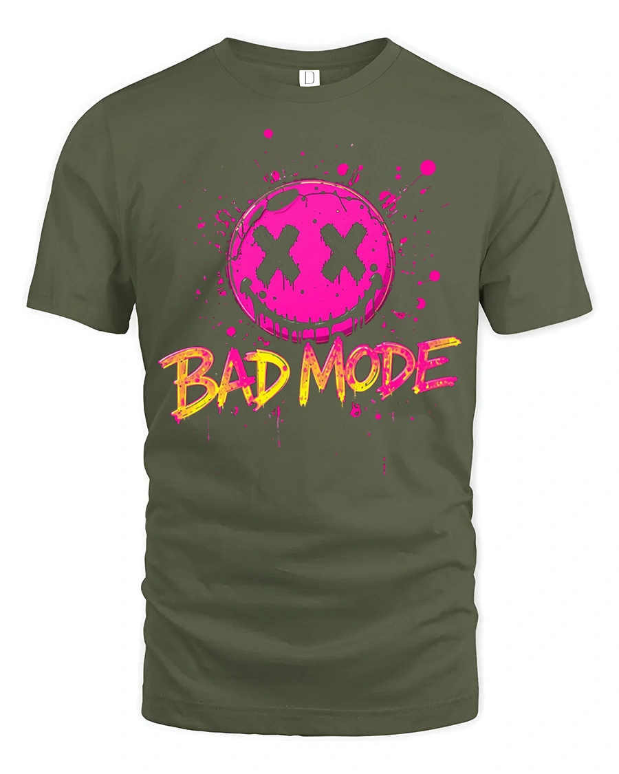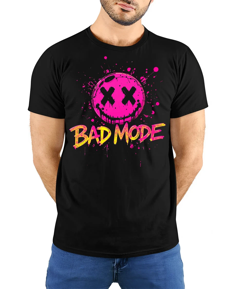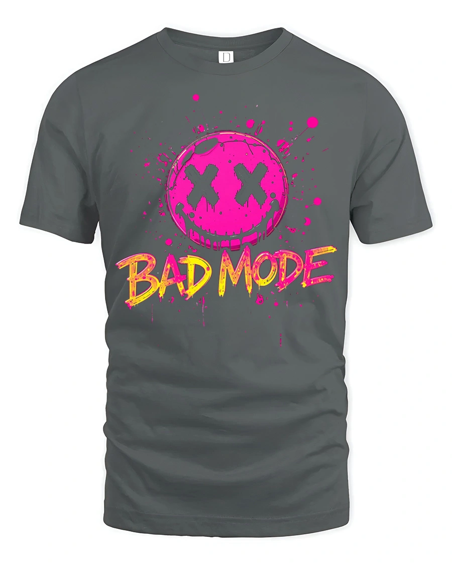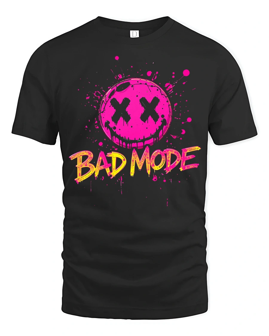 Bad Mode Neon Smile Face Graffiti Style Graphic T Shirt is a bold and stylish design that combines street art energy with a playful attitude.