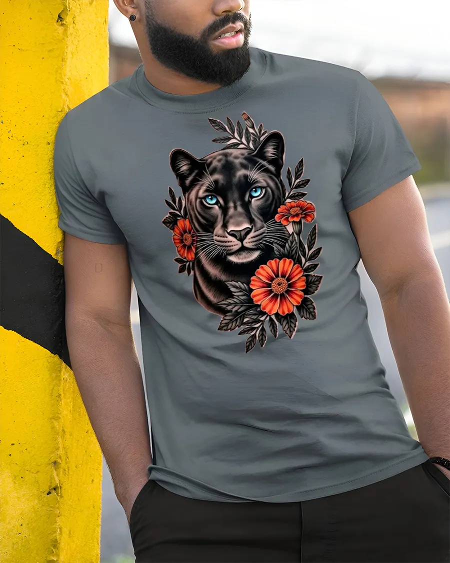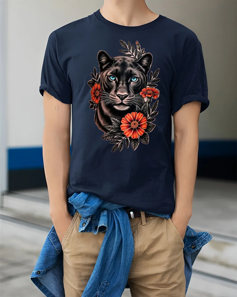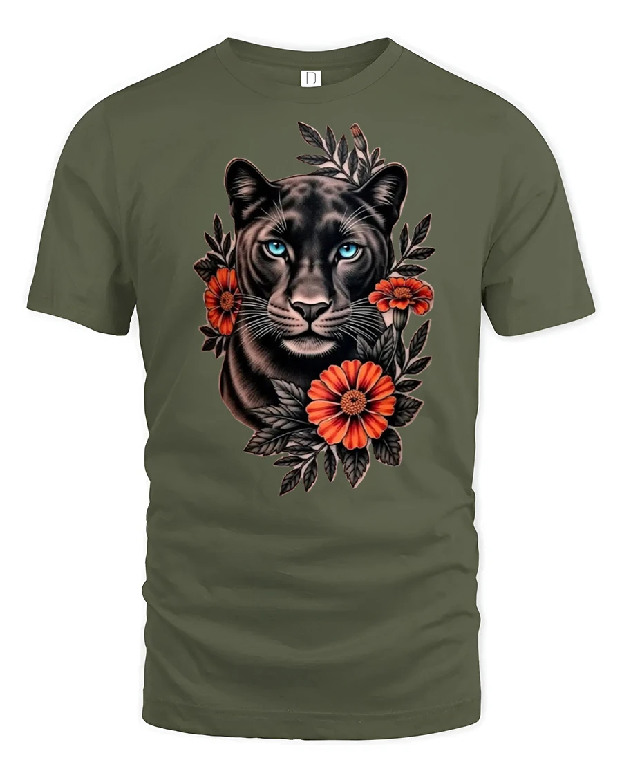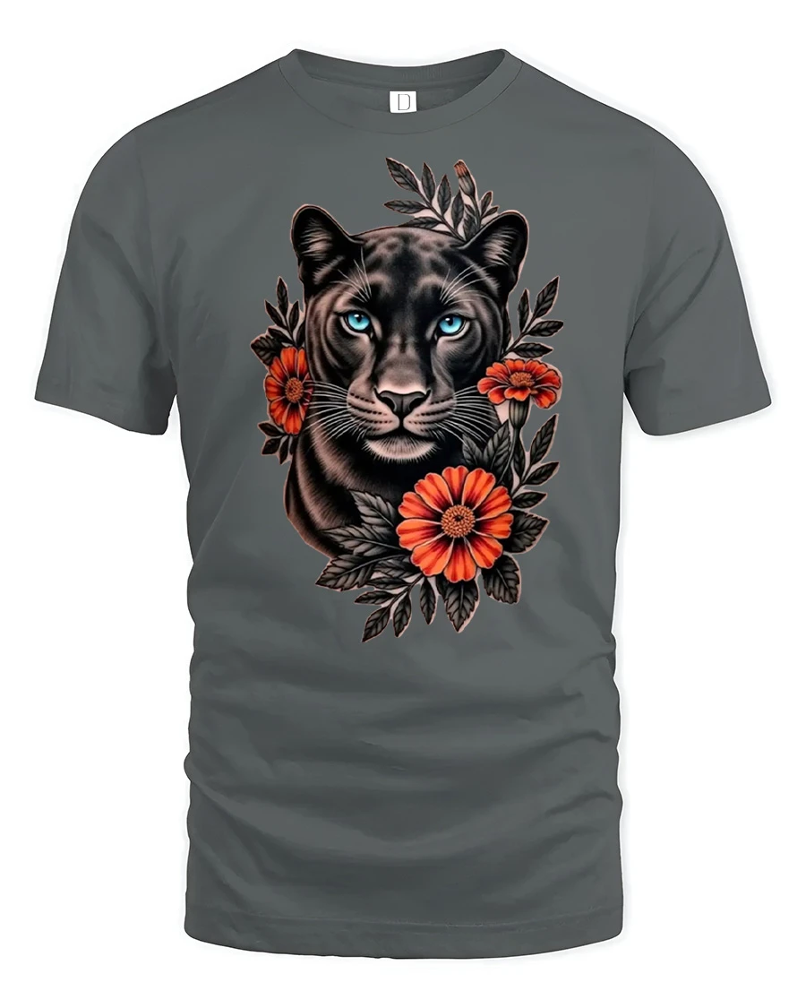 Embrace strength and beauty with the Black Panther With Flowers Graphic T Shirt Wild Elegance that blends fierce wildlife energy with delicate floral art. Featuring a striking panther with piercing blue eyes surrounded by vibrant blossoms, this graphic t shirt creates a bold yet refined look. The detailed illustration highlights power, mystery, and natural grace in a design that instantly captures attention.