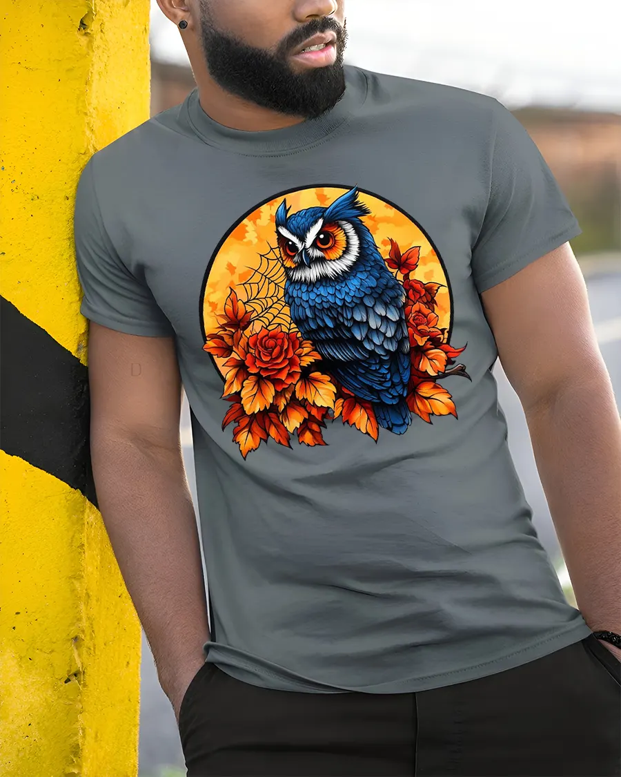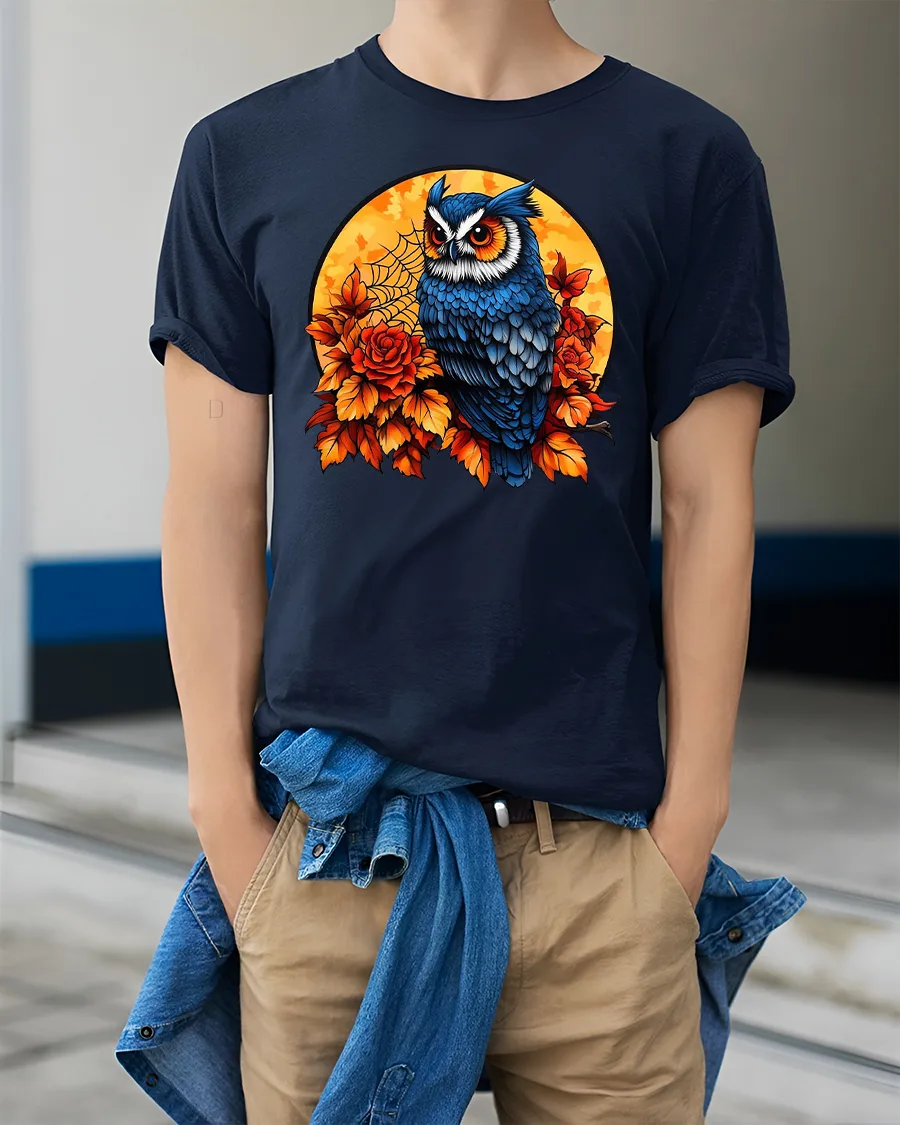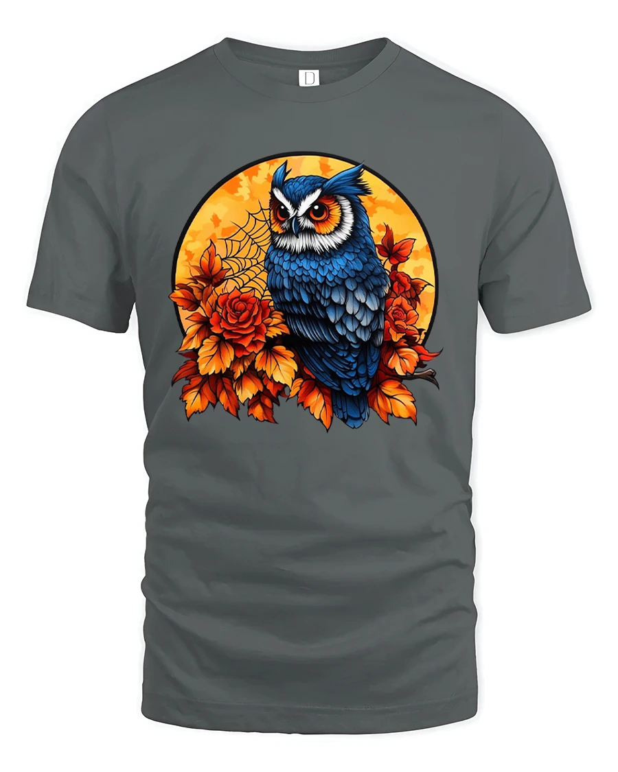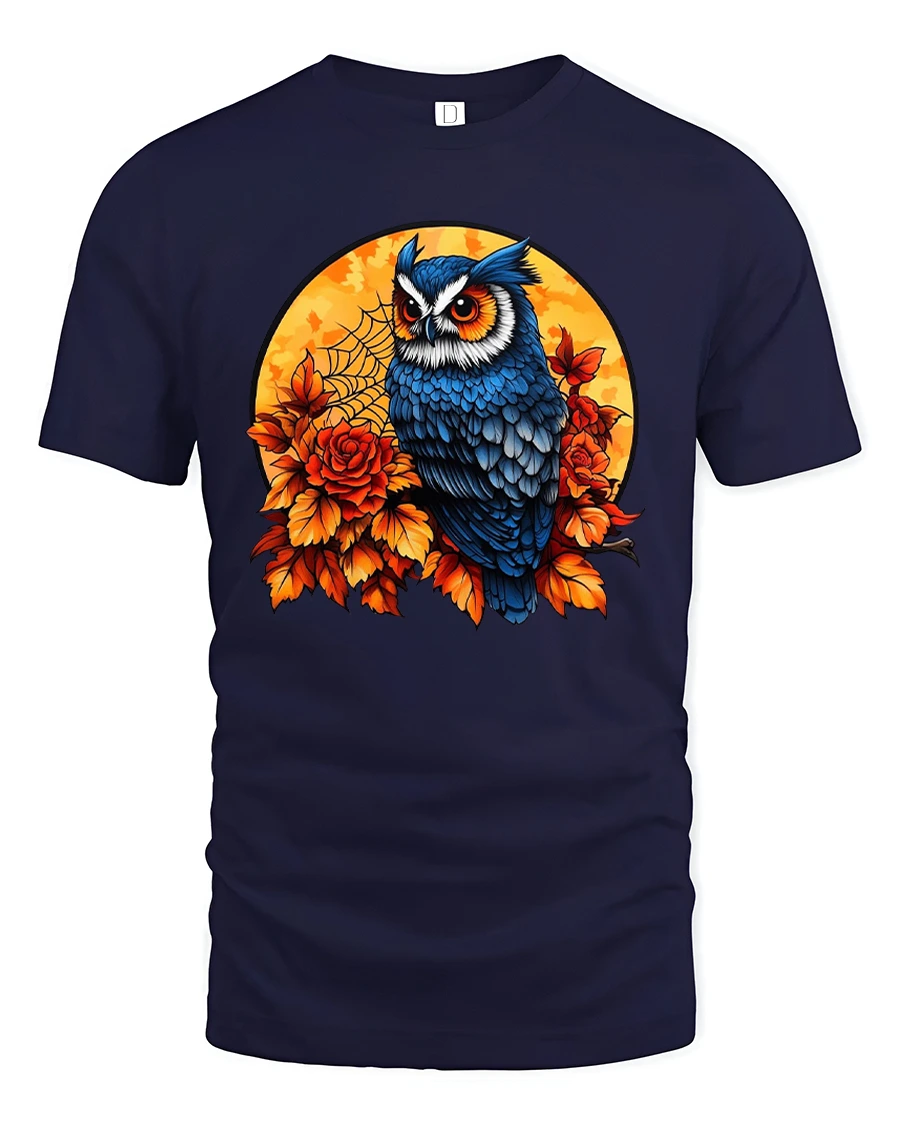Crafted from soft, breathable cotton, this blue owl t-shirt offers comfort and quality you can feel. The vivid, high-definition print makes the design pop, giving it a realistic and bold look that stands out wherever you go. Perfect for Halloween, fall outings, or casual wear all year round.