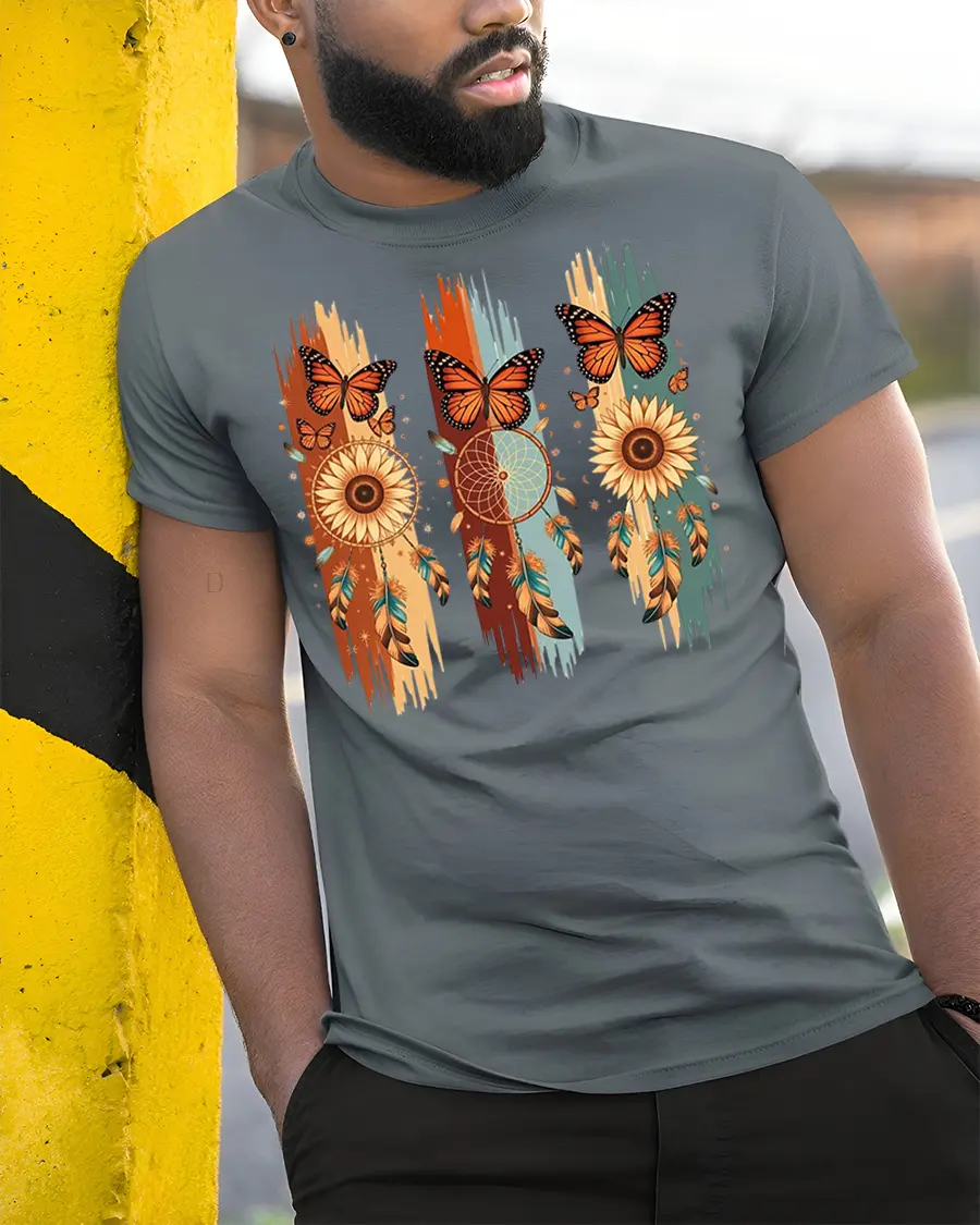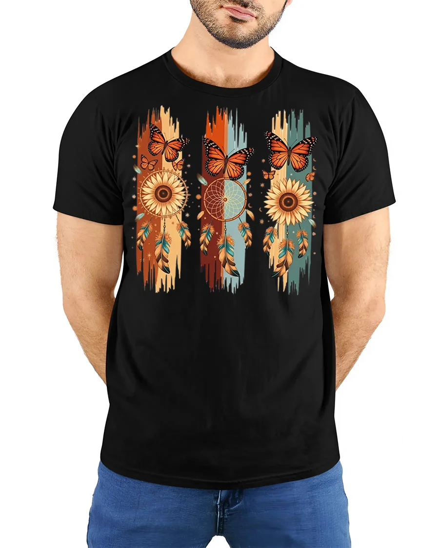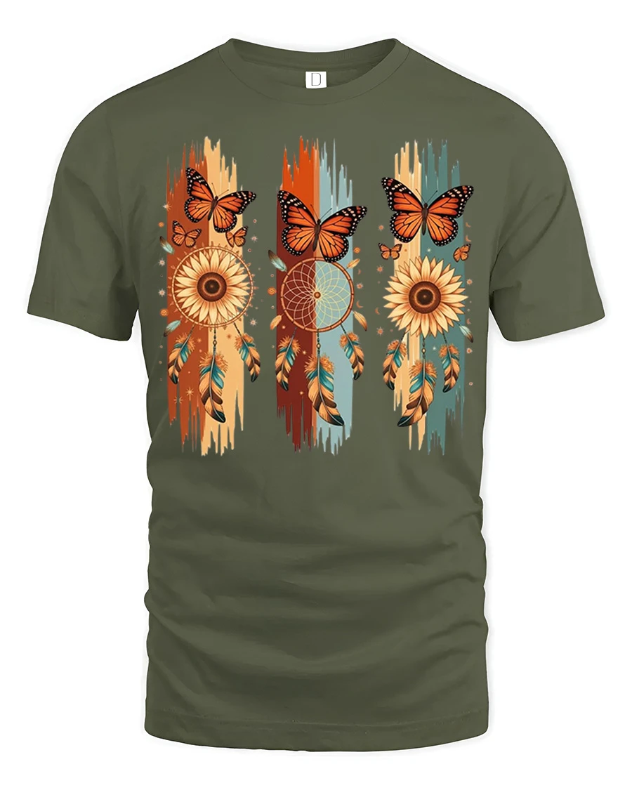 Boho Dreamcatcher Butterfly Sunflower Graphic Tshirt Style blends natural beauty with artistic bohemian elements to create a unique and calming design.