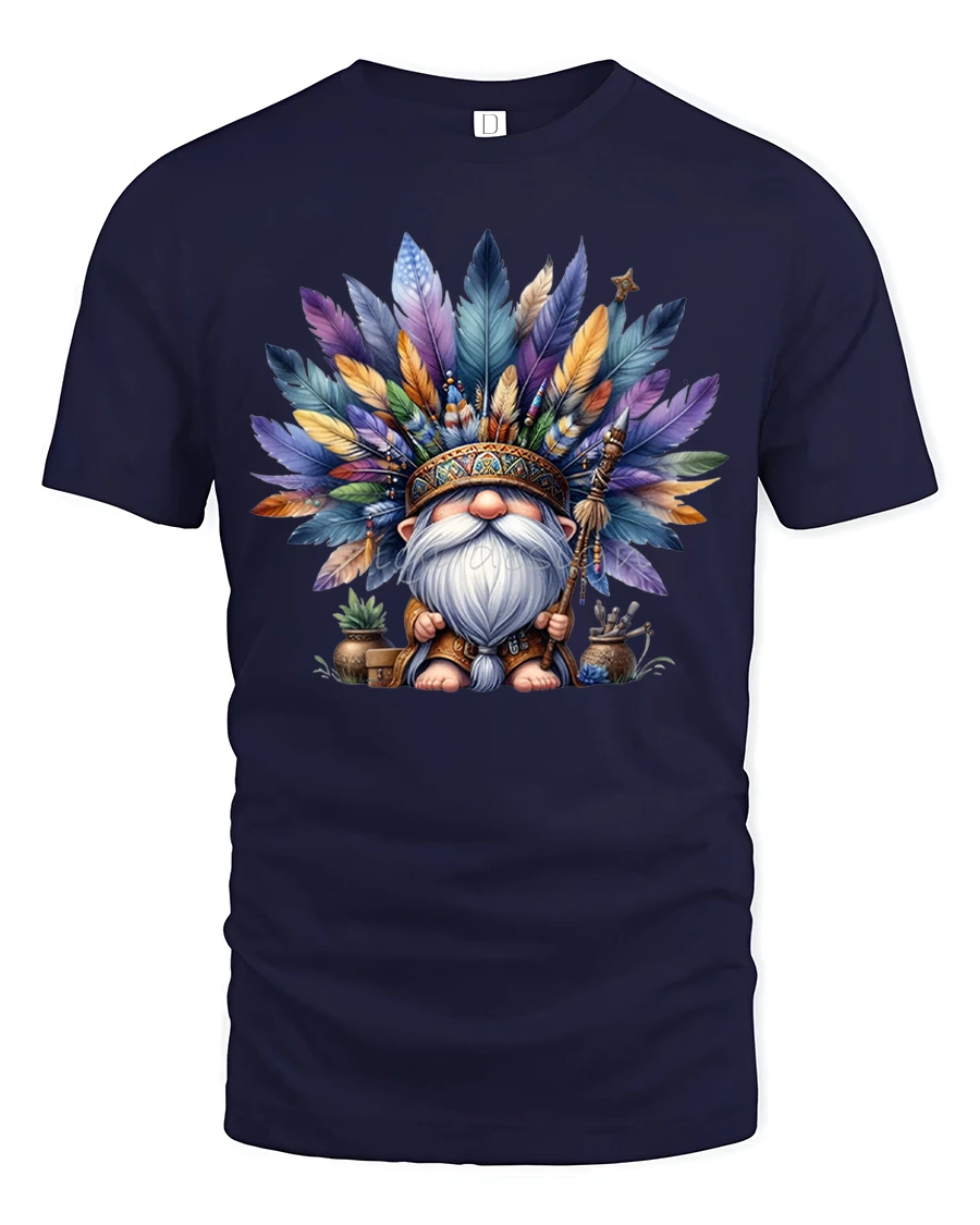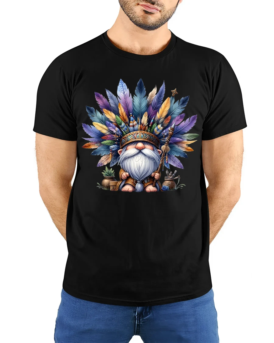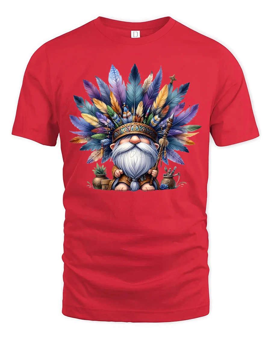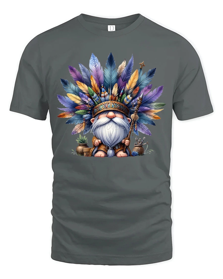 Give your wardrobe a touch of artistic flair with the Boho Feather Gnome Spirit Warrior Graphic Tee.