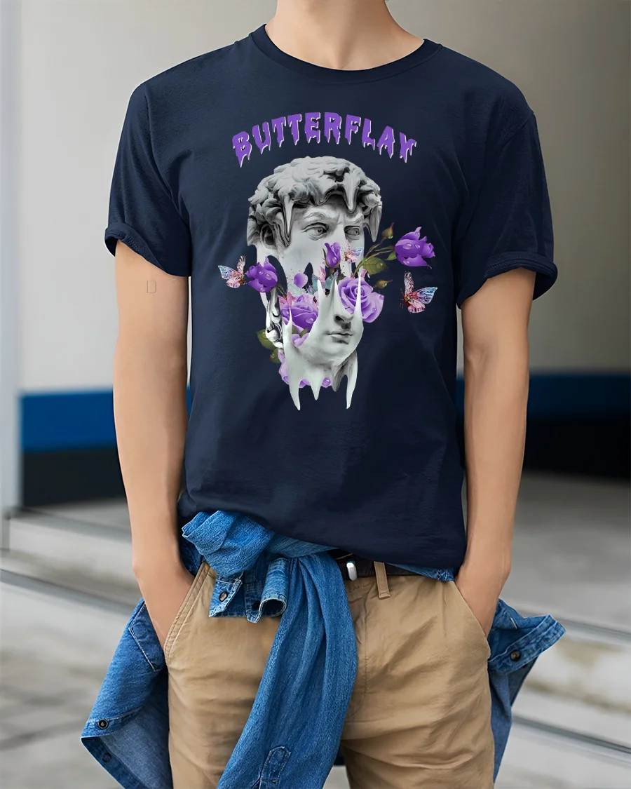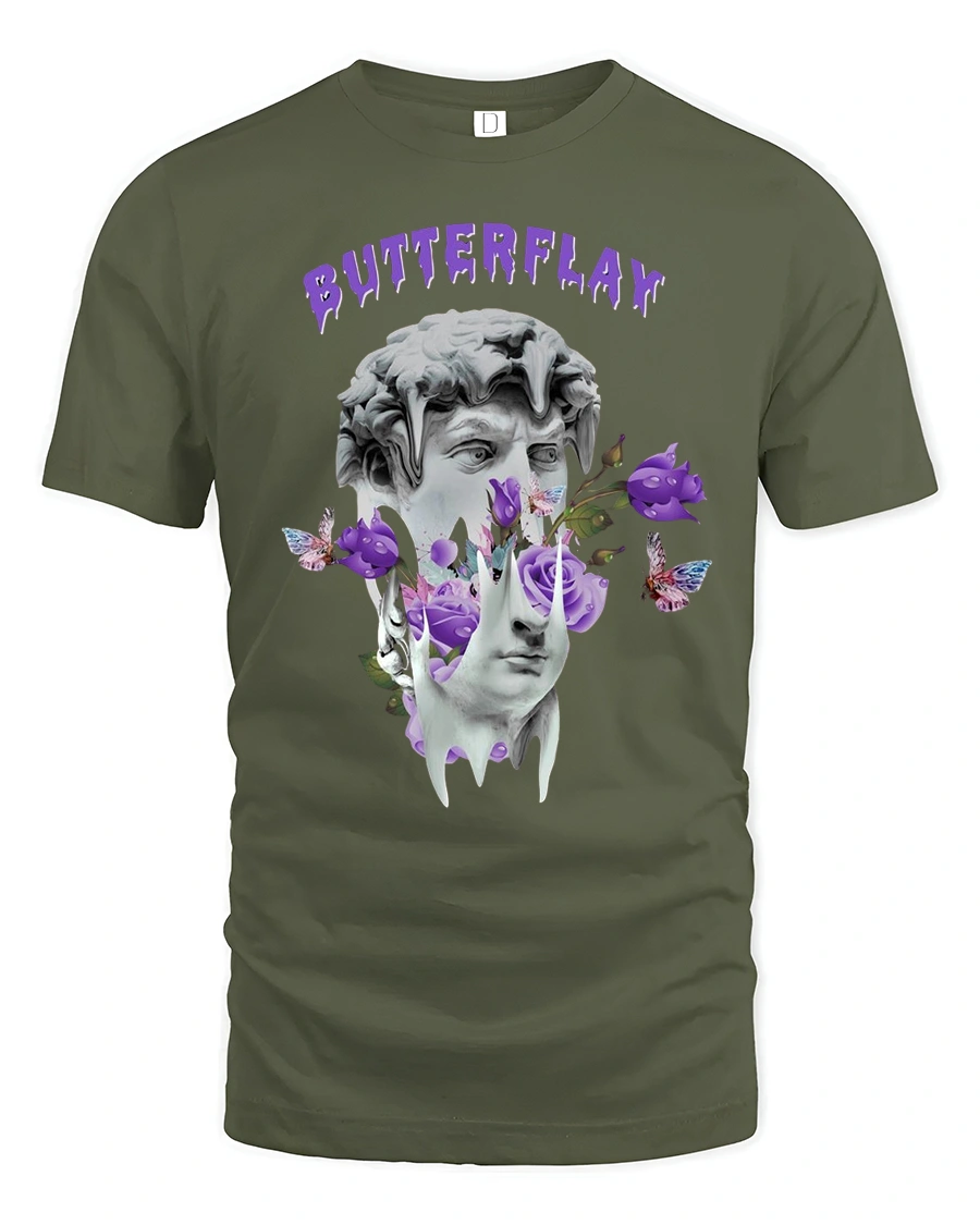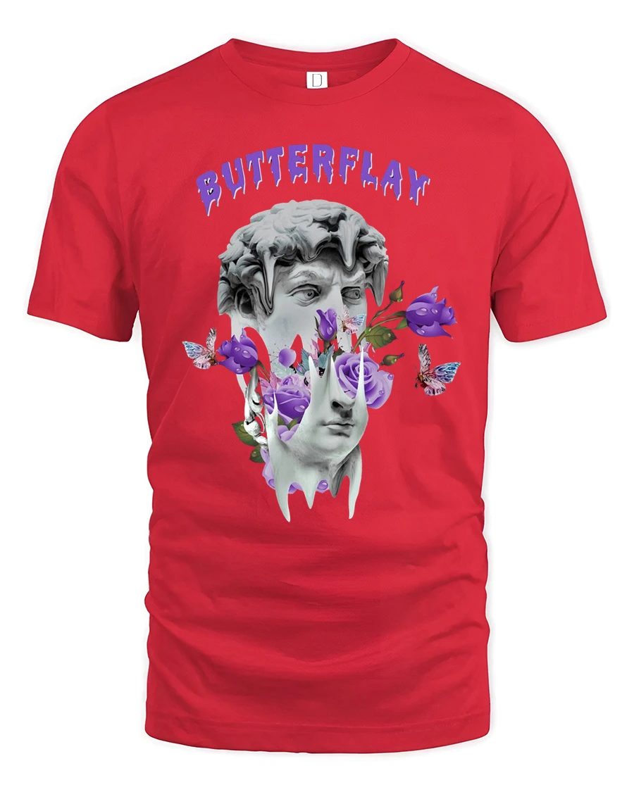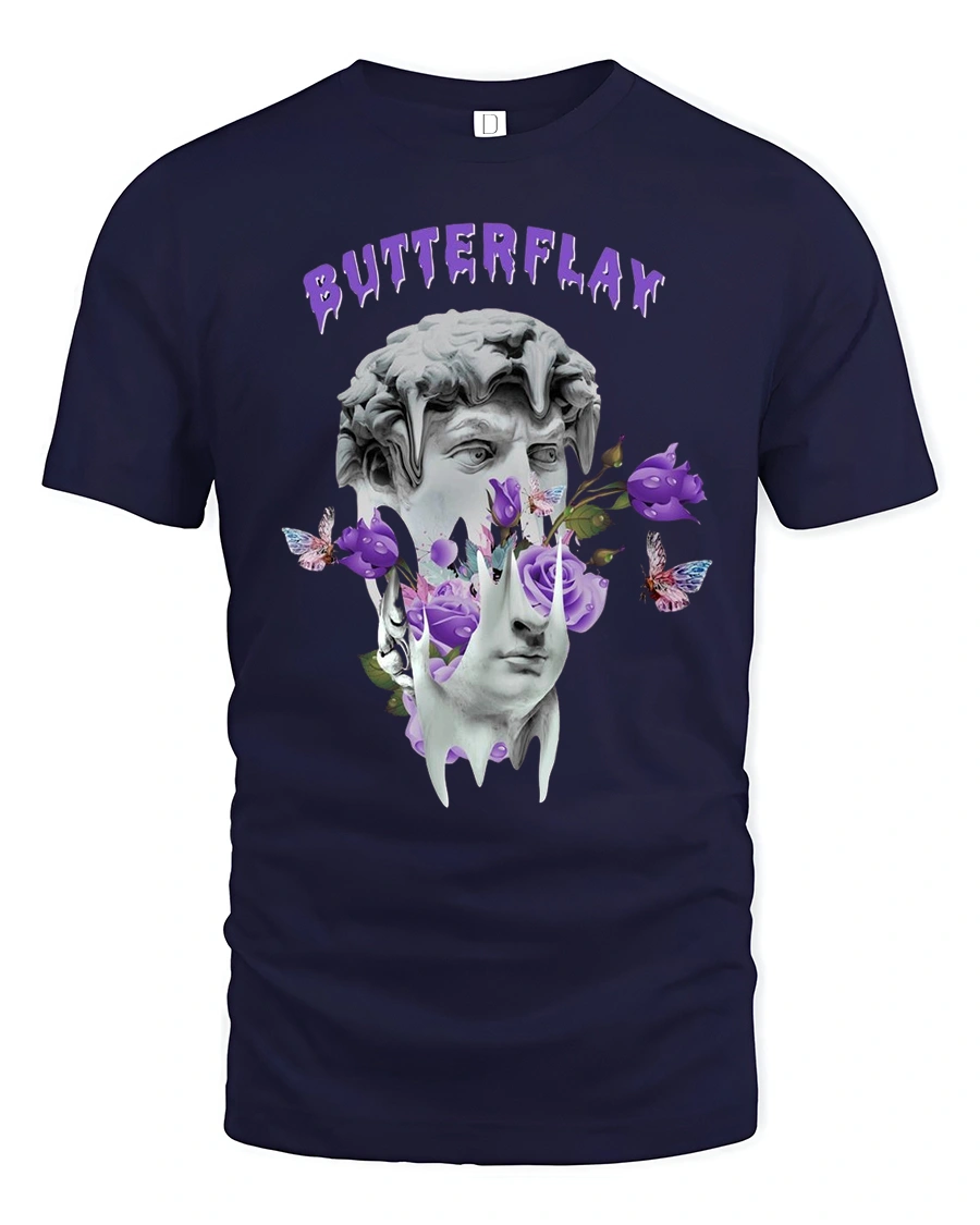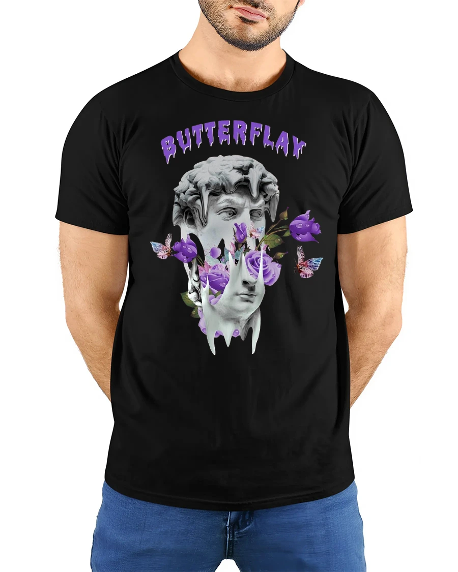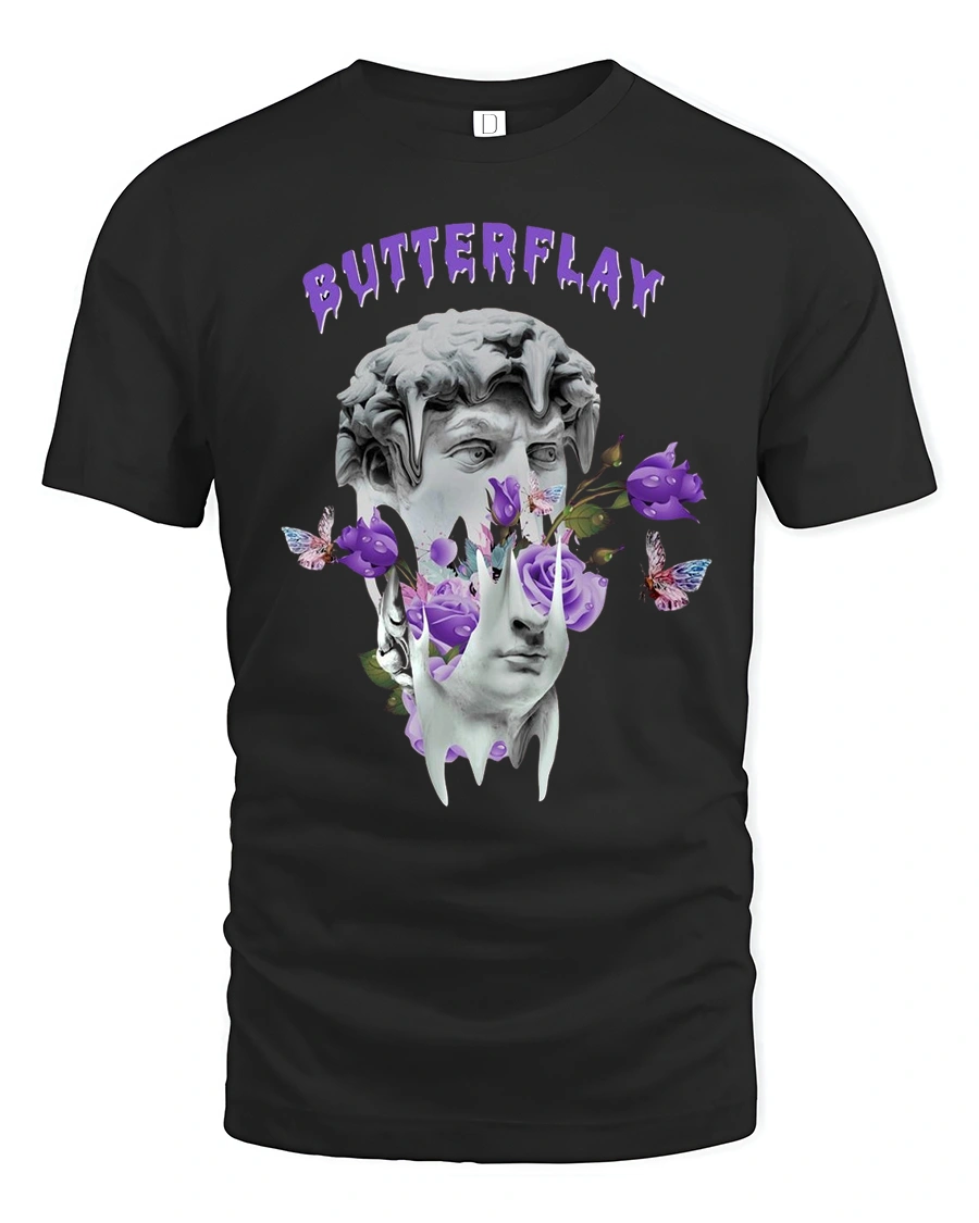 Butterflay Aesthetic Art Tee with Purple Butterflies & Roses brings a bold fusion of classical sculpture and dreamy surrealism into one striking graphic design. Featuring a melting statue surrounded by purple roses, floating butterflies, and artistic shapes, this tee makes the perfect statement piece for anyone who loves aesthetic fashion.