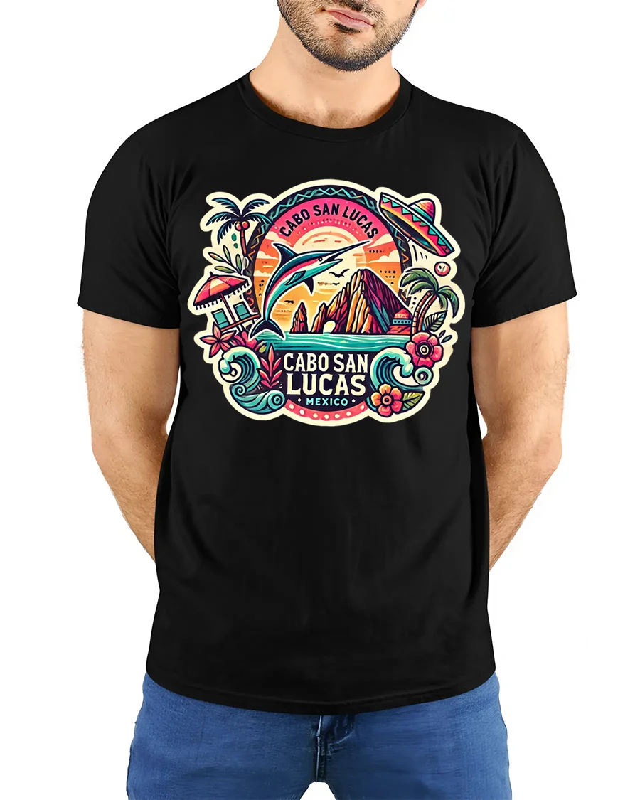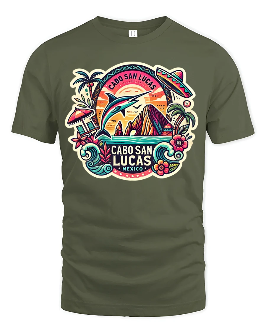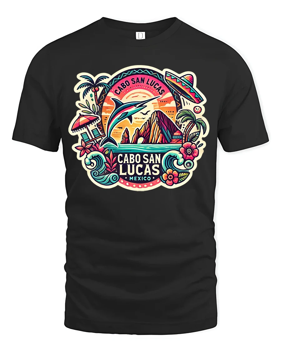 Bring vacation vibes to your everyday style with the Cabo San Lucas Mexico Artwork Colorful Beach Graphic T-Shirt, featuring a vibrant illustration of Cabo’s iconic scenery. With bright tropical colors, palm trees, a dynamic marlin, and a stunning sunset coastline, this design captures the beauty and excitement of one of Mexico’s most beloved travel destinations. It’s perfect for anyone who loves beach adventures, ocean views, and bold, artistic apparel.