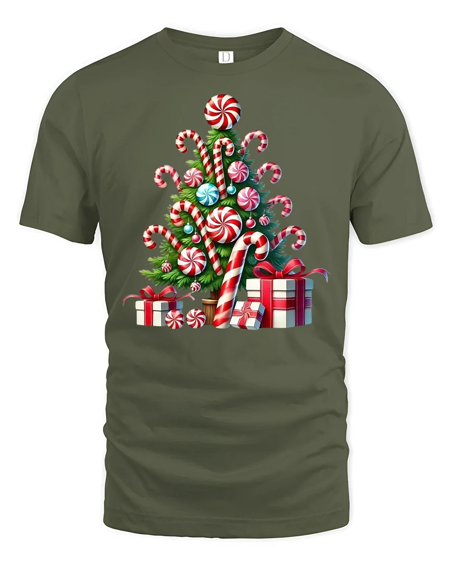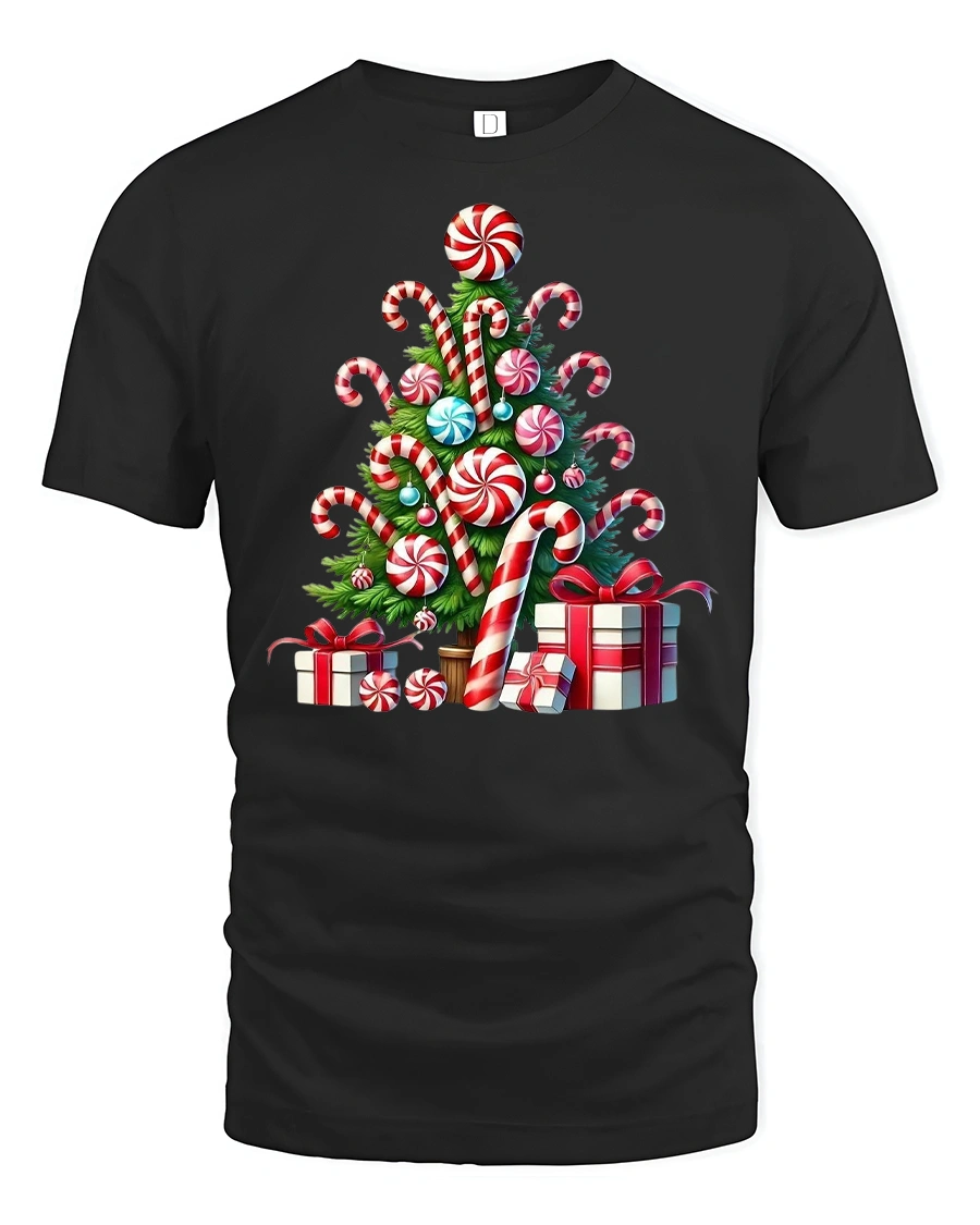 This Candy Cane Christmas Tree Graphic Tee Sweet Holiday Tshirt Gift is perfect for anyone who loves festive, fun and deliciously themed holiday designs. Featuring a Christmas tree made entirely of candy canes, peppermints, sweets and surrounded by beautifully wrapped presents, this playful graphic captures the joyful sweetness of the season. Its bright colors and whimsical style make it a standout Christmas tee for all ages.