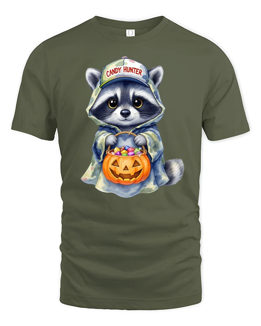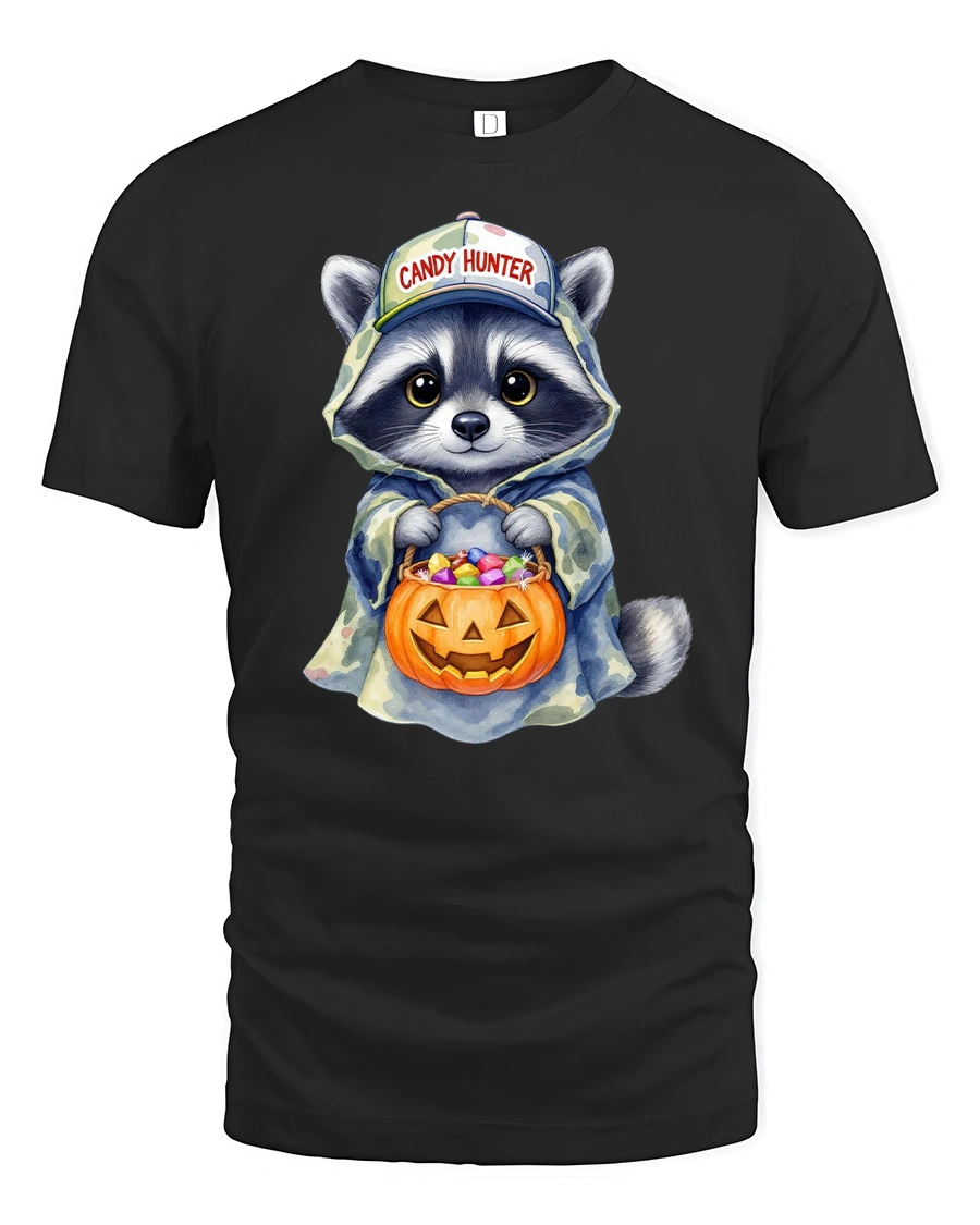This playful design features an adorable raccoon dressed in a camo hoodie and cap, proudly holding a pumpkin candy bucket full of Halloween treats.
