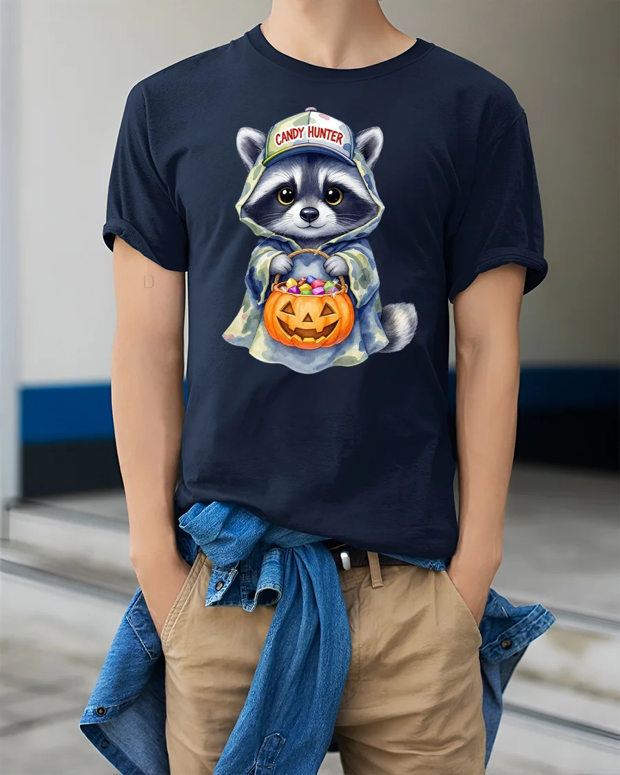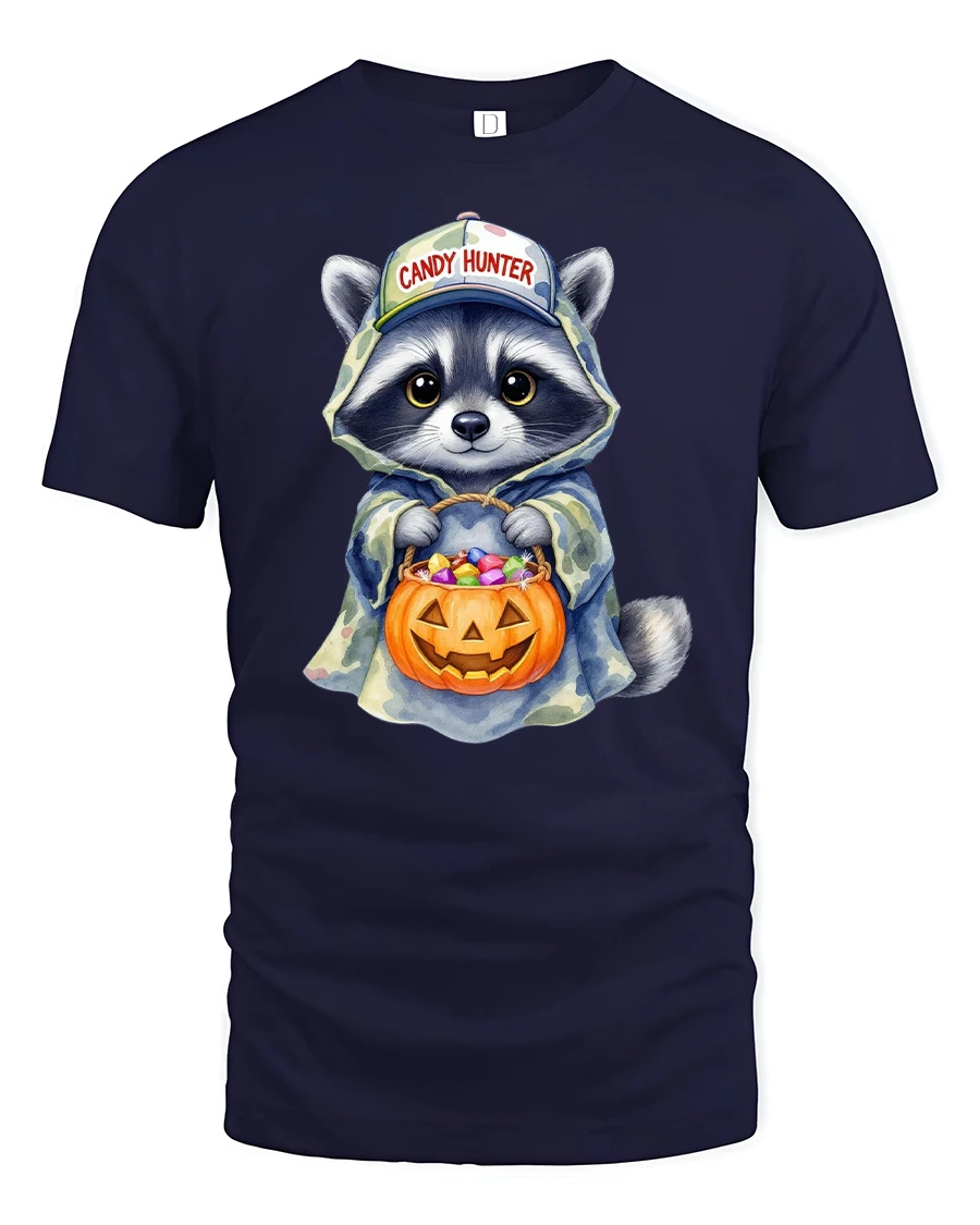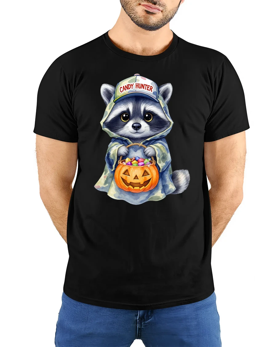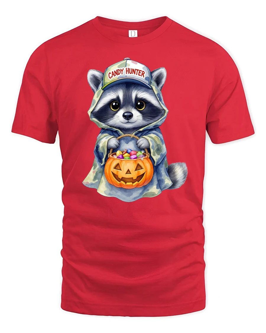 Get ready for a sweet and spooky season with the Candy Hunter Raccoon Funny Halloween Trick Tee, the perfect mix of cute and festive.
