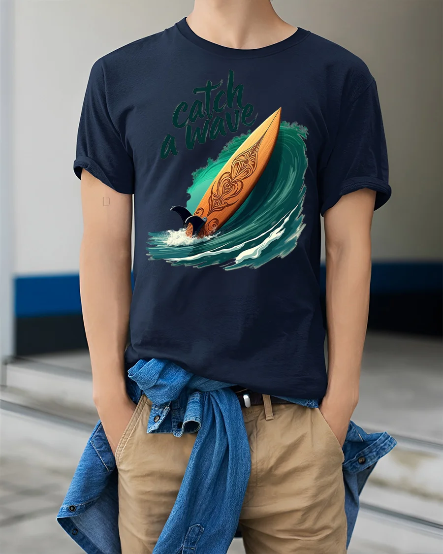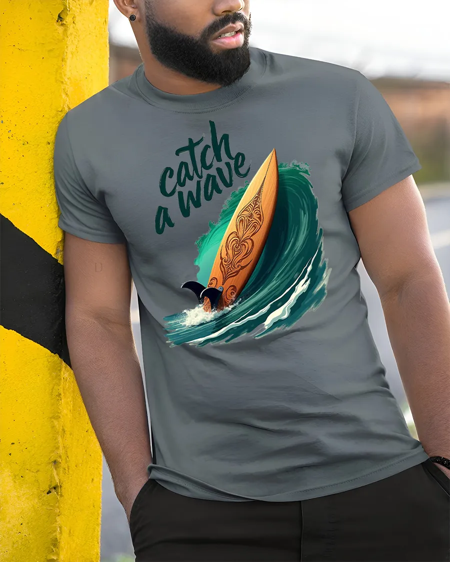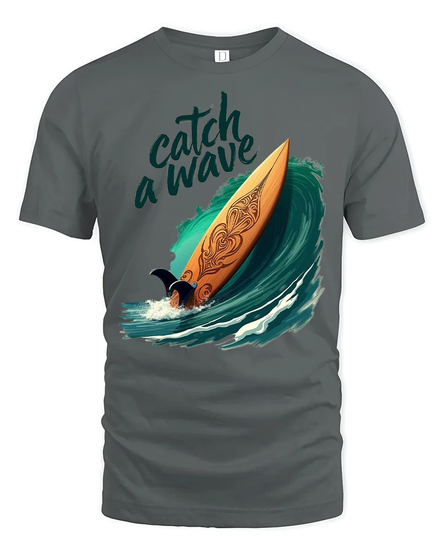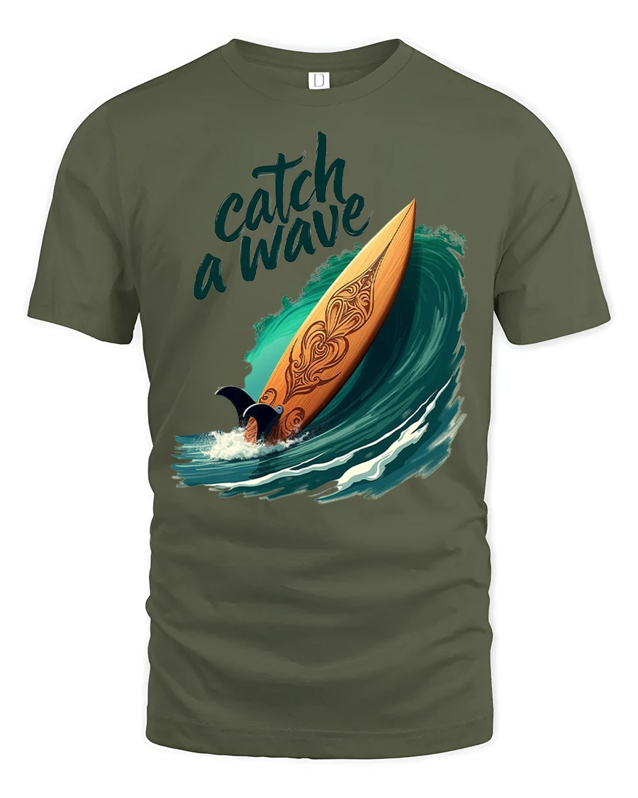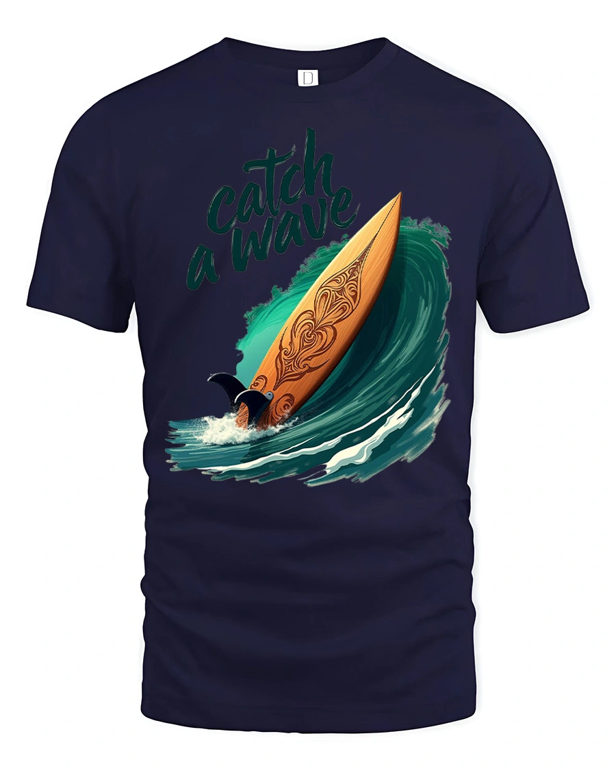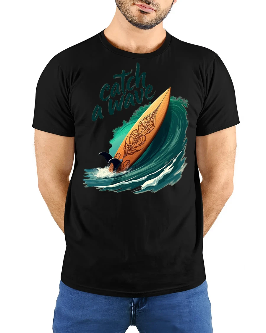 Catch A Wave Surfboard Graphic Tshirt Ocean Beach Vibe captures the thrill of surfing with a beautifully illustrated board riding a powerful ocean wave.