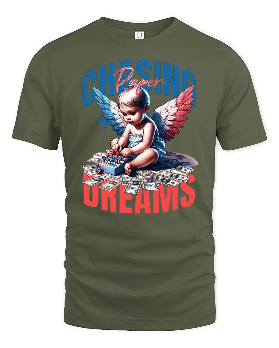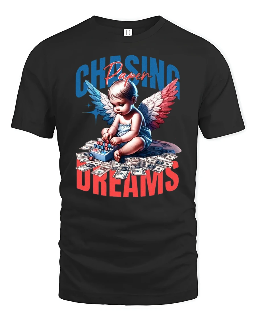 Chasing Paper Dreams Angel Money Graphic T-Shirt is the perfect blend of humor, style, and bold design. Featuring a baby angel with colorful wings surrounded by dollar bills, this tee delivers a playful yet stylish take on the phrase “chasing paper.” The unique graphic art captures modern streetwear vibes, making it an ideal piece for those who love standout fashion with a fun edge.