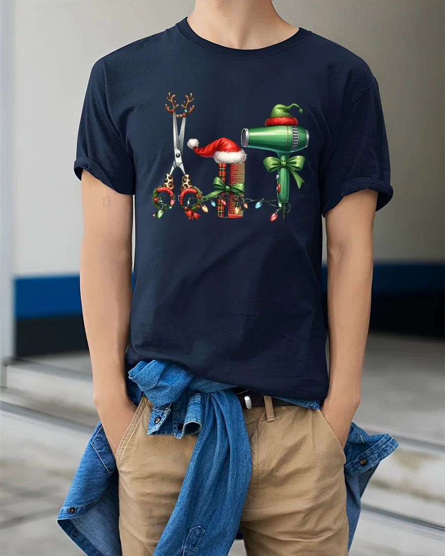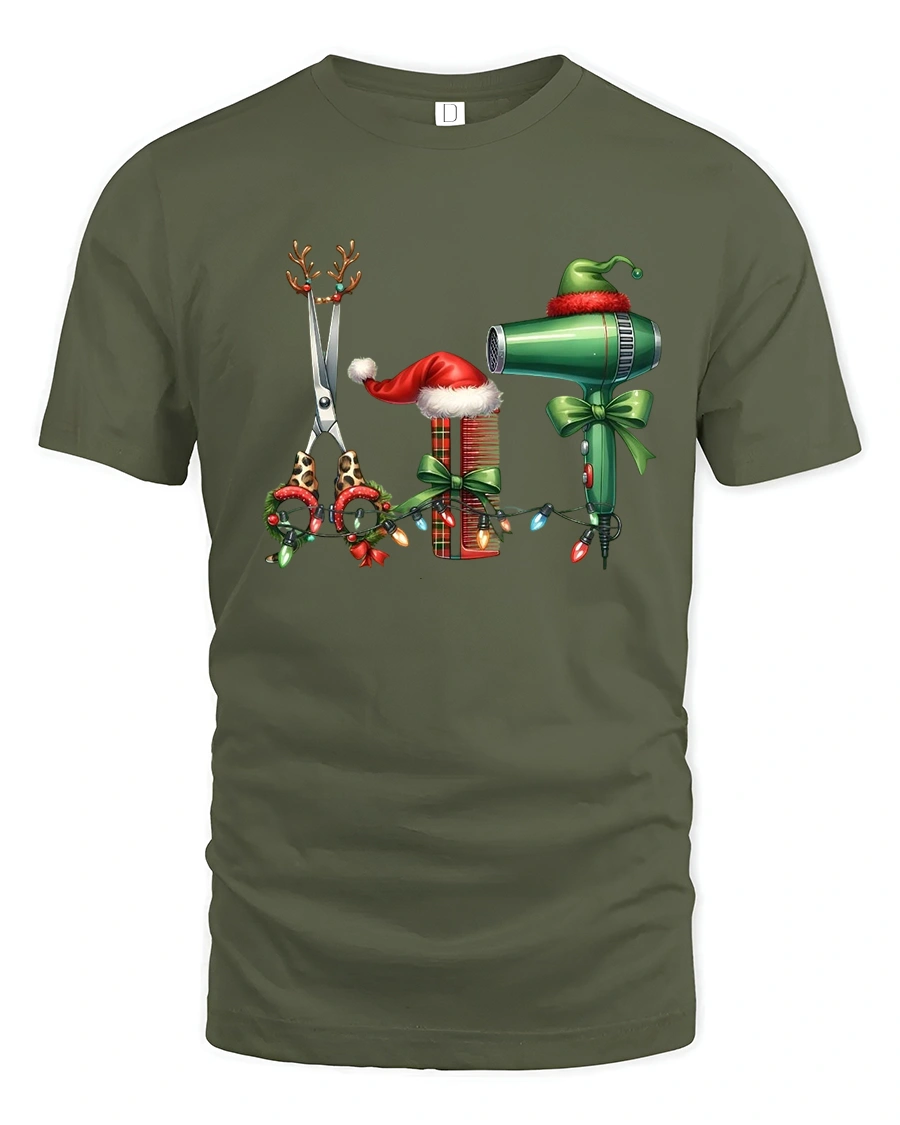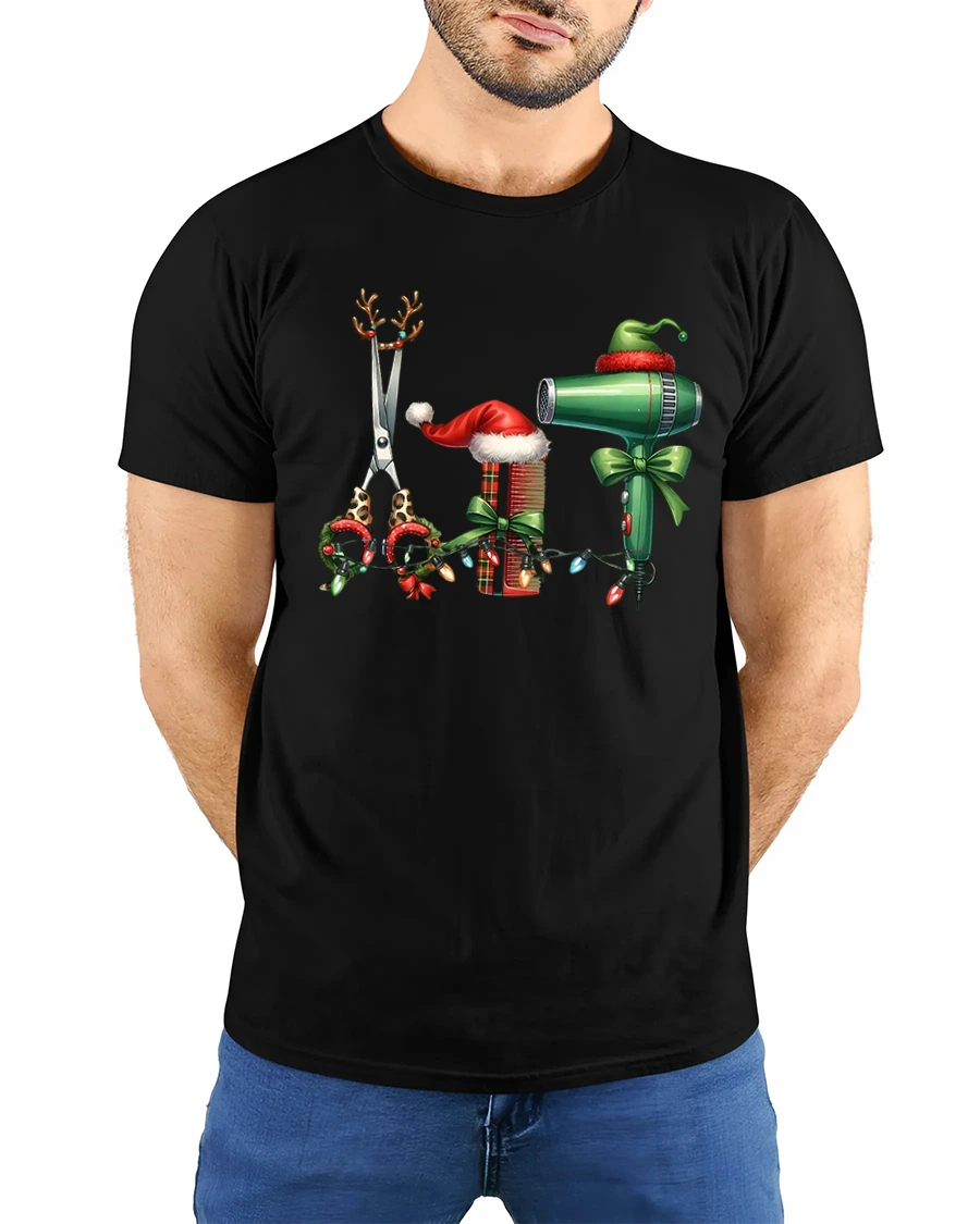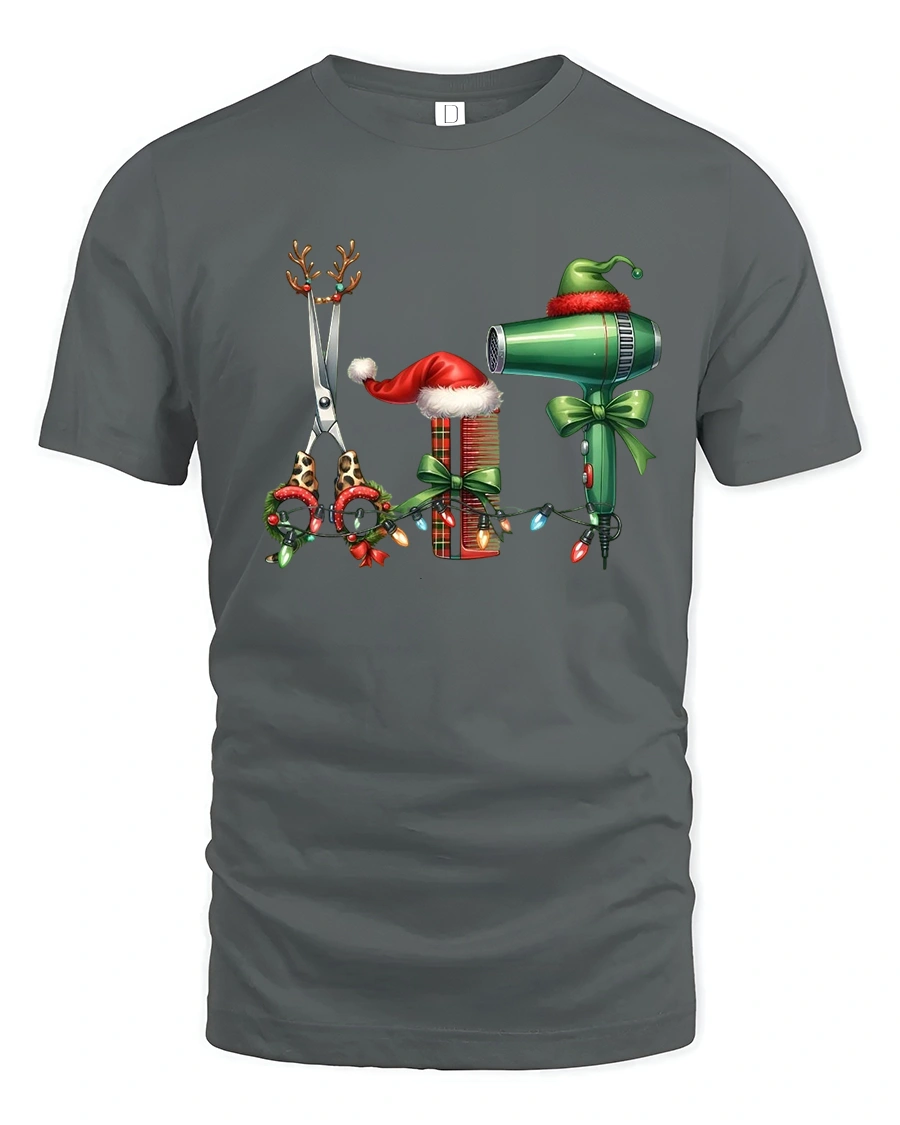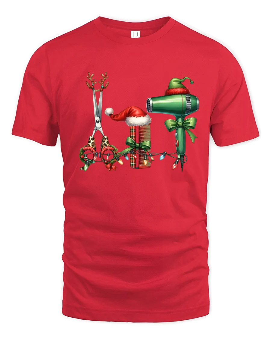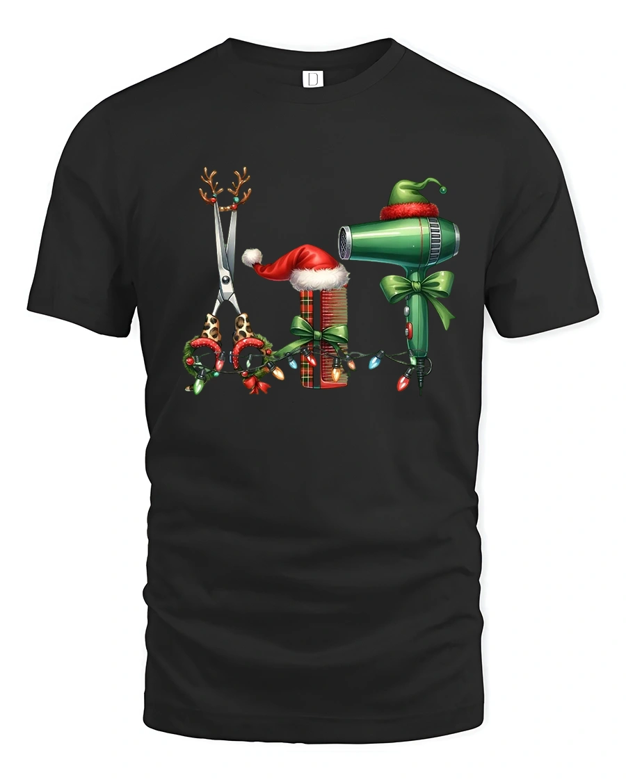 This Christmas Hairstylist Tools Tee Festive Salon Holiday Tshirt is the perfect seasonal pick for hairstylists, cosmetologists, and barbers who love celebrating the holidays in style. Featuring adorable Christmas-themed scissors, combs, and a hair dryer decorated with lights, bows, and Santa hats, this tee brings cheerful holiday spirit into any salon or barbershop.