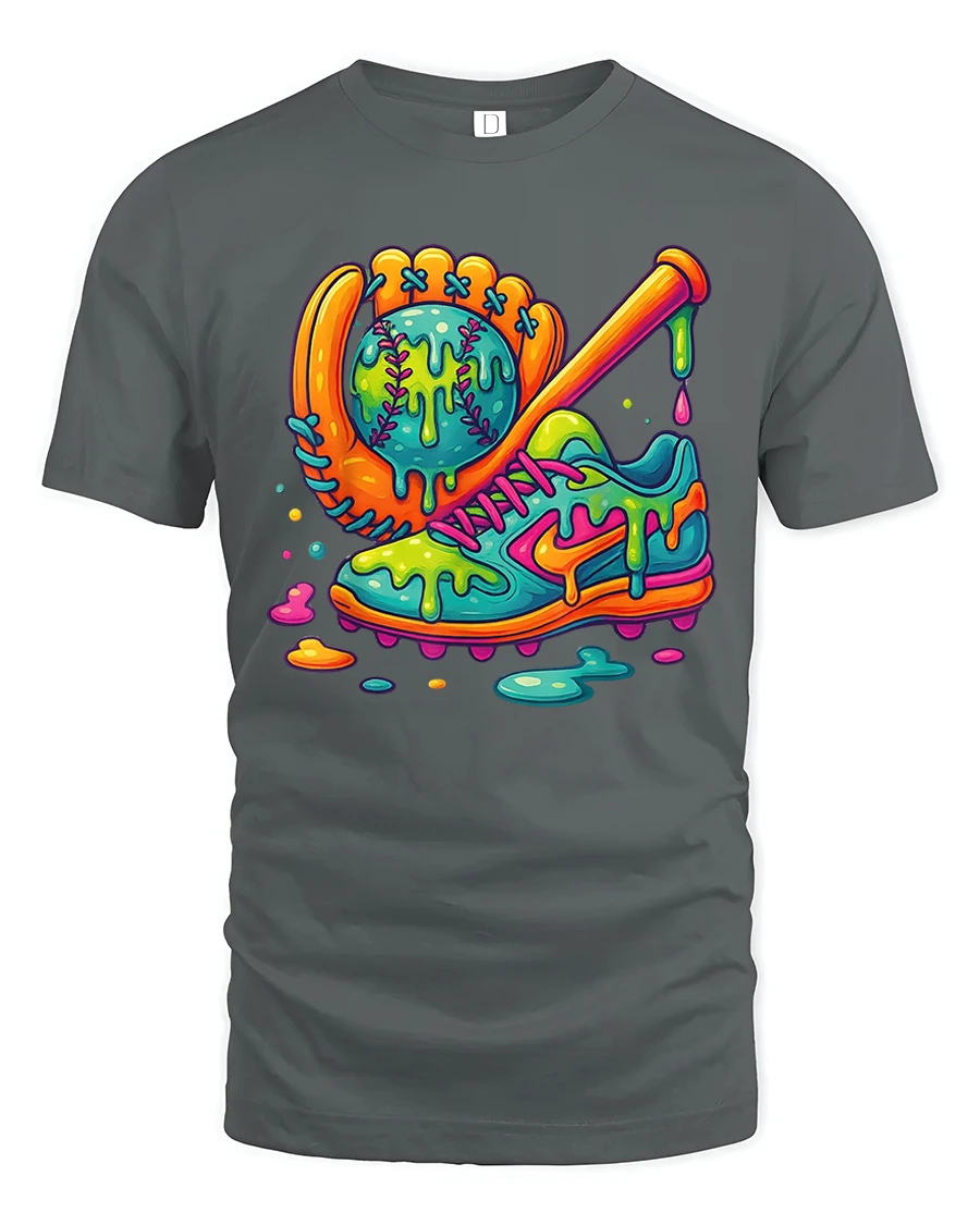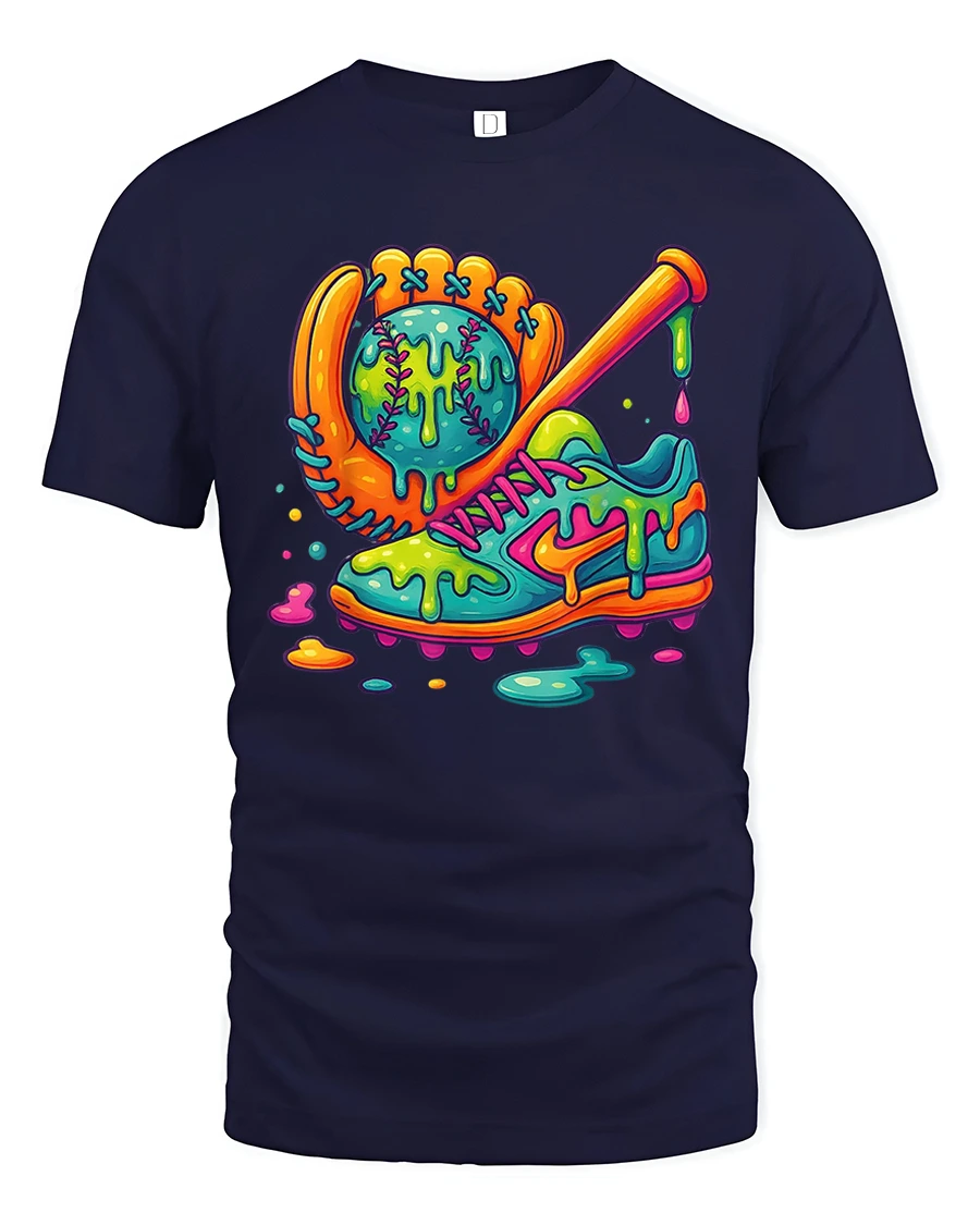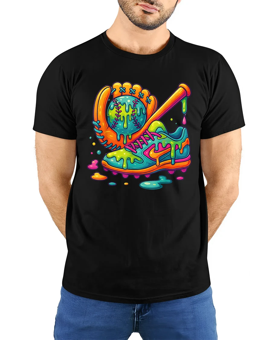Featuring a dripping baseball glove bat and sneaker with vibrant splash colors this artwork feels fresh expressive and eye catching.