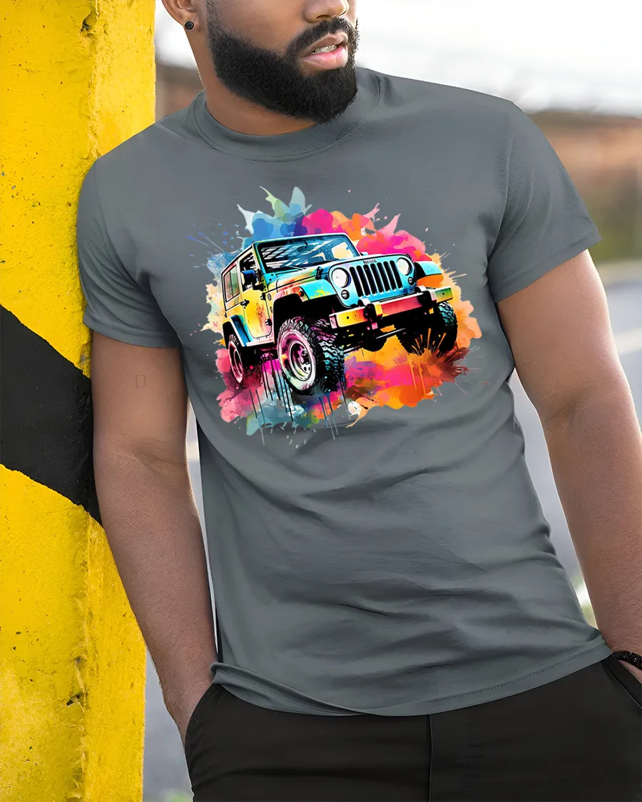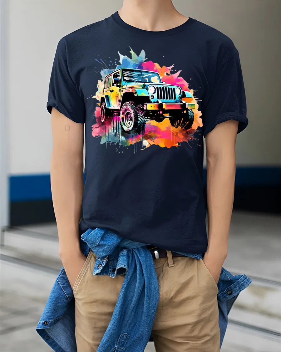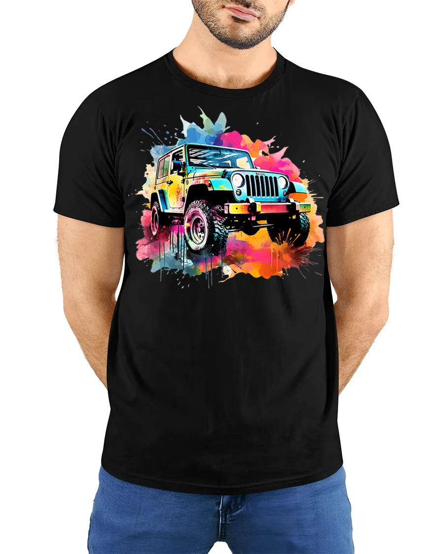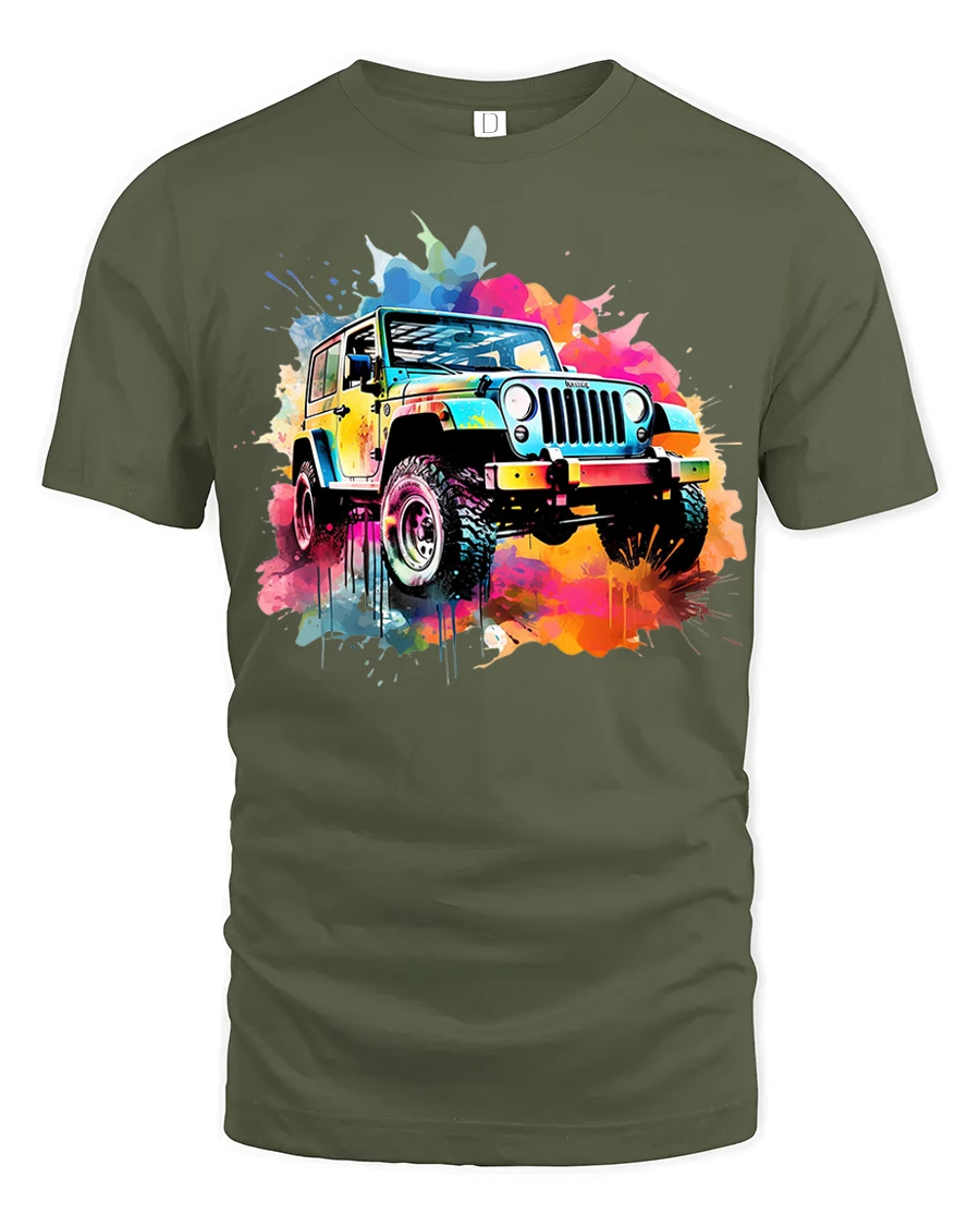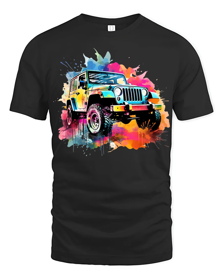 Featuring a detailed jeep surrounded by vibrant watercolor splash effects, this t shirt creates a powerful and adventurous look with a modern creative twist.
