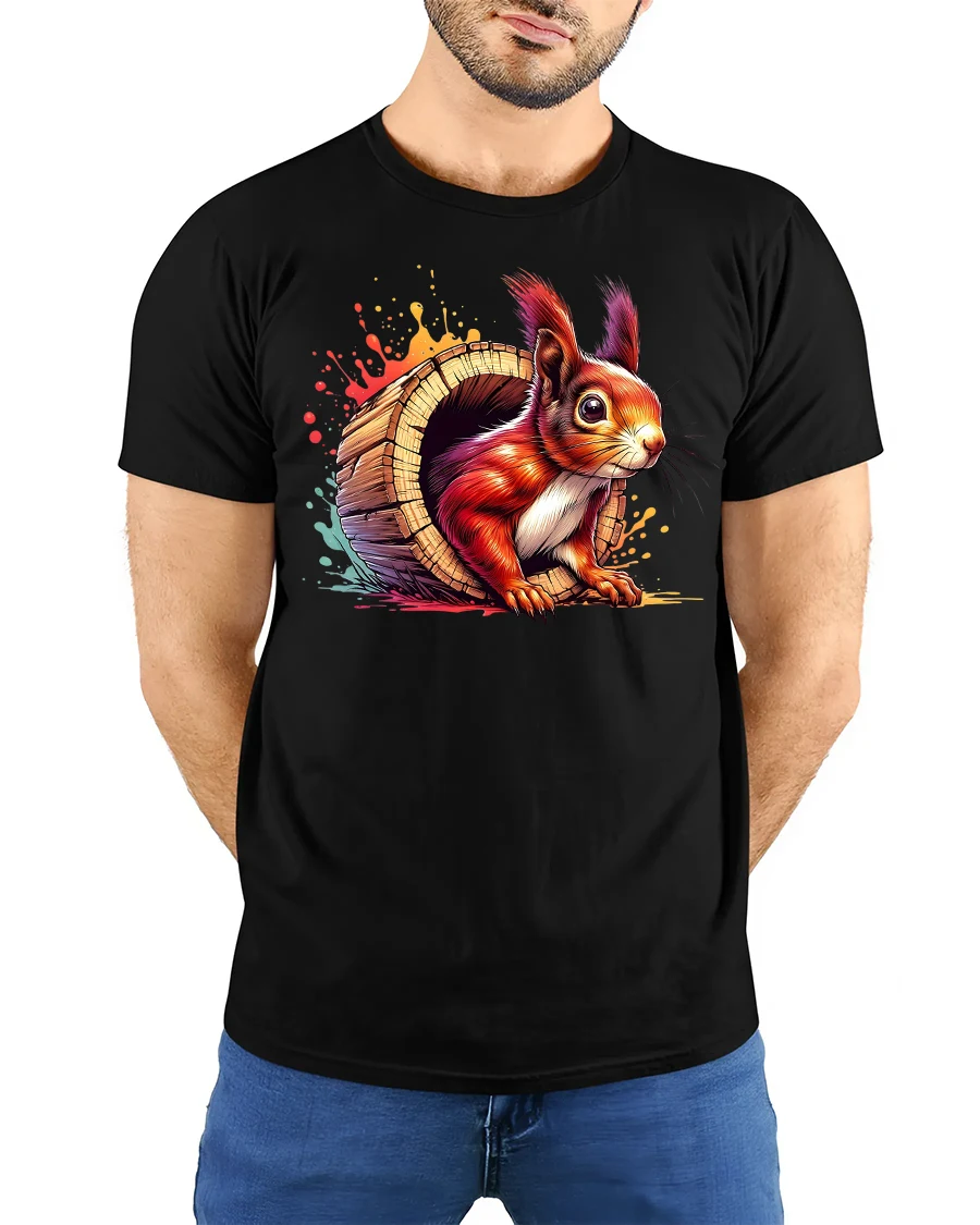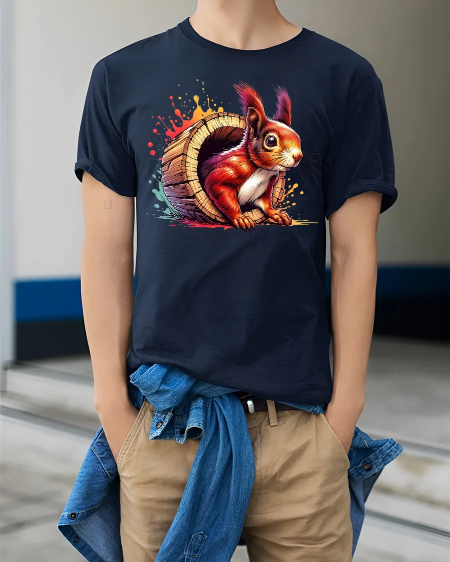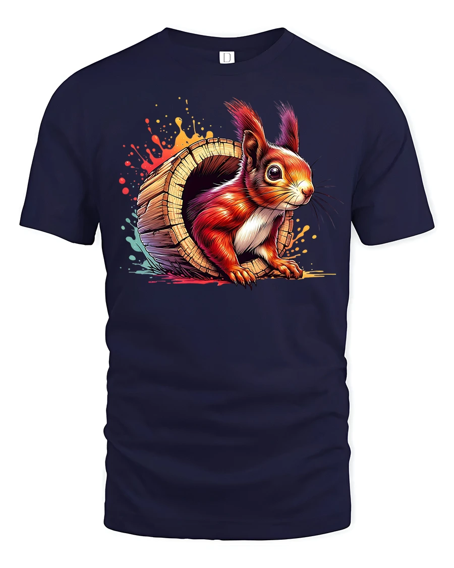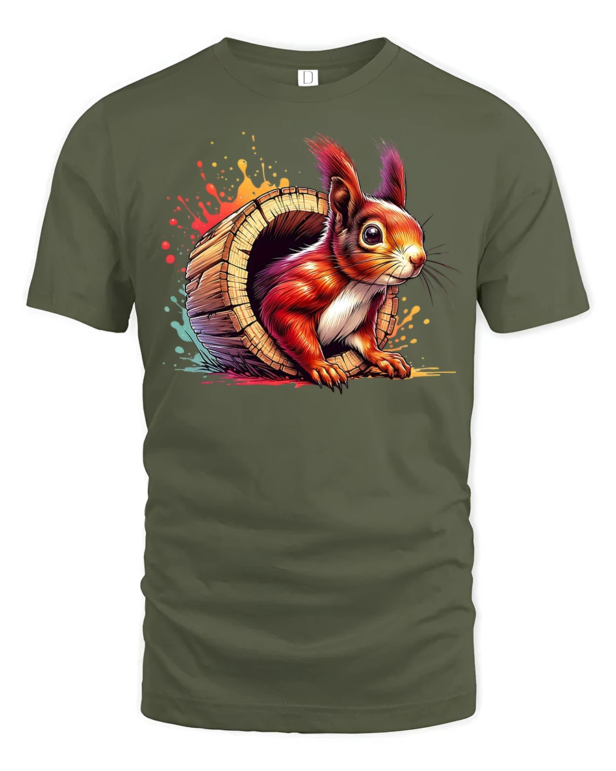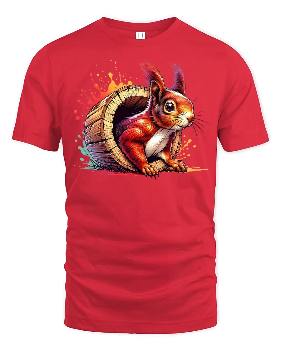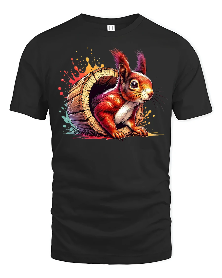 This striking t-shirt features a vivid and artistic red squirrel emerging from a rustic wooden log, surrounded by bold splashes of color. The unique blend of realism and abstract paint effects makes this design perfect for nature lovers, wildlife enthusiasts, and anyone who enjoys standout fashion.Made from soft, breathable fabric, this shirt delivers both comfort and style for everyday wear. The high-quality print ensures the brilliant colors remain vibrant wash after wash. Ideal for casual outings, nature walks, or as a thoughtful gift for squirrel fans and woodland admirers.Whether you’re adding a playful touch to your wardrobe or searching for the perfect gift, this squirrel t-shirt offers a wearable piece of art that’s full of charm and character. Pair it with jeans, shorts, or layer it under a jacket for a versatile look that works year-round.