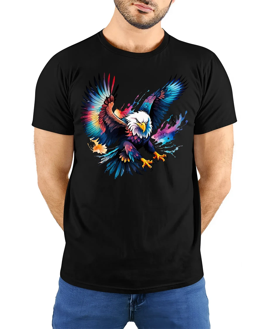 Featuring a majestic eagle with wings spread wide, painted in bold splashes of color, this tee blends American strength with artistic creativity.
