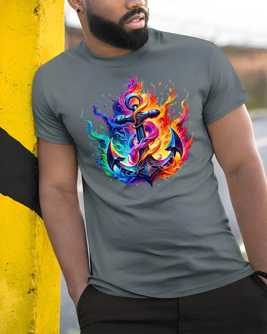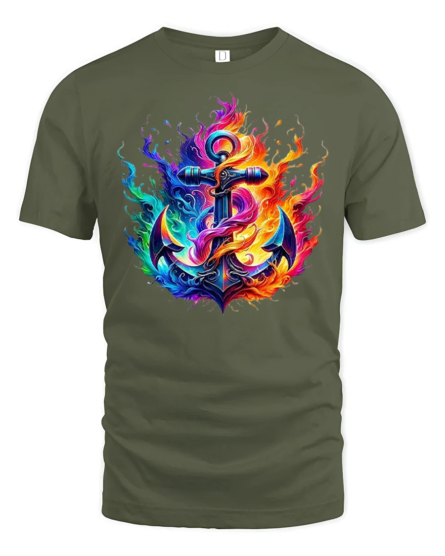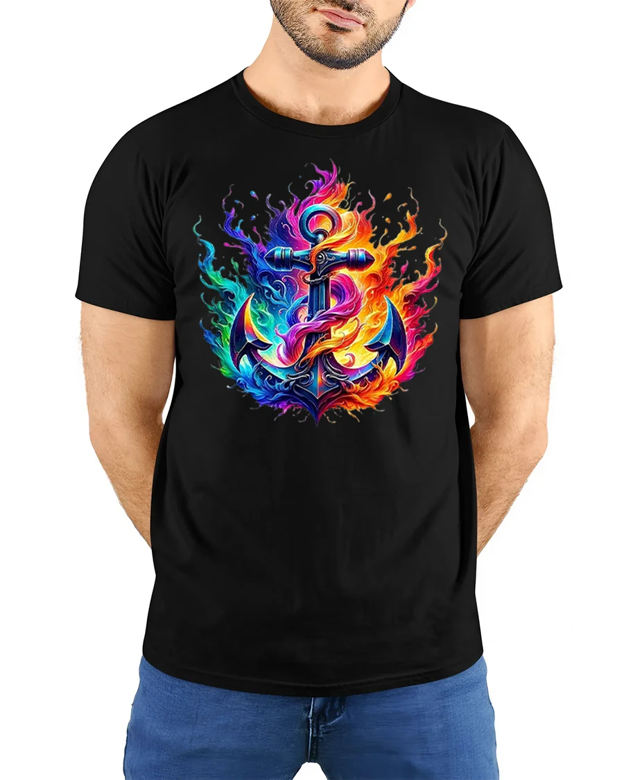 Colorful Flaming Anchor Graphic T Shirt blends nautical strength with explosive color in a bold artistic design. The detailed anchor is surrounded by swirling flames in vibrant rainbow tones, symbolizing power, stability, and unstoppable energy. This tshirt transforms a classic maritime emblem into a modern eye catching statement piece that stands out in any casual setting.