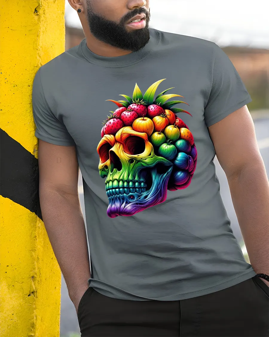 The Colorful Fruit Skull Art Graphic Tshirt With Bold Surreal Style is designed for comfort and everyday wear.