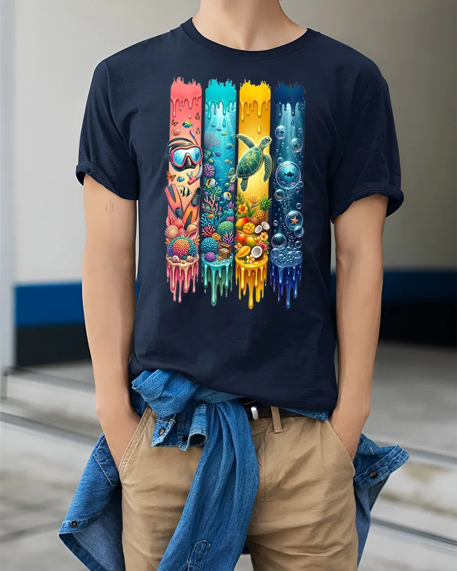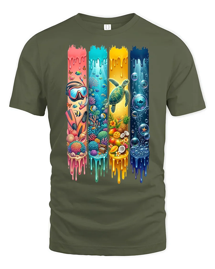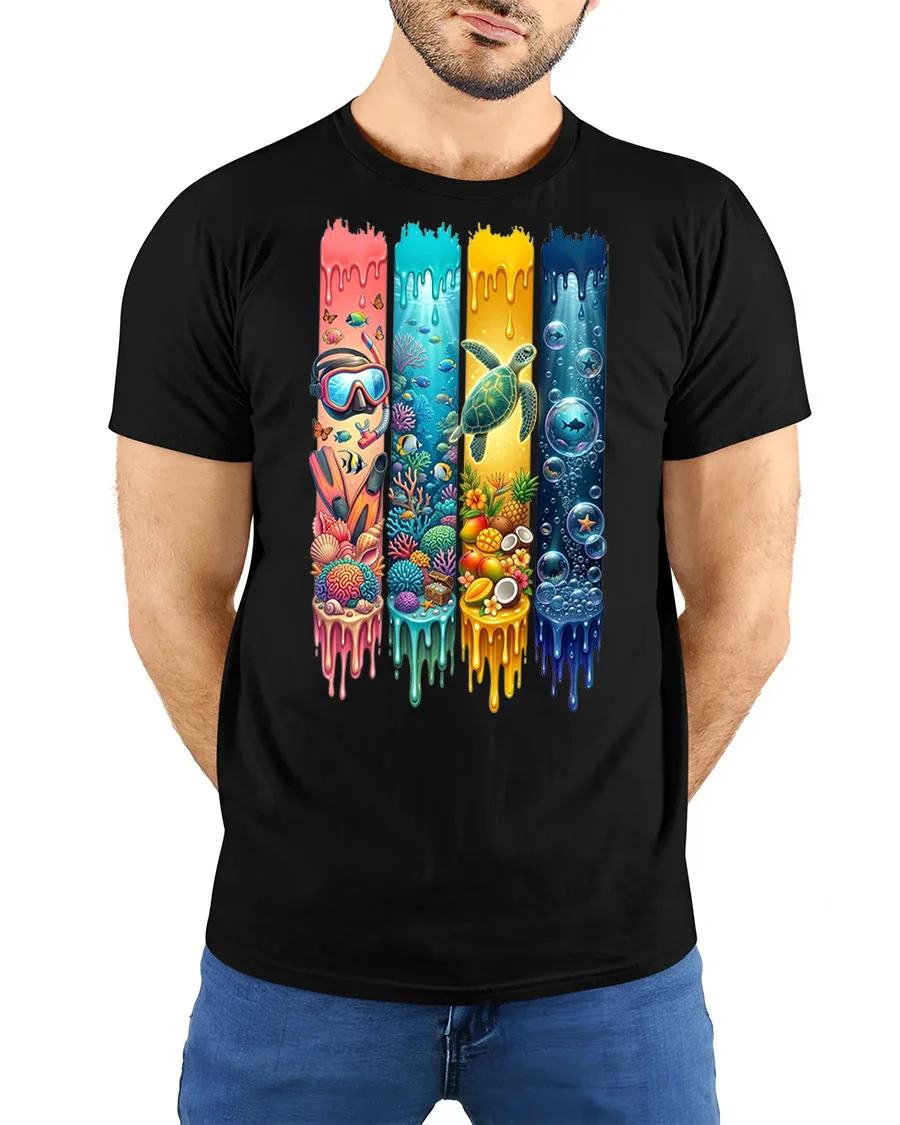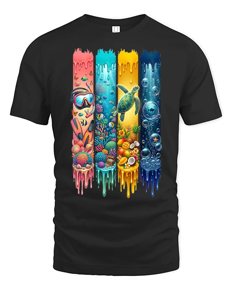 Colorful Ocean Adventure Dive Turtle Paradise Graphic T Shirt brings the beauty of the sea to your everyday style. This eye catching design features vibrant ocean scenes with scuba gear, coral reefs, tropical fruit, sea turtles, bubbles, and marine life in a bold dripping art effect. It is a fun statement piece that adds color and personality to any casual outfit.