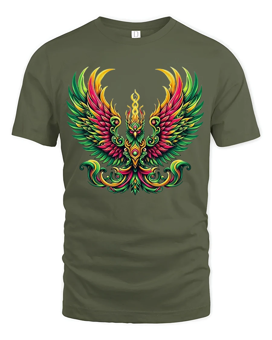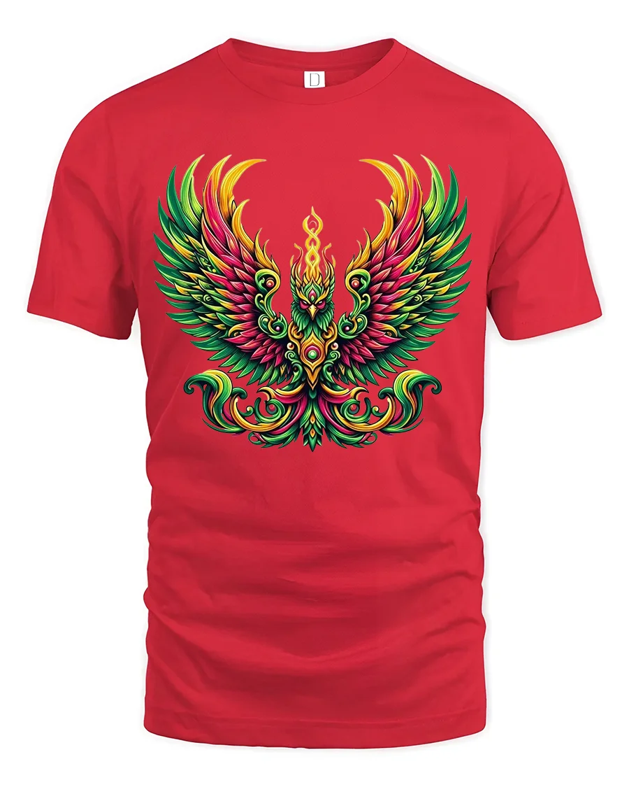 Colorful Phoenix Rising Fire Bird Graphic T Shirt features a stunning mythical phoenix with radiant wings and flowing flame details that symbolize rebirth, strength, and transformation. The vibrant blend of bold reds, greens, and golden tones creates a powerful visual impact that captures attention instantly. This artistic tshirt combines fantasy inspired illustration with modern graphic styling, making it a standout addition to any casual collection.
