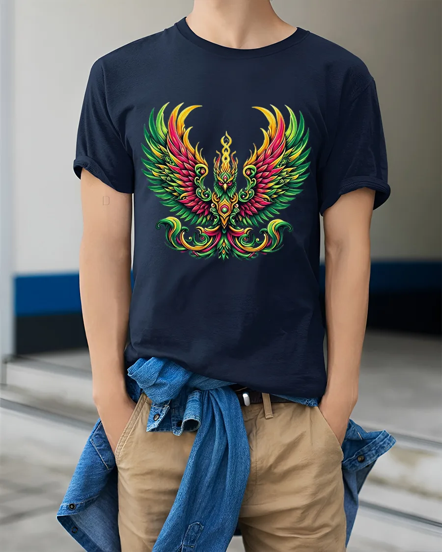 Crafted from soft breathable fabric, this tee delivers comfort throughout the day while maintaining sharp detail and vivid color. The dynamic winged design pairs easily with jeans, jackets, or layered streetwear looks, adding dramatic energy without overwhelming your style. The symmetrical composition gives it a balanced and confident appearance.