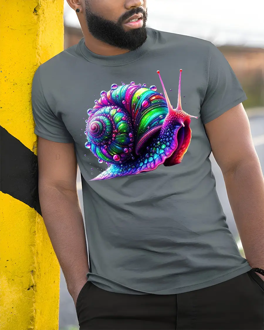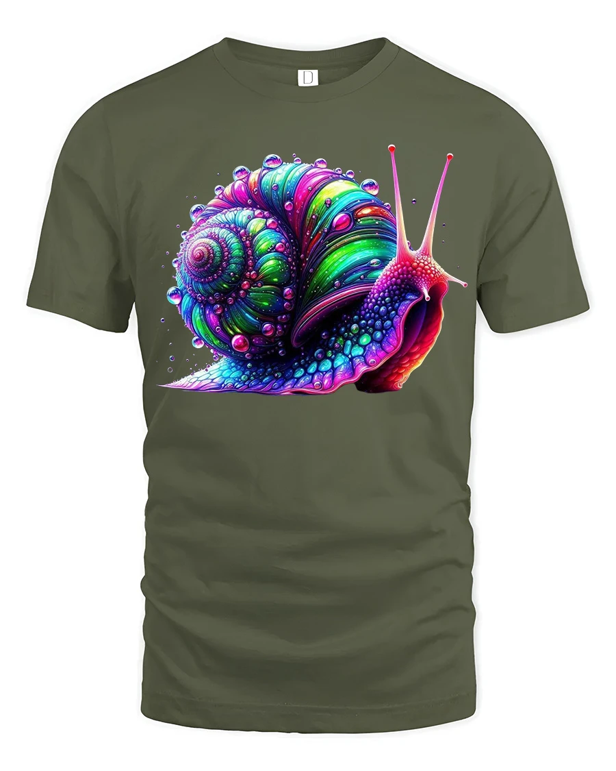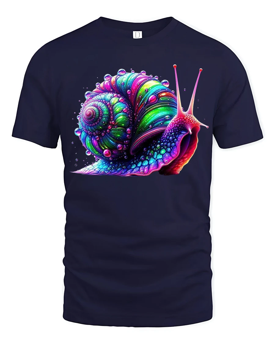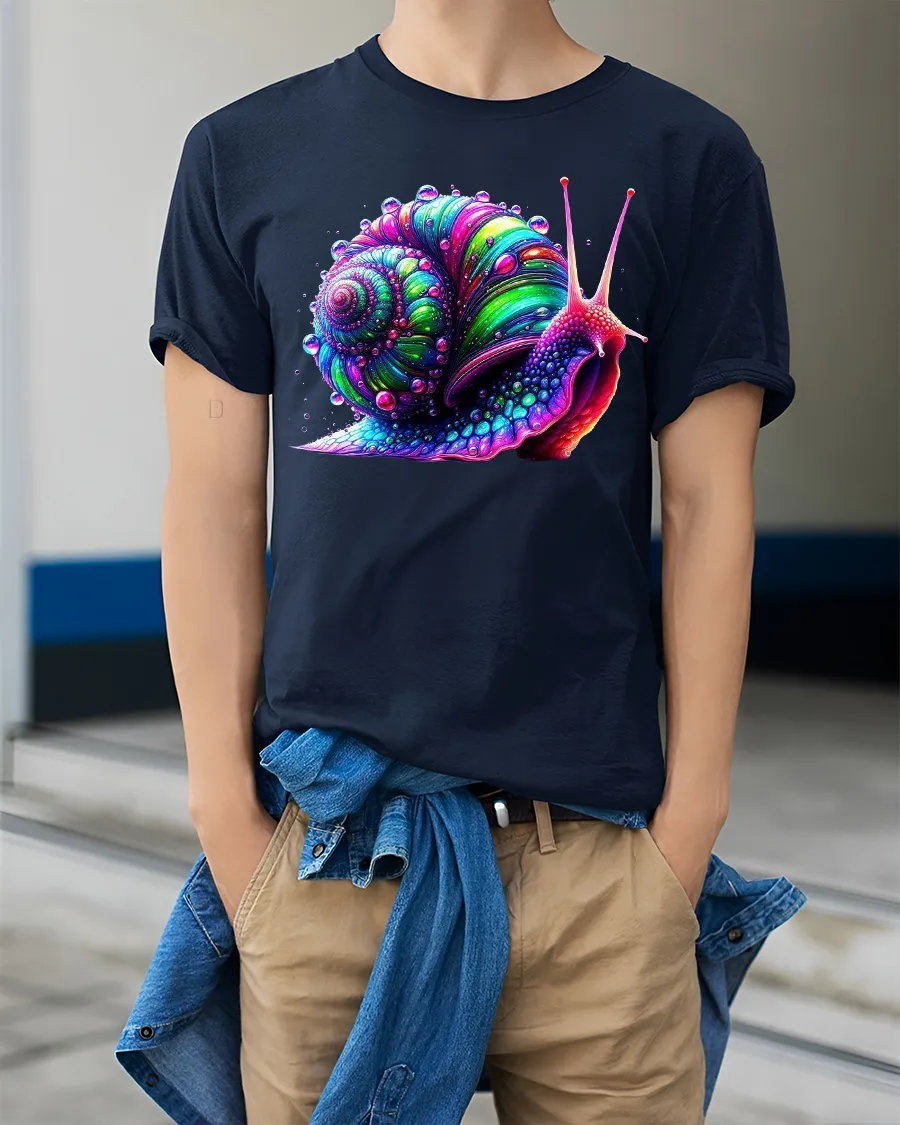 Colorful Psychedelic Snail Graphic T Shirt Trippy Art Tee features a vibrant and eye catching snail illustration with psychedelic colors and detailed spiral patterns. The bold neon style artwork creates a unique and artistic look that stands out and adds personality to any casual outfit. This graphic tee combines colorful design, creative art style, and a fun nature inspired theme into one visually striking shirt.