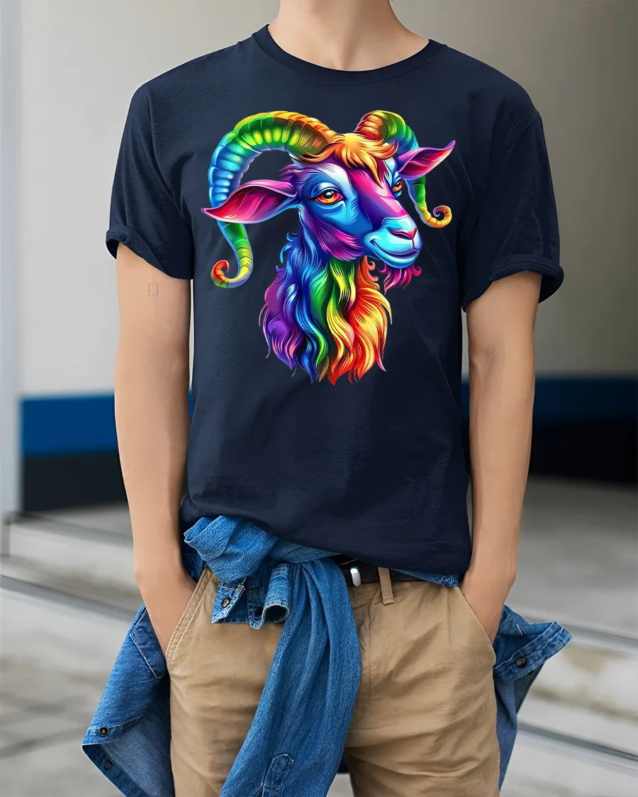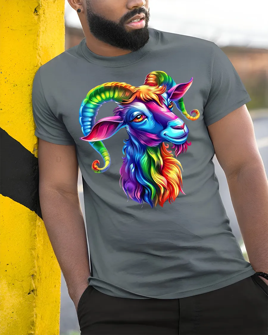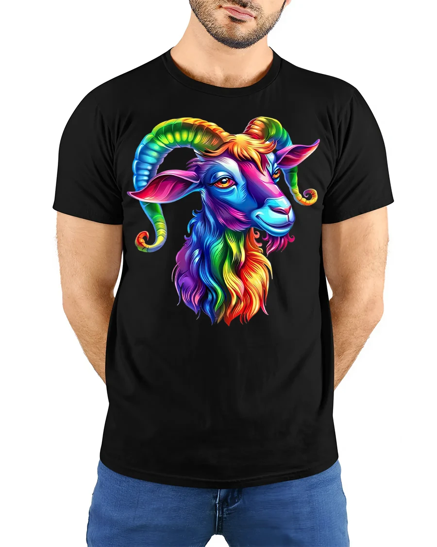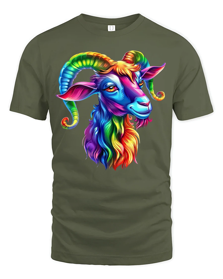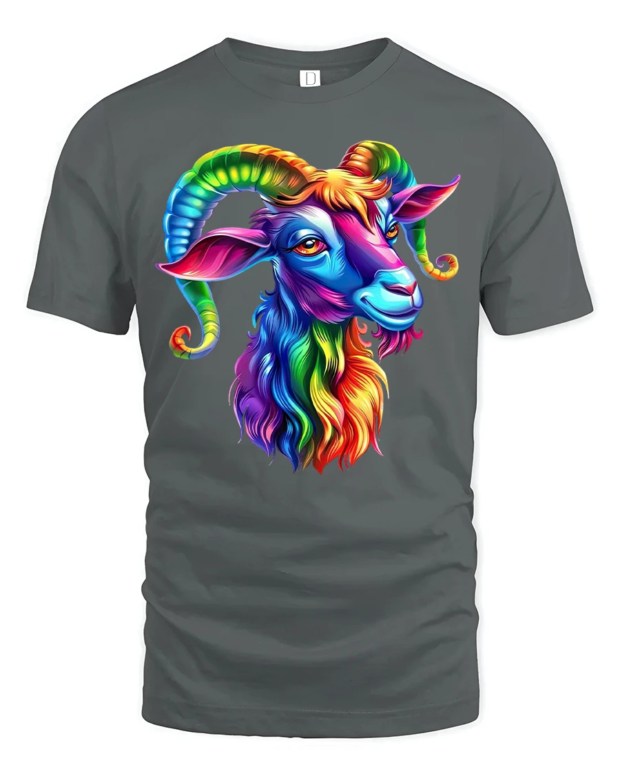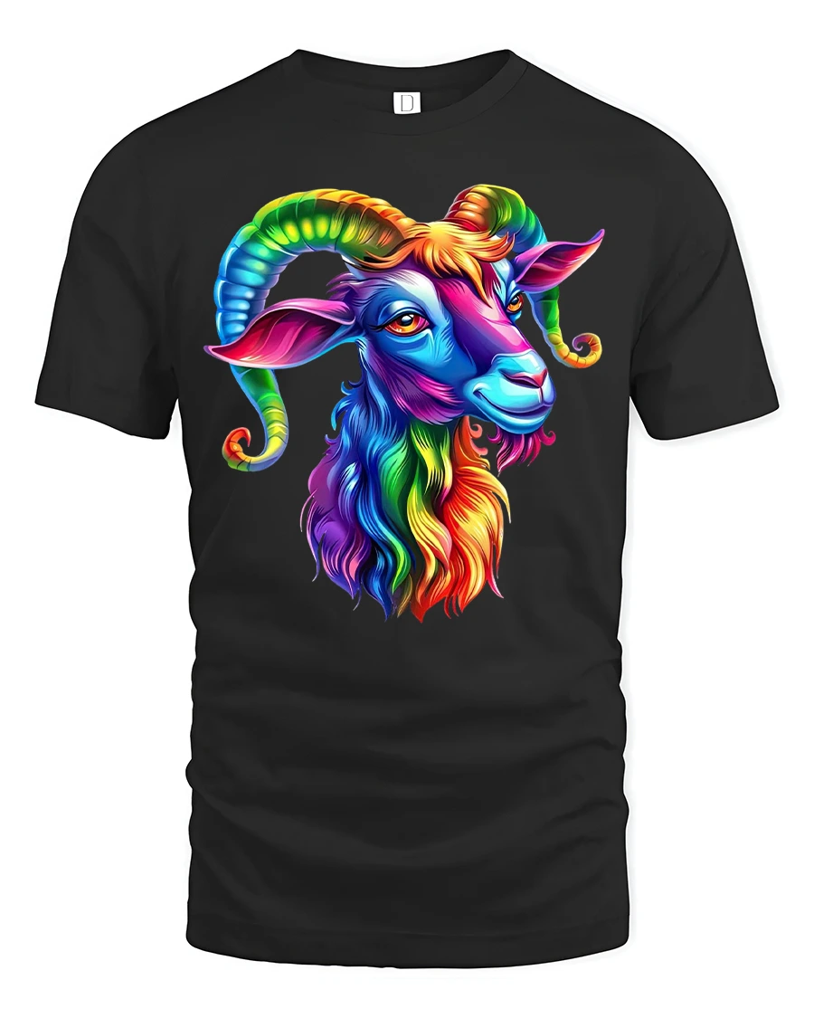 The Colorful Rainbow Goat Art Tee With Bold Fantasy Animal Style is ideal for those who enjoy expressive fashion and bold artistic themes.