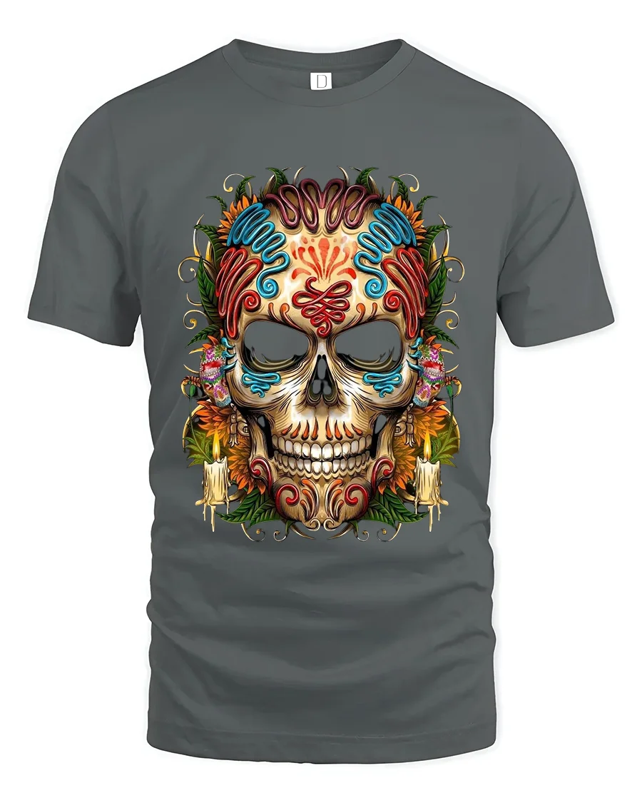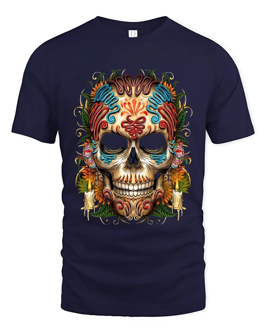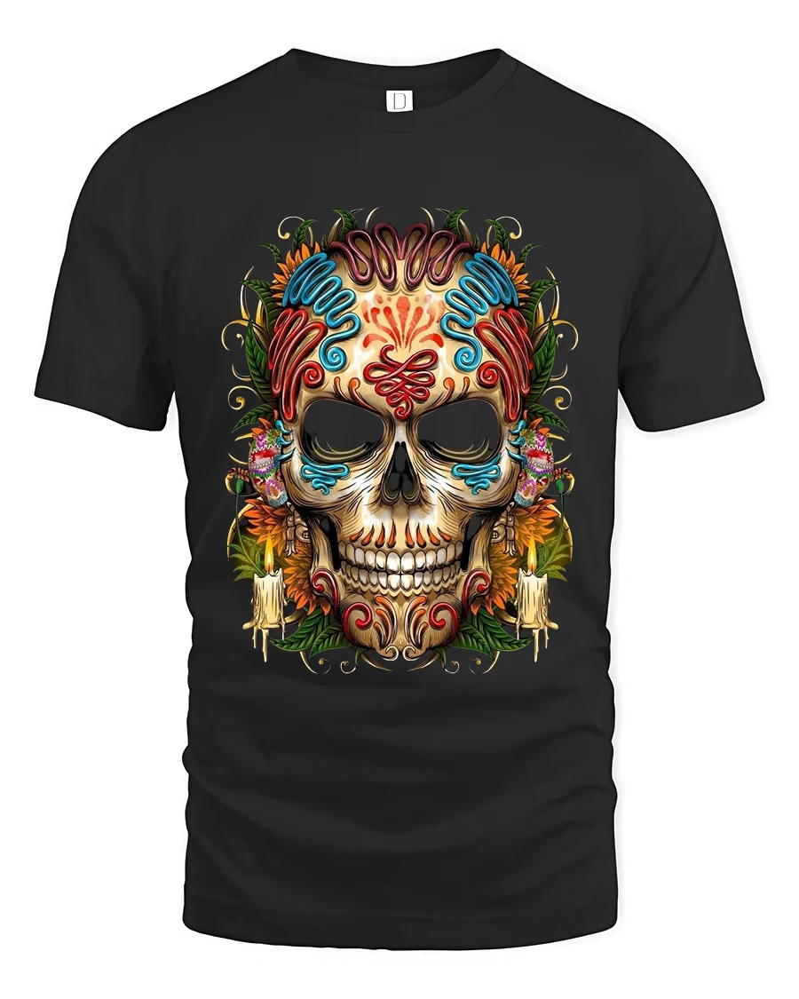Colorful Sugar Skull Day Of The Dead Graphic T Shirt showcases a beautifully detailed calavera design inspired by traditional festive art. The intricate patterns, vibrant colors, floral accents, and candle details create a bold and eye catching composition that celebrates creativity and cultural style. This striking skull illustration stands out with rich decorative elements that make it a true statement piece in any casual outfit.
