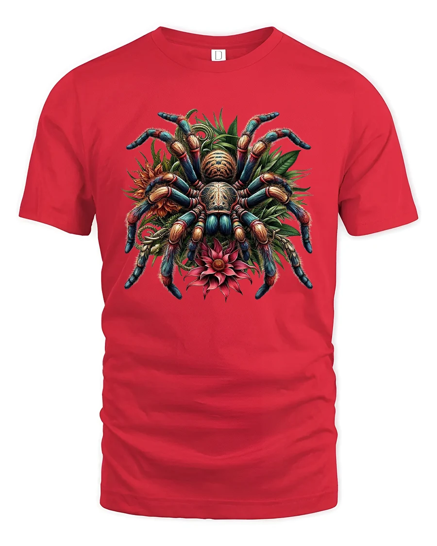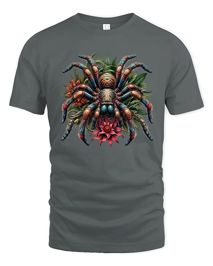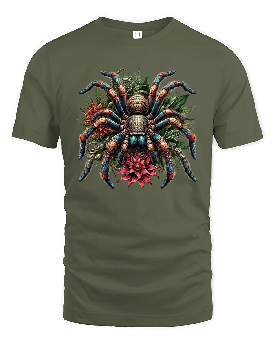 Colorful Tarantula Floral Illustration Graphic Tshirt Nature Art blends bold wildlife imagery with elegant botanical details to create a truly eye catching design.