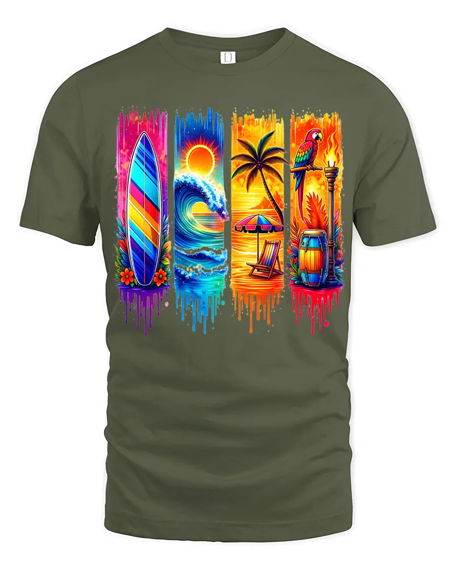 This tropical beach tshirt celebrates the relaxed lifestyle of surf culture and coastal adventures.