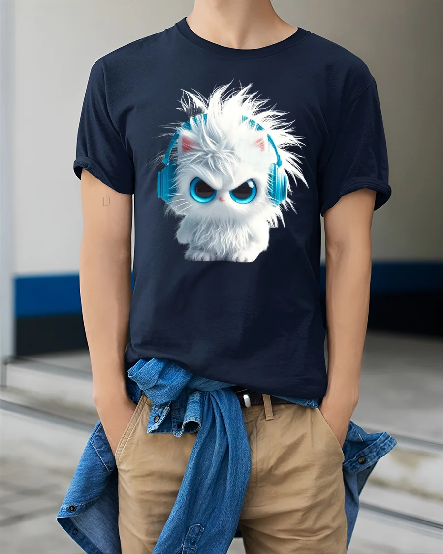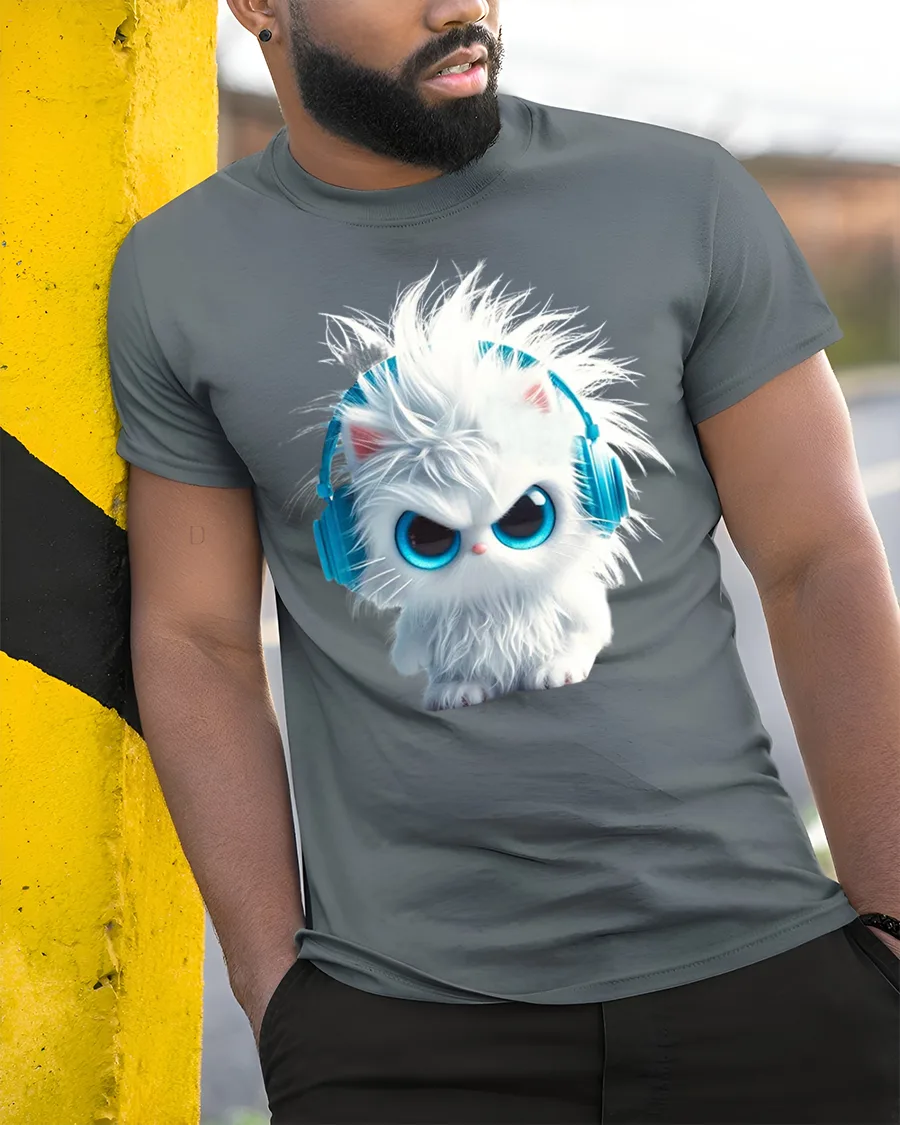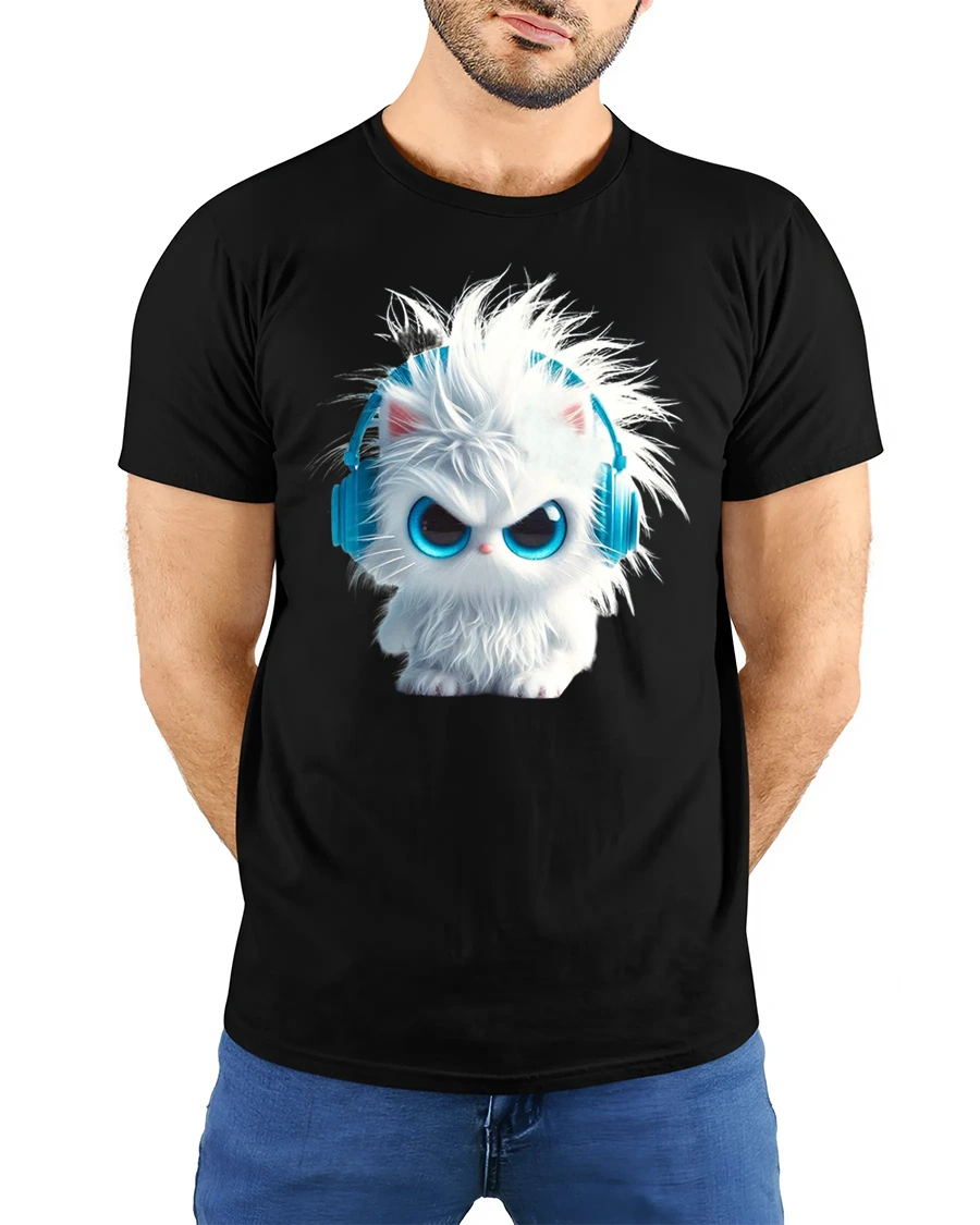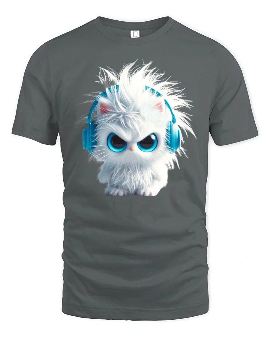 Featuring a fluffy white cat with wild hair and glowing blue headphones, this tee captures the perfect mood for anyone who loves beats, cats, and bold style.