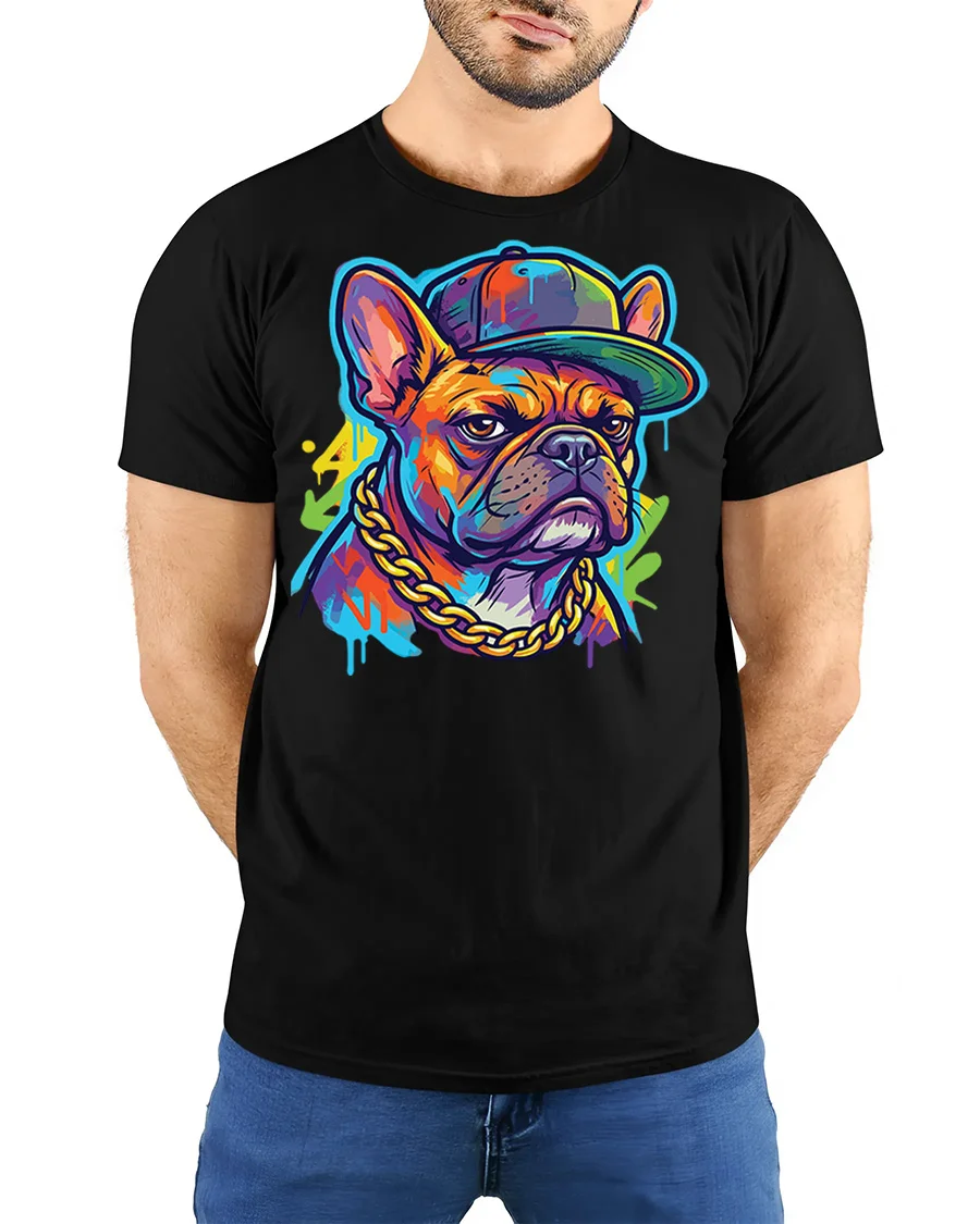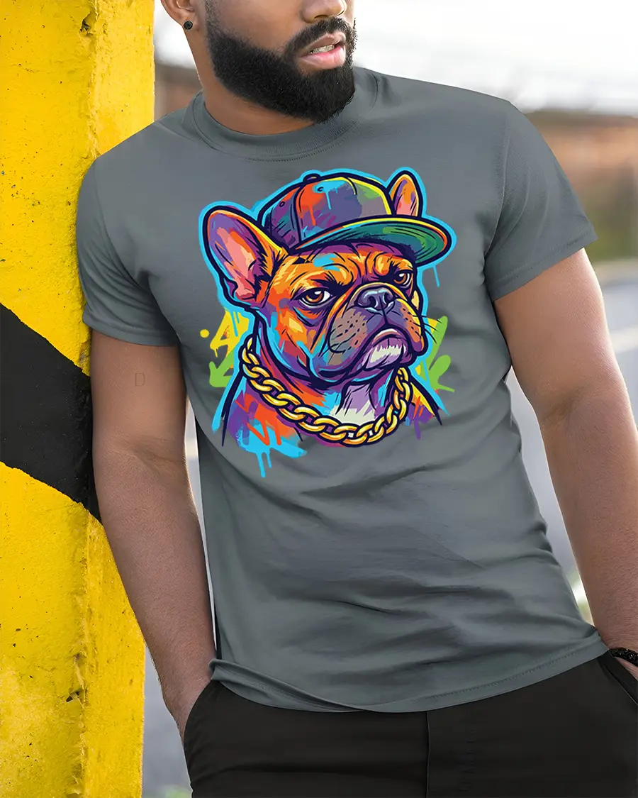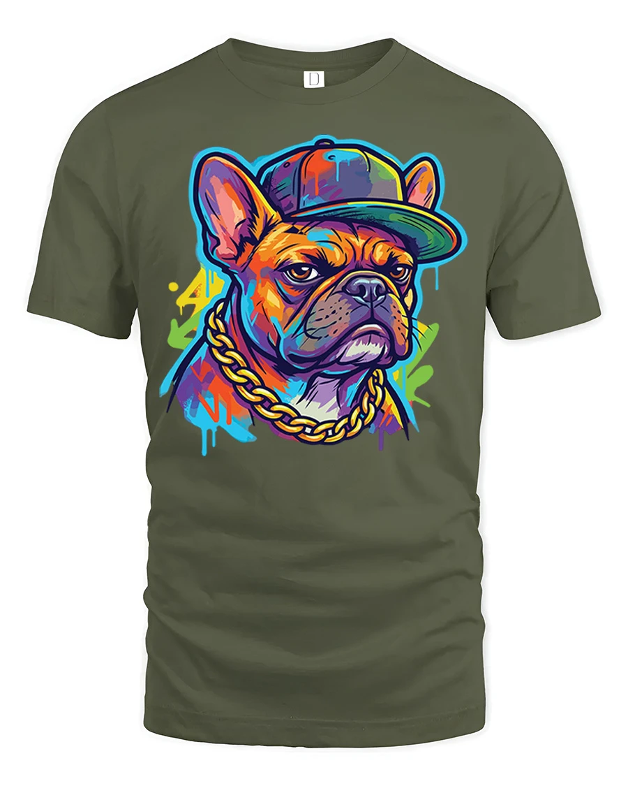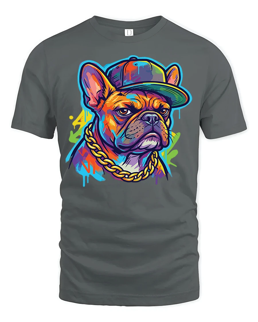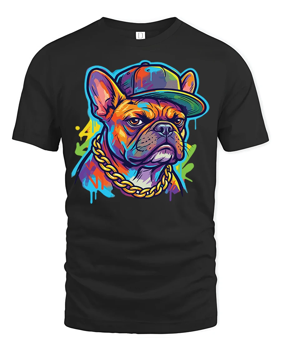 Featuring a confident French bulldog wearing a cap and chain, this graphic captures street culture and modern artistic flair in a fun and eye catching way.