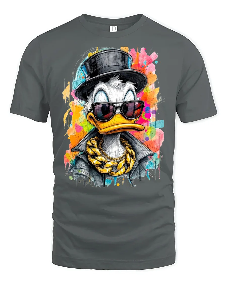 The artwork features a stylish duck rocking sunglasses, a top hat, and a chunky gold chain, surrounded by vibrant graffiti splashes that add energy and attitude.