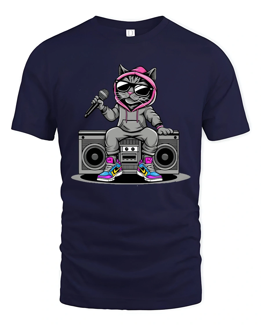 This Cool Rapper Cat Graphic T Shirt features a stylish cartoon cat rocking a hoodie sunglasses and microphone while sitting on a classic boombox.