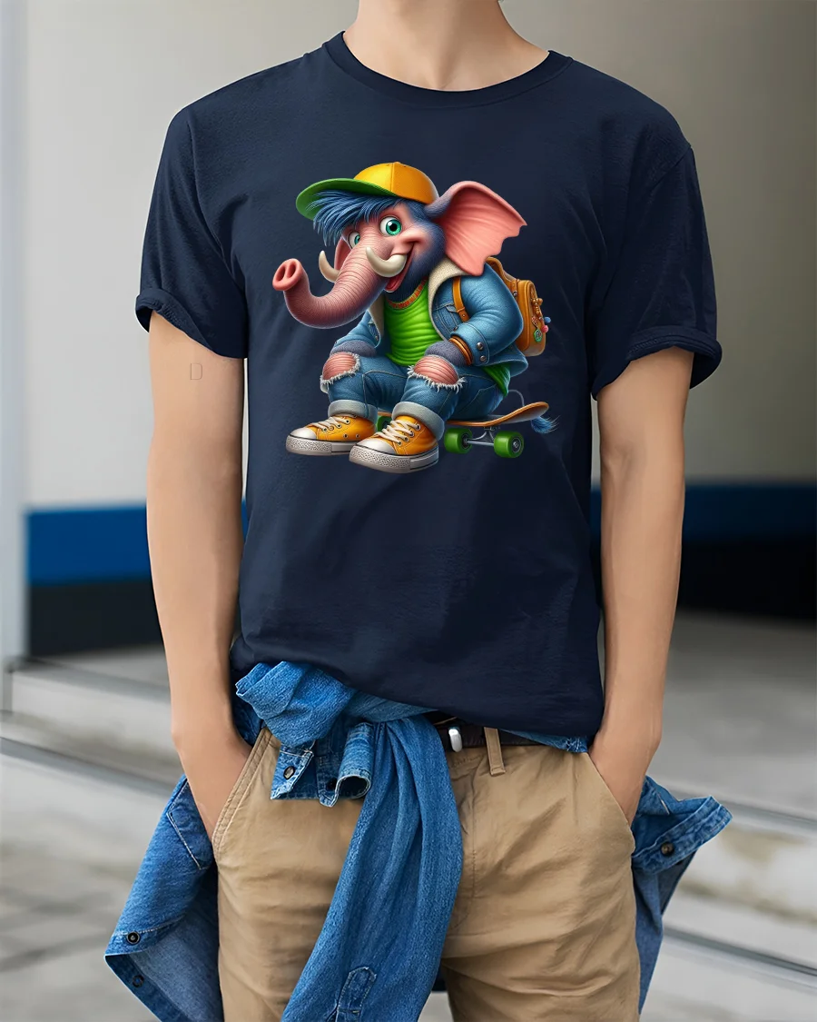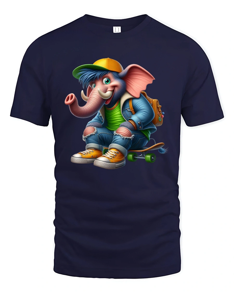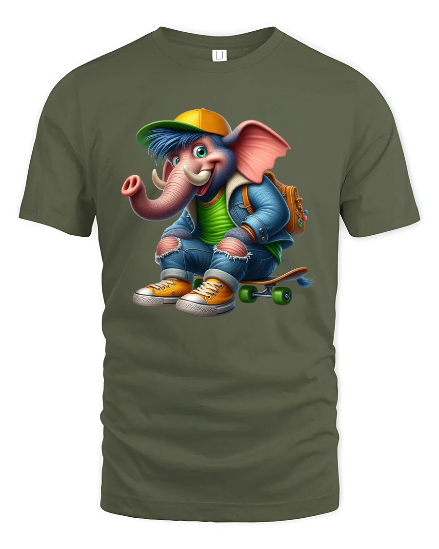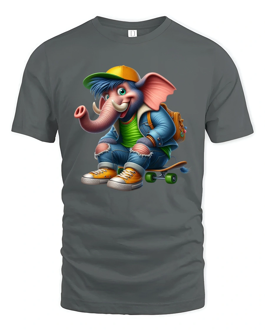 The playful elephant character riding a skateboard adds a fun cartoon twist that instantly stands out in any casual setting.