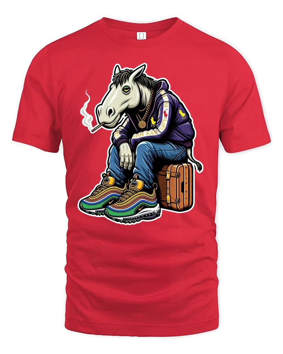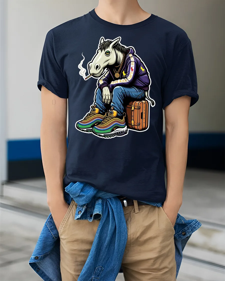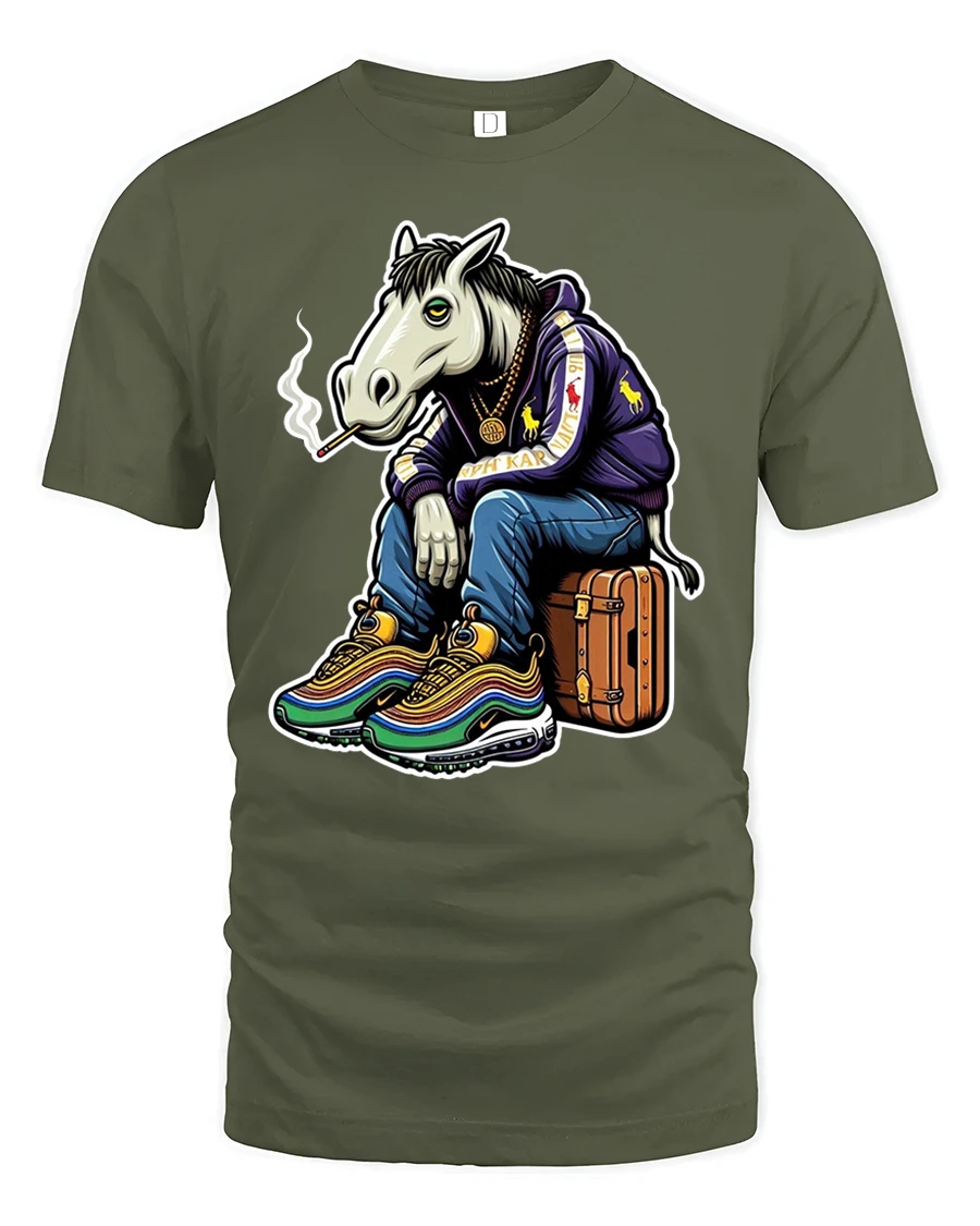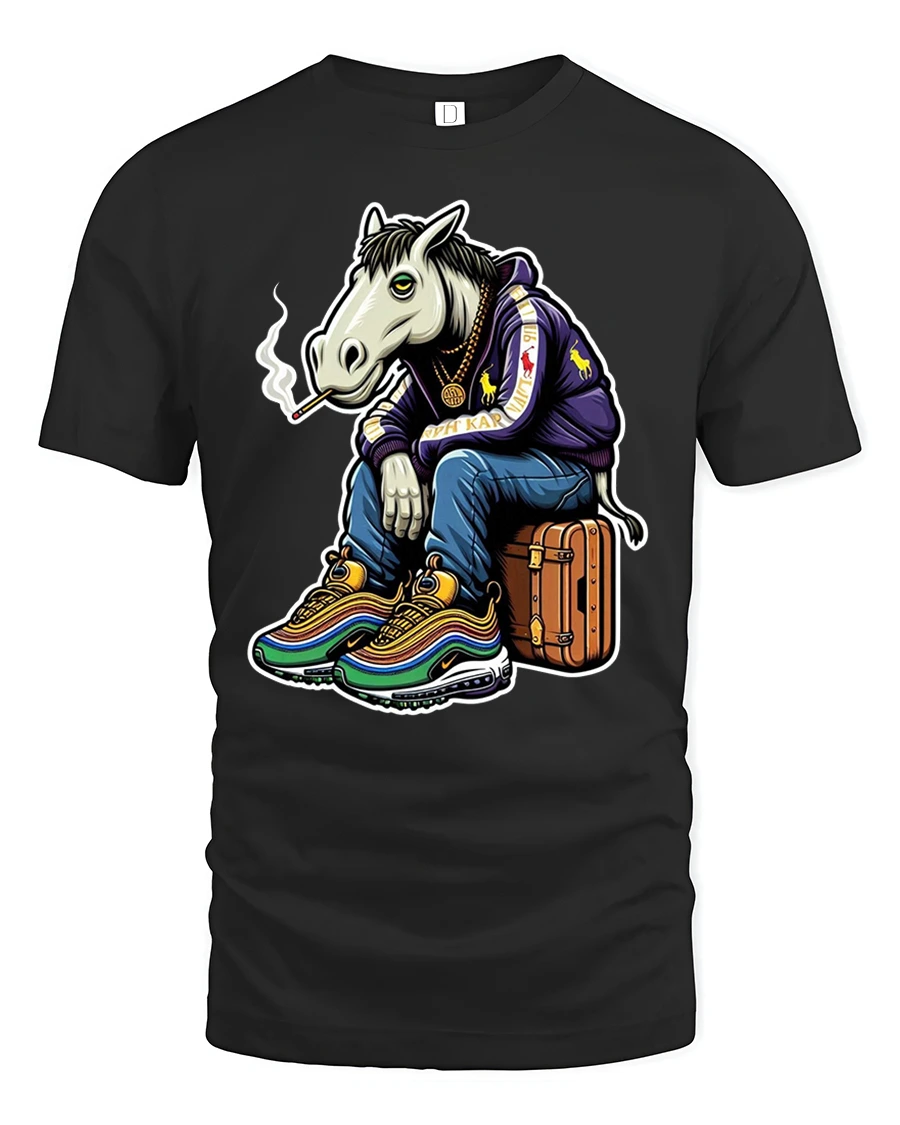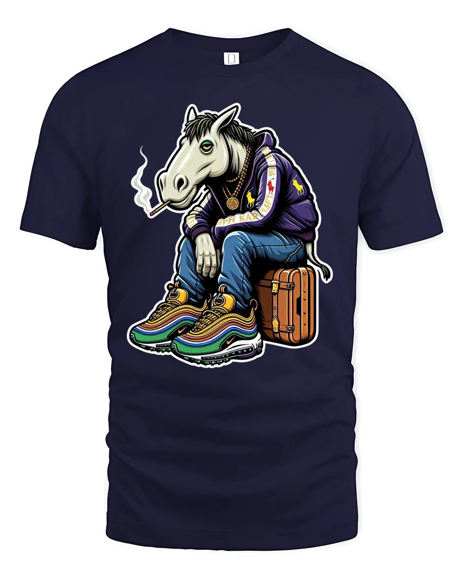 This design features a relaxed cartoon horse with a cigarette capturing an effortless urban attitude.