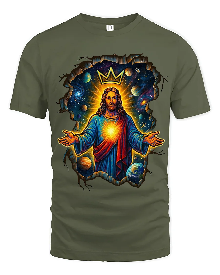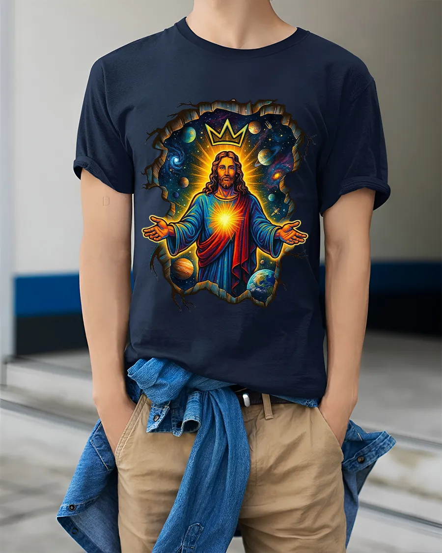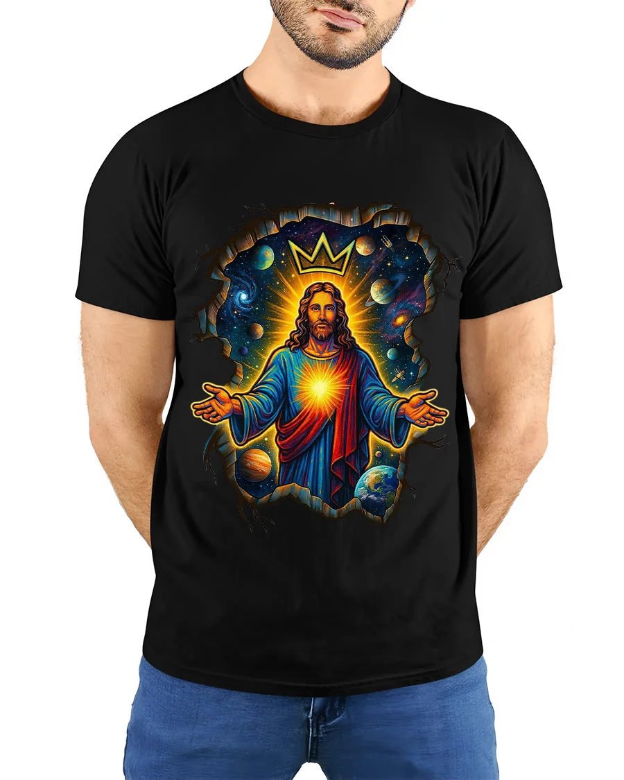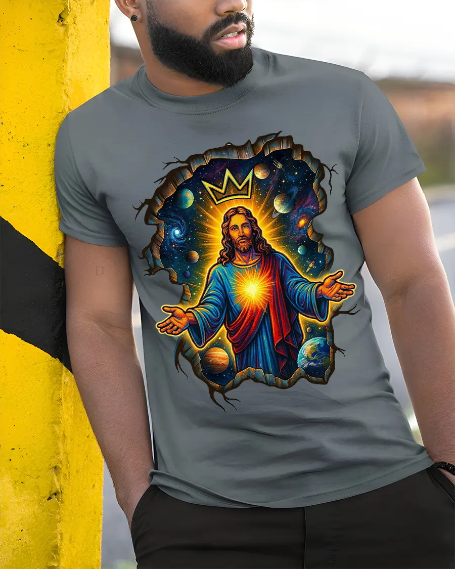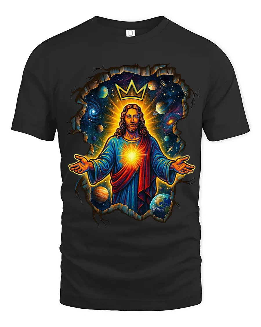 The Cosmic King Jesus Crowned Galaxy Art Graphic Tshirt delivers a powerful blend of faith art and cosmic imagination.