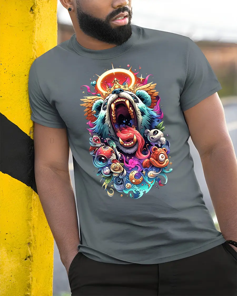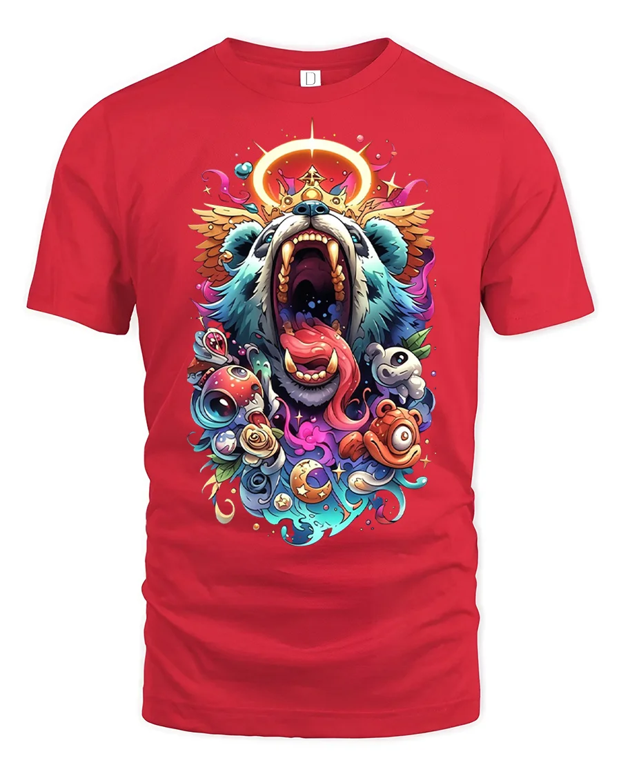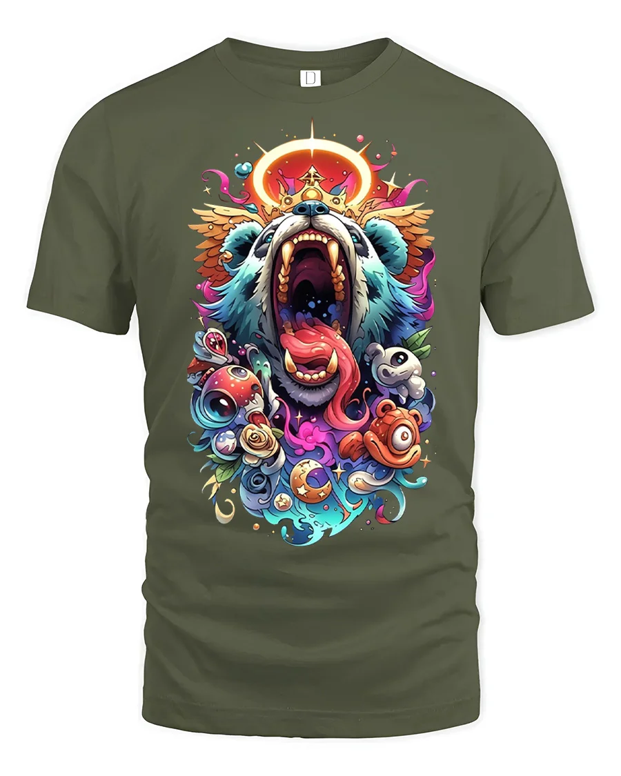 Featuring a vibrant roaring bear surrounded by surreal cosmic elements, this design blends fantasy, street art, and playful energy into one eye catching statement piece.