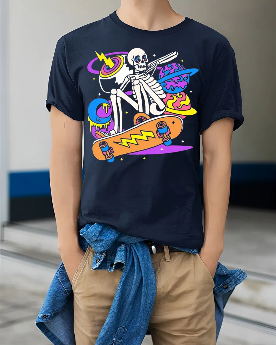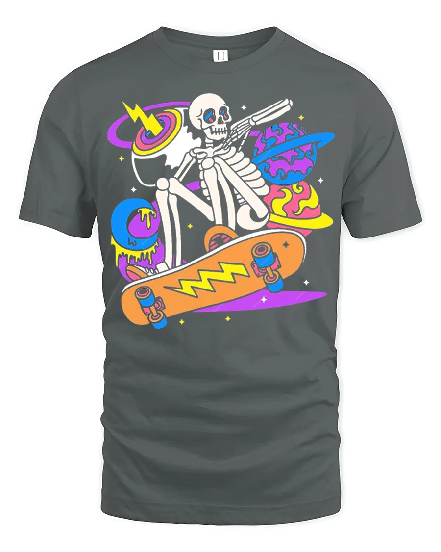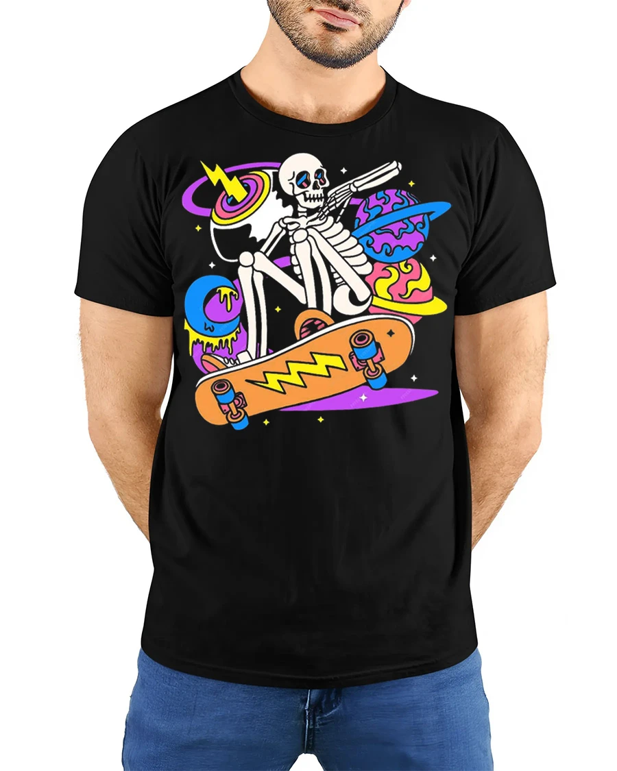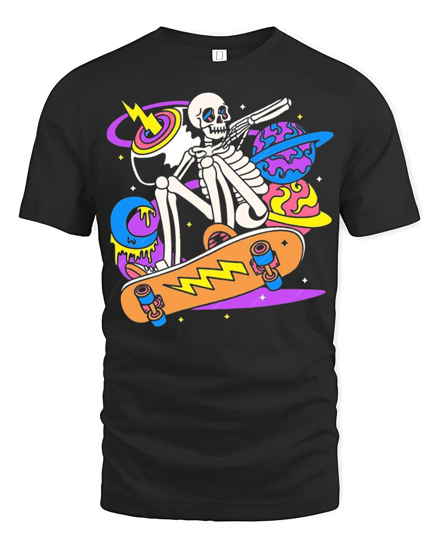 Cosmic Skeleton Skateboard Retro Space Graphic T Shirt Style delivers bold streetwear energy with a playful cosmic twist. Featuring a skateboarding skeleton surrounded by colorful planets, stars, and neon shapes, this design blends humor, action, and retro vibes into one standout look. It is the perfect graphic tee to show off your fun and fearless style.