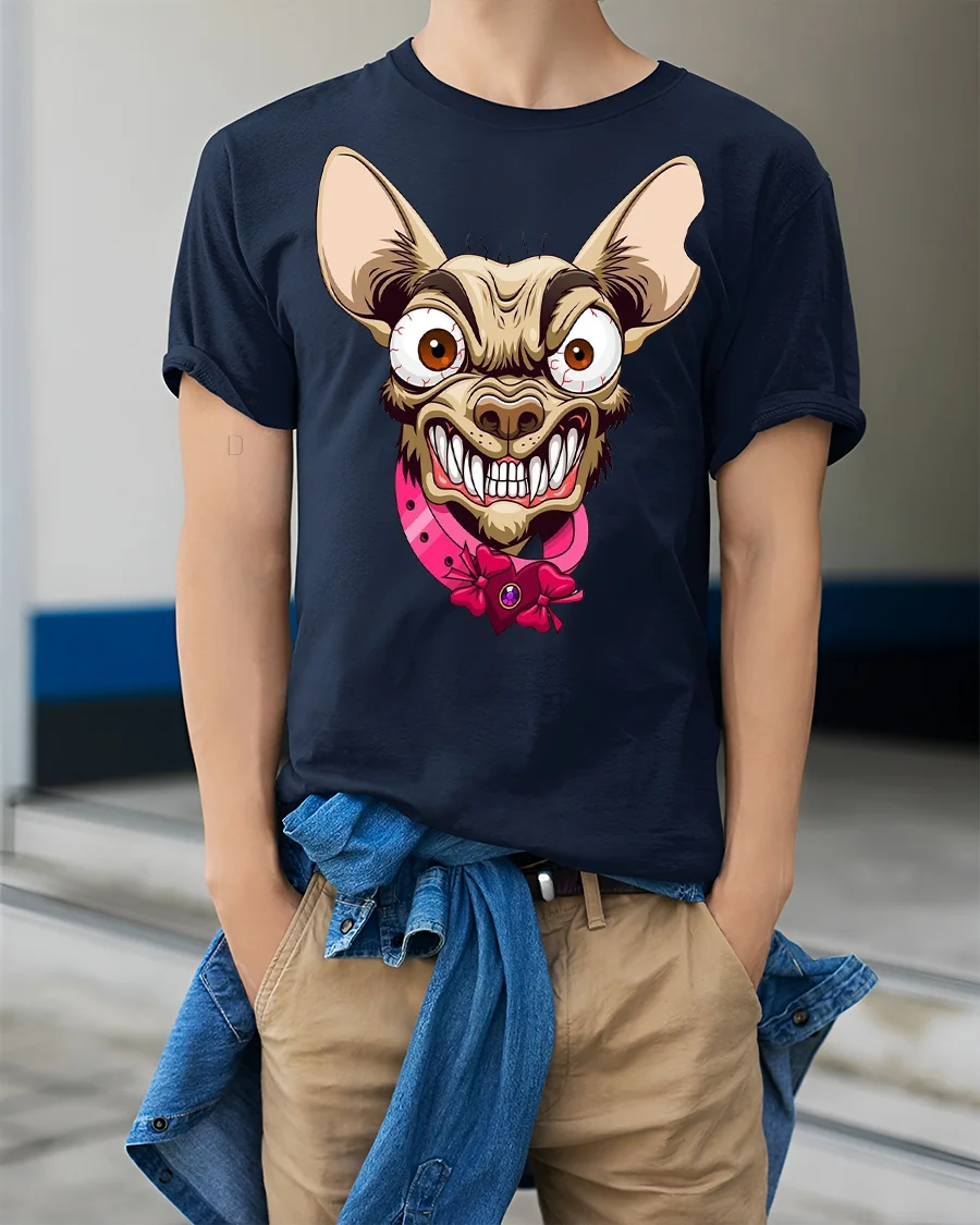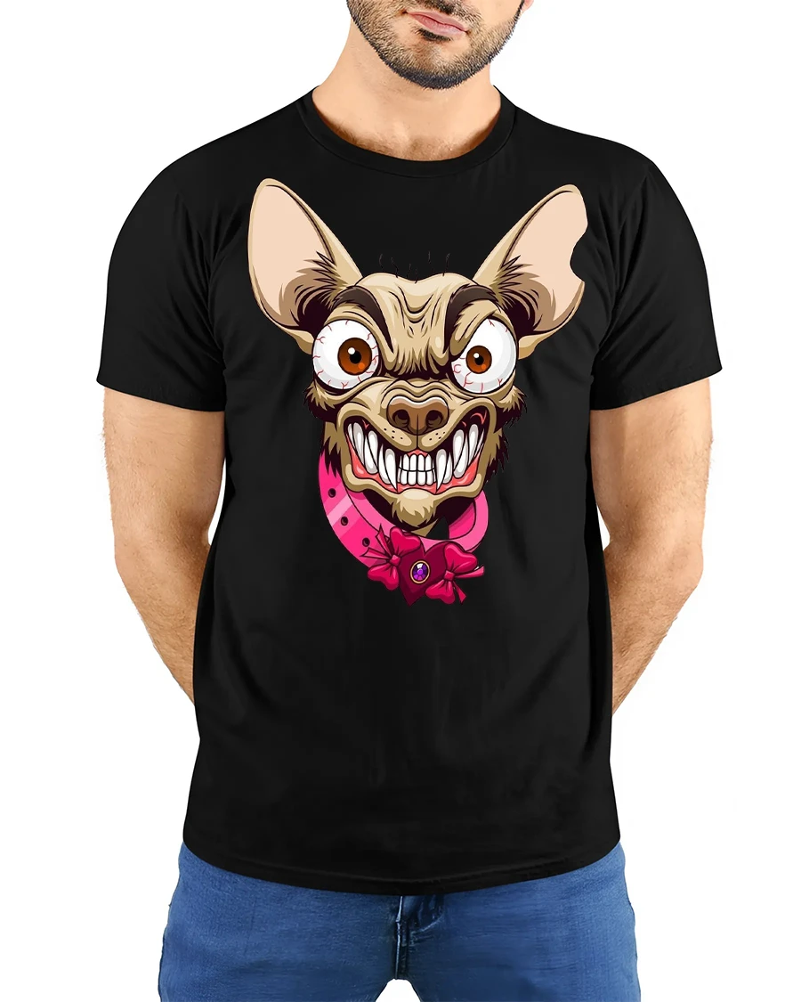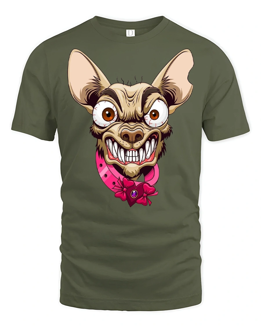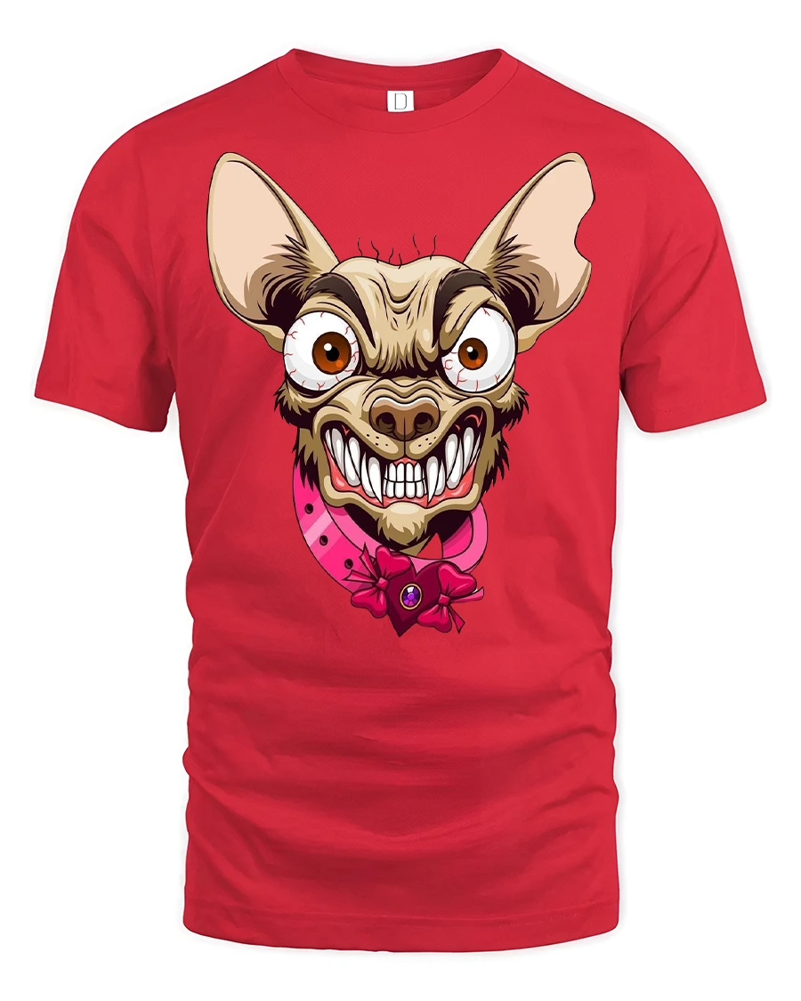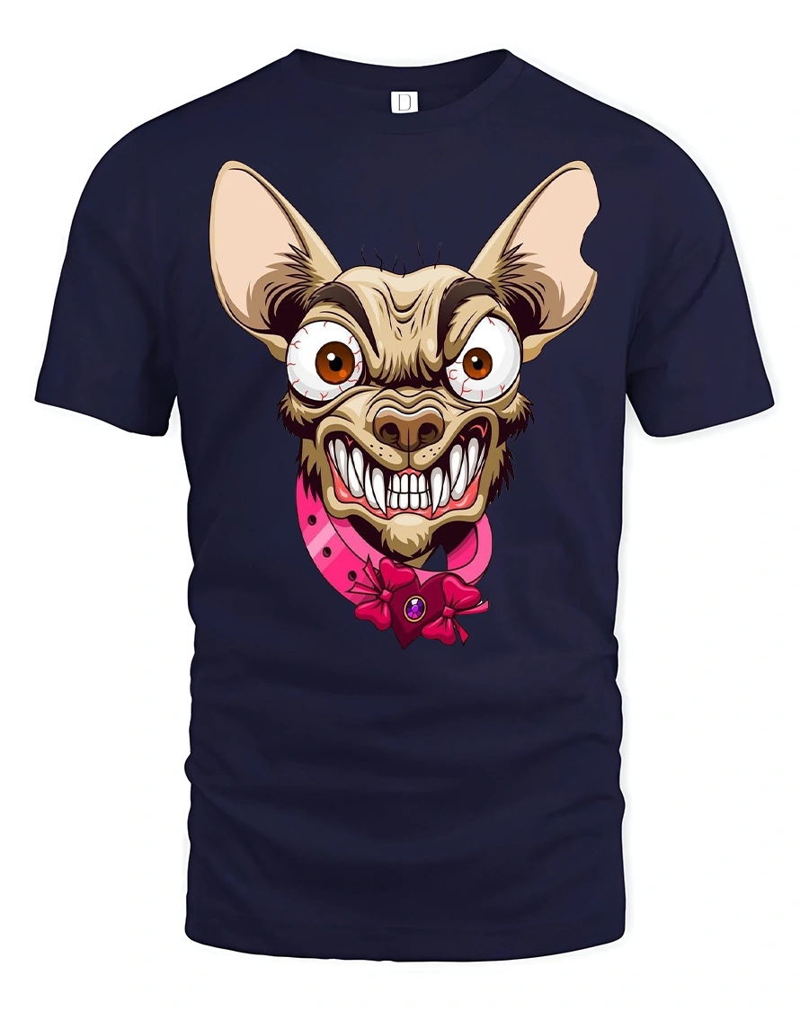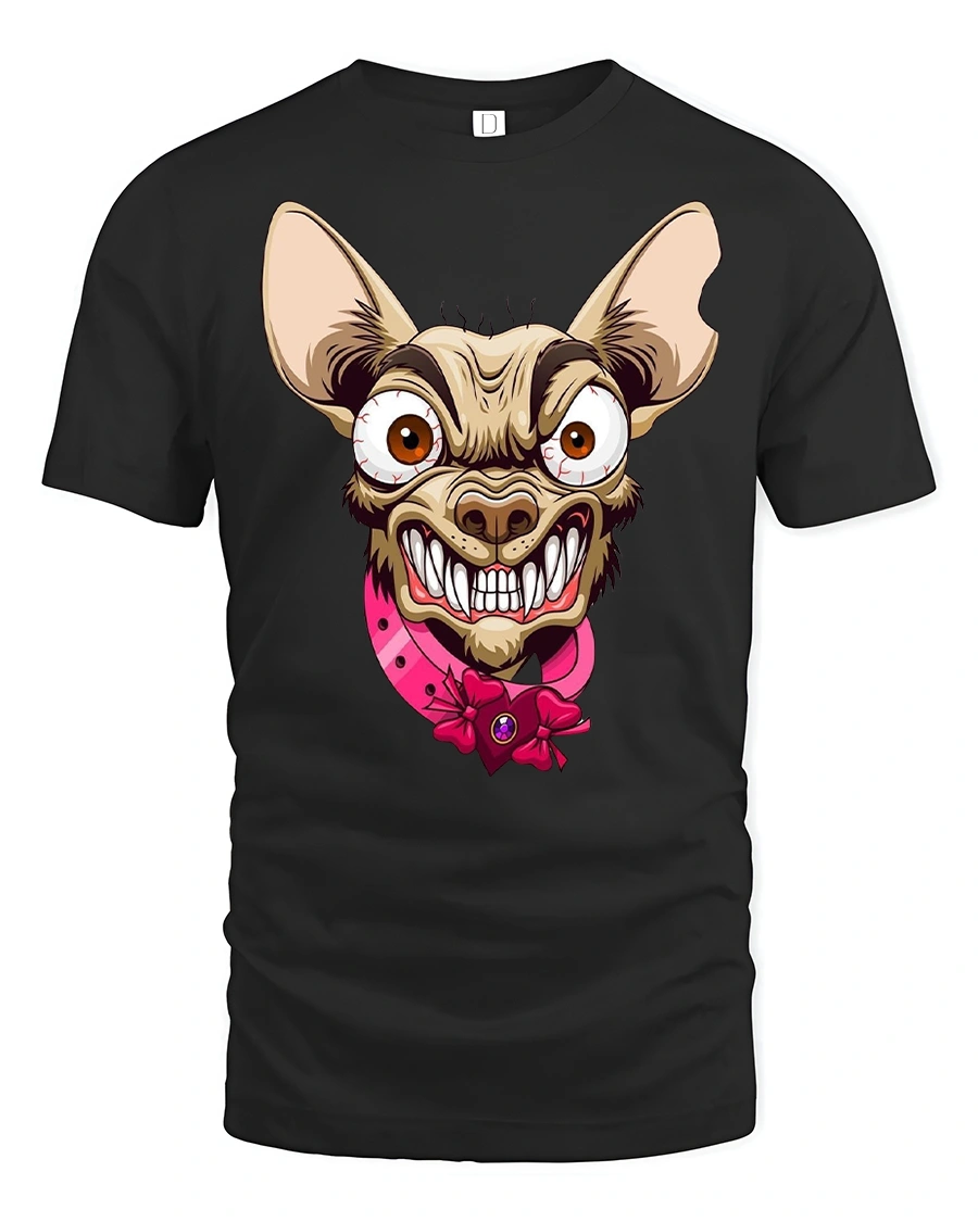 Crazy Chihuahua Funny Face Graphic T-Shirt is the ultimate choice for dog lovers who enjoy a bold sense of humor. Featuring a wild-eyed chihuahua with an exaggerated grin, complete with a pink jeweled collar and bow, this design is both hilarious and attention-grabbing. The vivid colors and detailed cartoon style make it perfect for those who love quirky, out-of-the-box fashion.