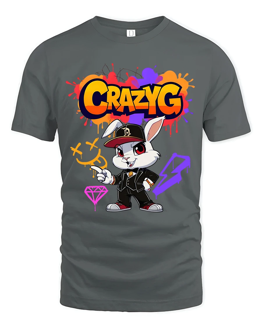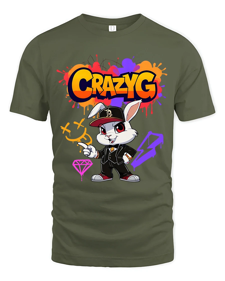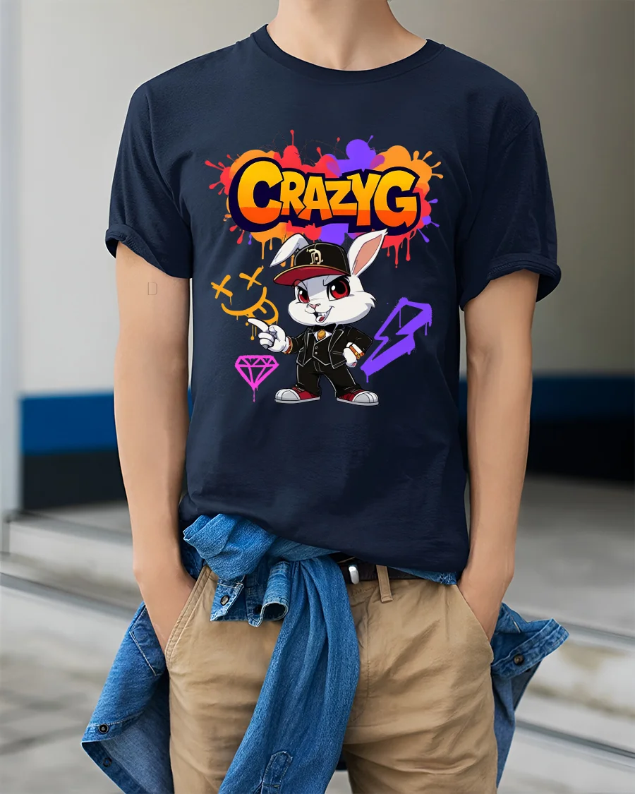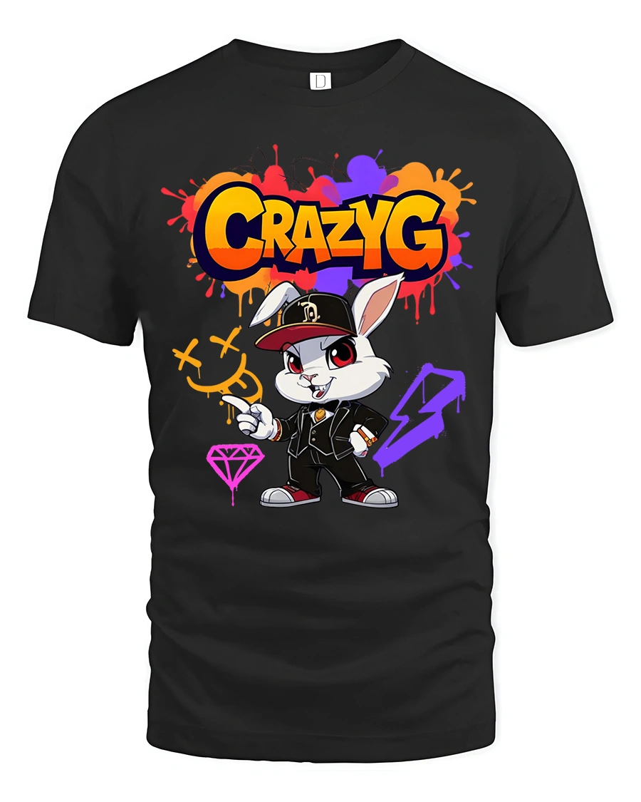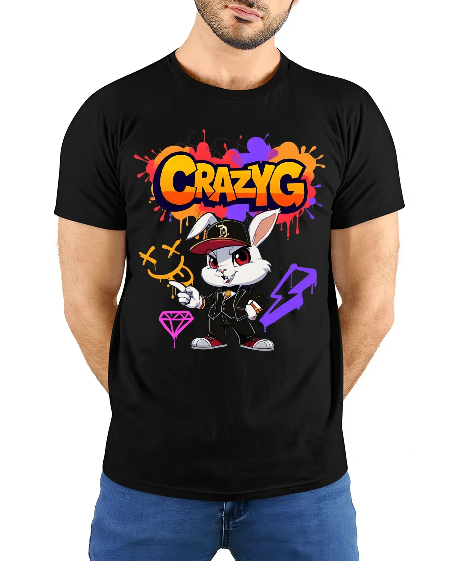 Crazy G Street Style Bunny Graphic T Shirt brings bold urban energy and playful attitude together in one eye catching design. Featuring a confident cartoon bunny dressed in streetwear with vibrant graffiti inspired details, this artwork delivers a strong hip hop vibe with colorful splashes and expressive character style. The dynamic typography and edgy art elements create a standout look that instantly grabs attention.