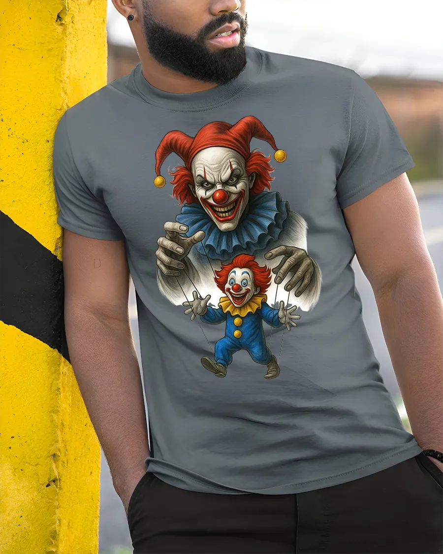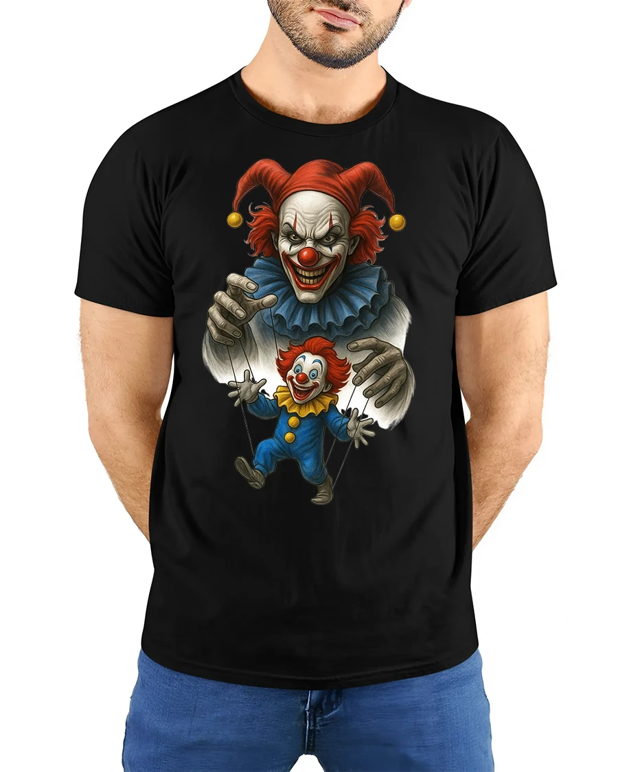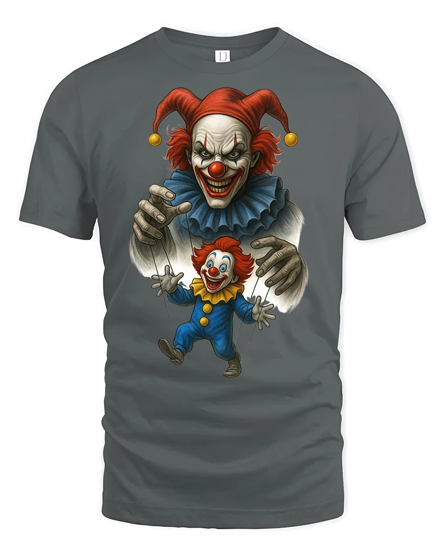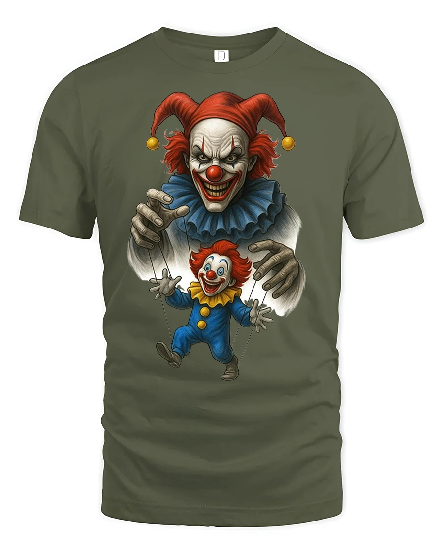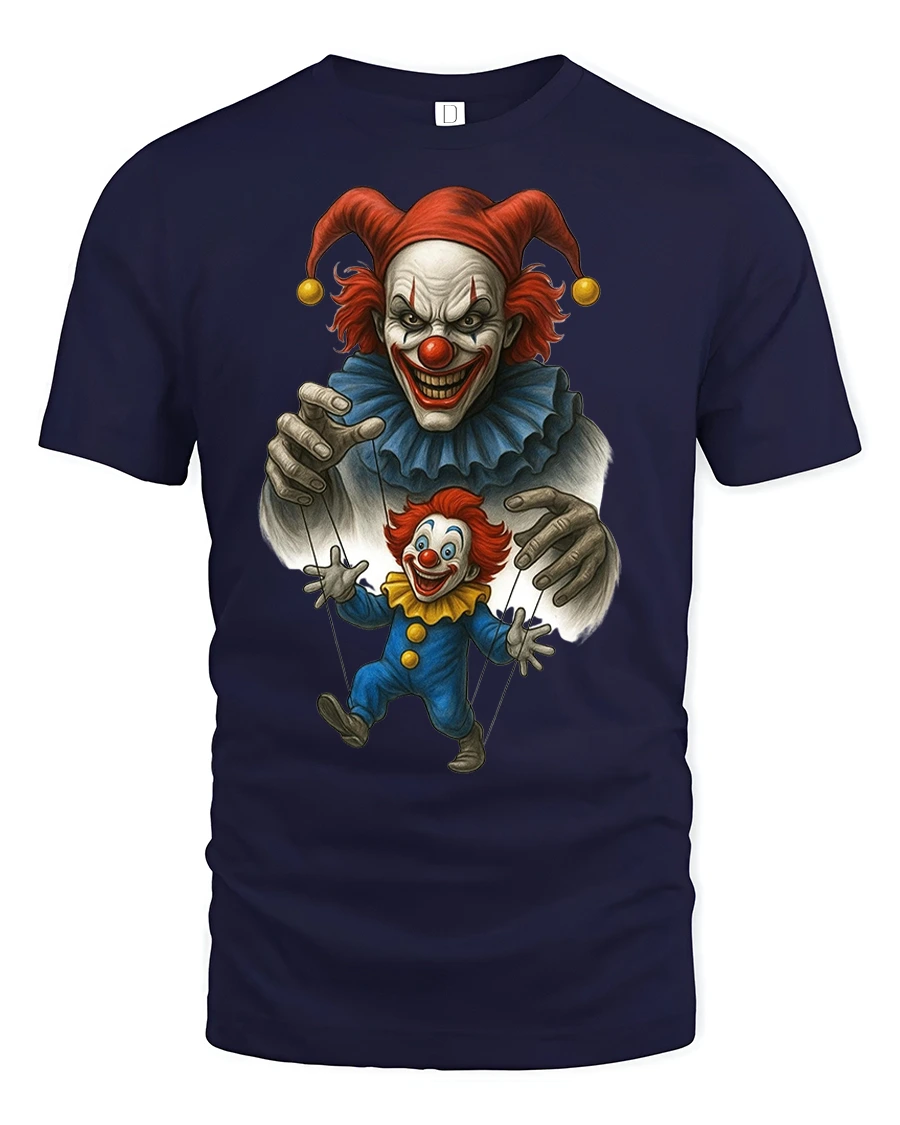 Creepy Clown Puppet Tee with Spooky Marionette Horror Art brings chilling circus vibes and eerie storytelling to your wardrobe. Featuring a sinister clown controlling a smaller marionette version of itself, this design creates a haunting and eye-catching visual perfect for horror fans. The detailed artwork, expressive clown faces, dramatic shadows, and puppet strings give the design an unsettling yet captivating look that stands out instantly.