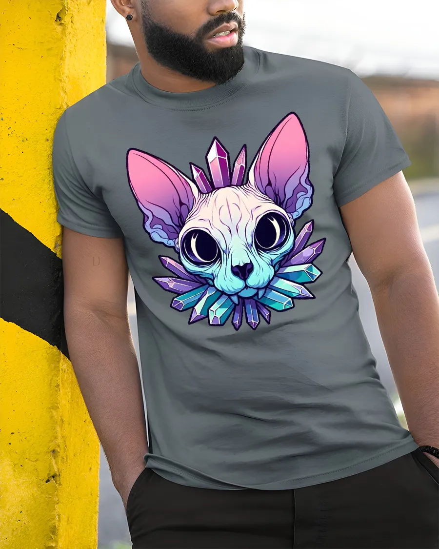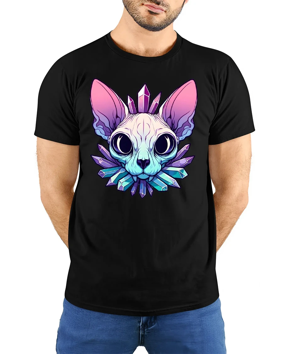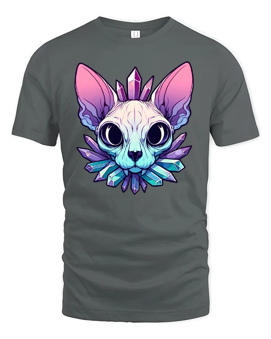 Featuring a glowing Sphynx cat surrounded by shimmering blue and purple crystals, this artwork radiates energy, mystery, and style.