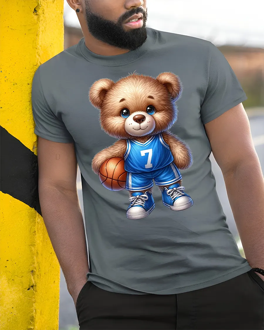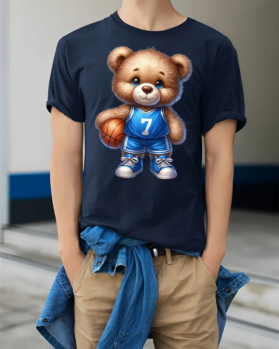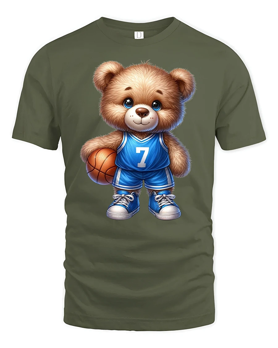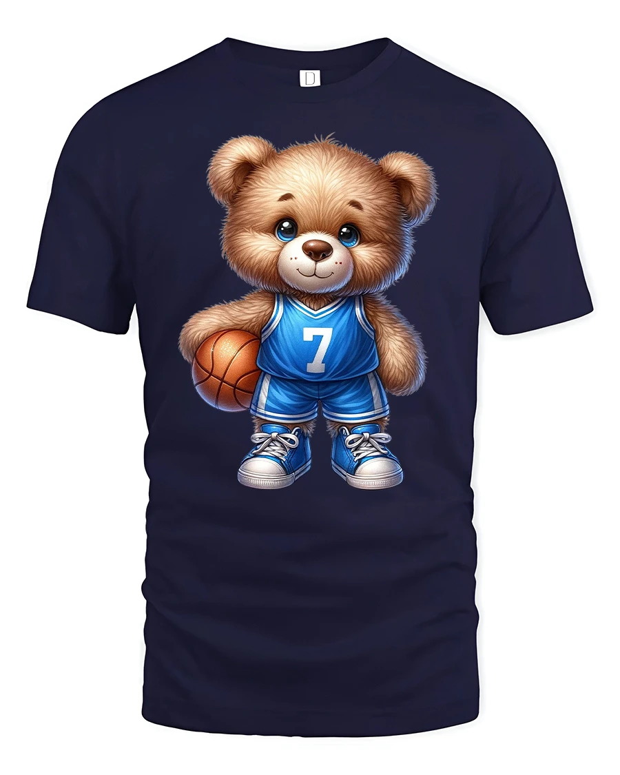 Cute Basketball Teddy Bear Player Graphic Tee brings together the charm of an adorable teddy bear with the excitement of the game. Featuring a fluffy brown bear dressed in a bright blue basketball jersey and holding a ball, this design is perfect for basketball lovers of all ages. The number 7 jersey adds a sporty touch, while the bear’s sweet expression makes it a heartwarming fashion choice.