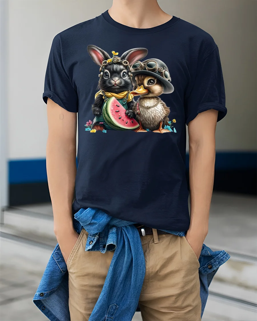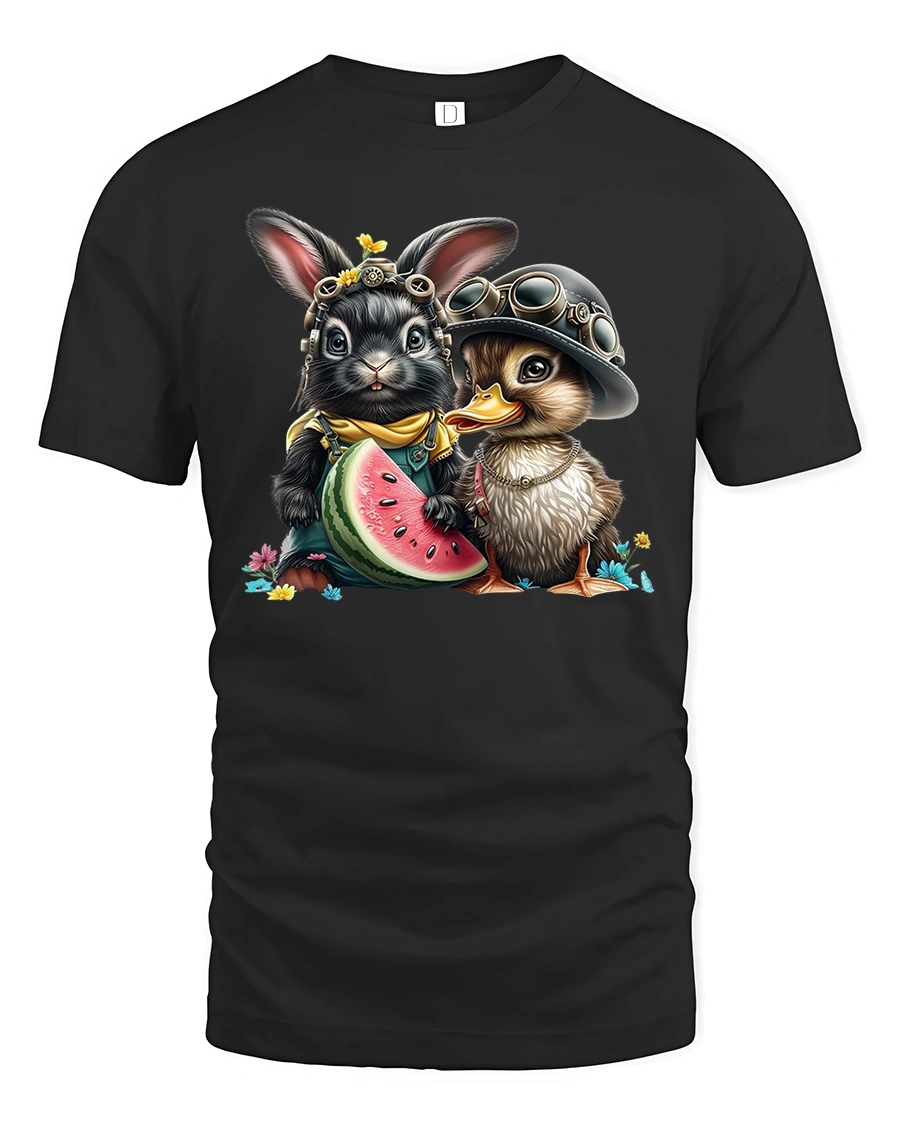 This playful design features a happy bunny and duck duo wearing goggles and hats, sharing a juicy slice of watermelon.