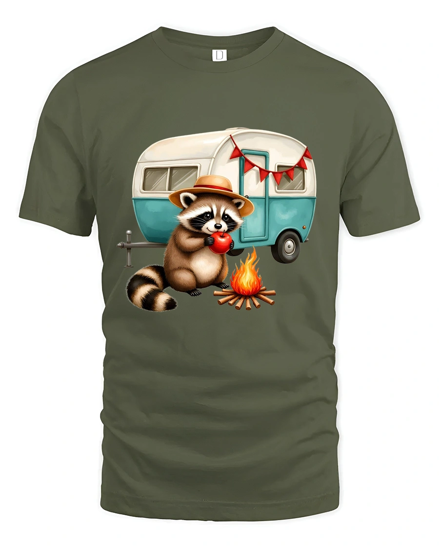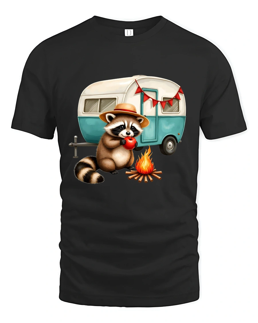 Cute Camping Raccoon Camper Trailer Cozy Adventure Graphic Tee brings a warm and playful outdoor scene to life.