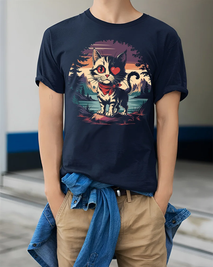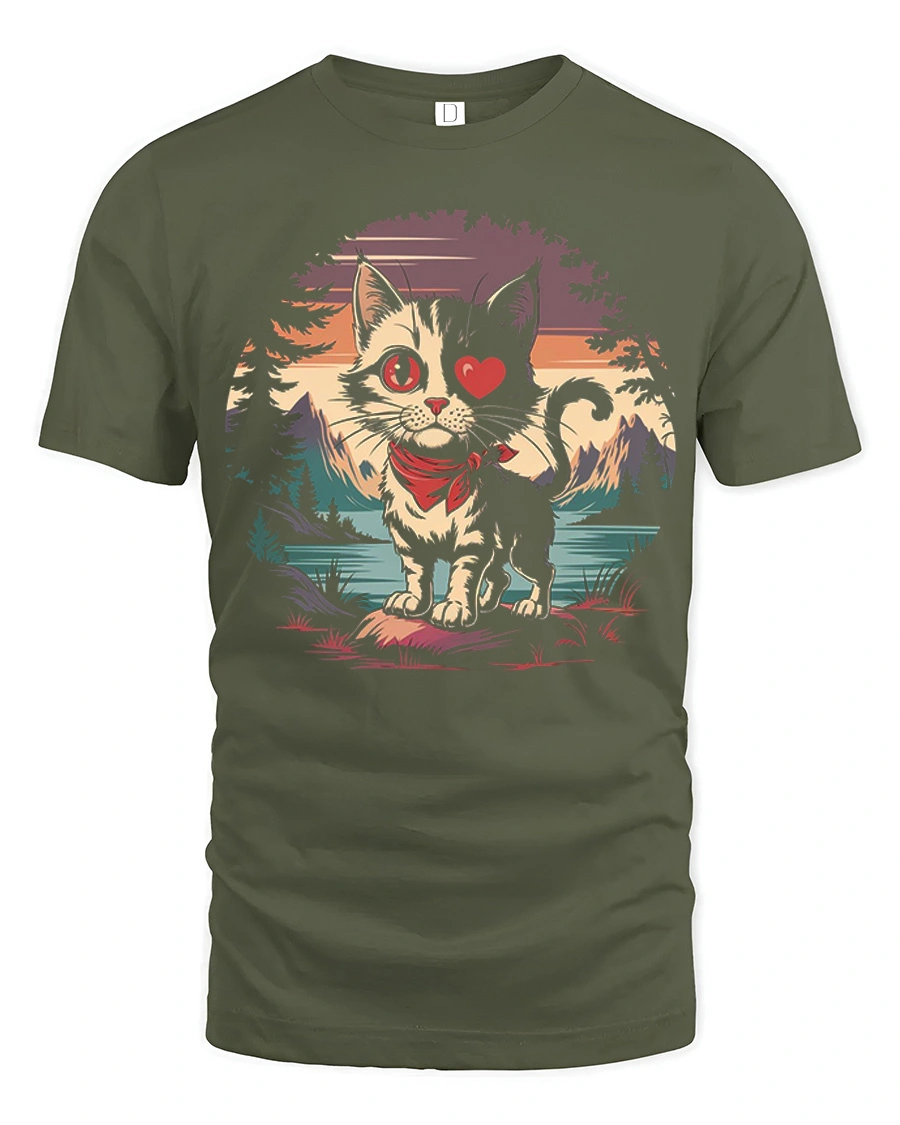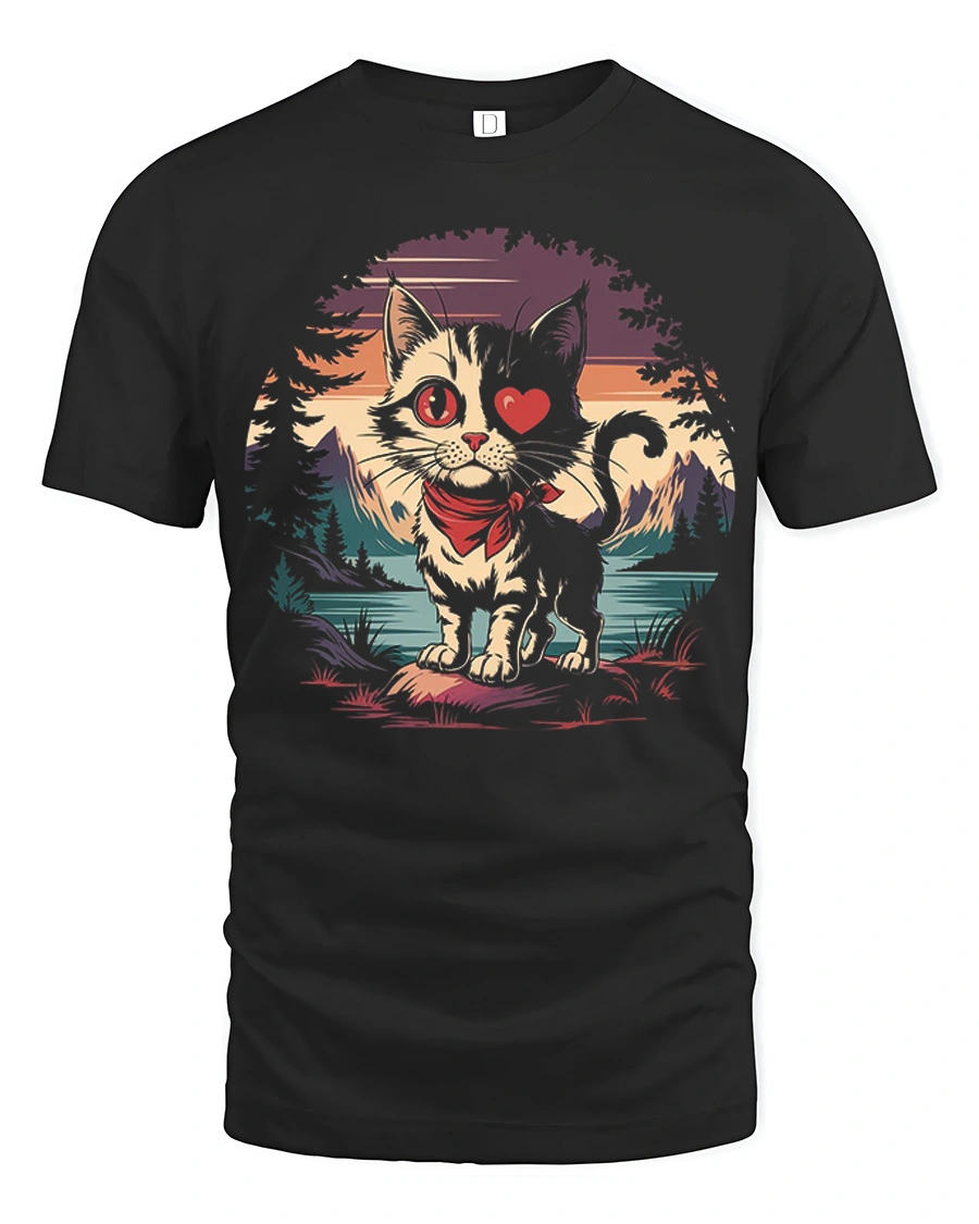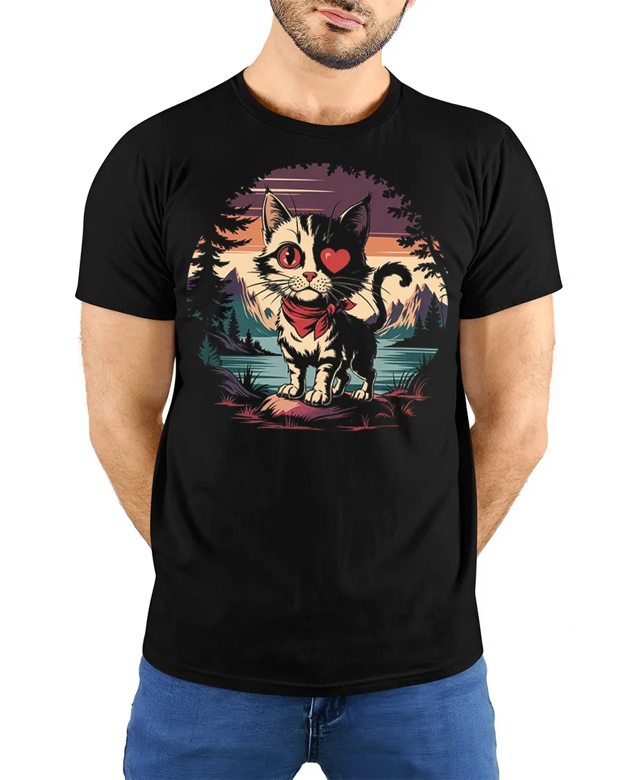 Cute Cat Heart Eye Mountain Sunset Graphic T Shirt adds a playful and heartwarming touch to everyday style.